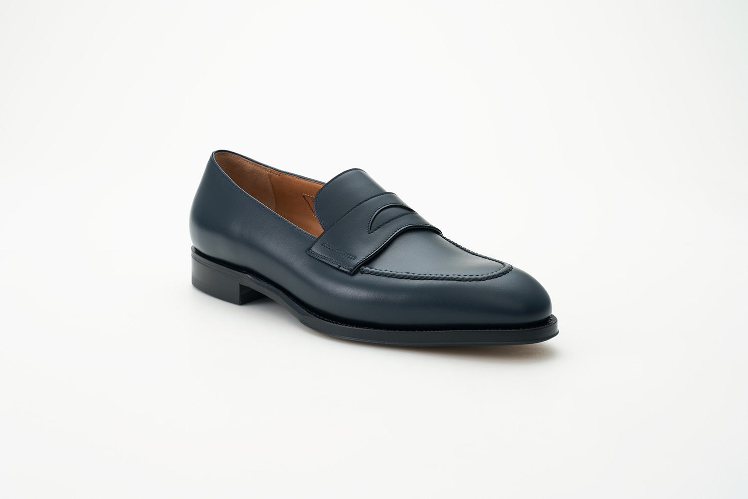 ハンドモカが手の温もりと古臭さを感じさせるローファー。細いトゥに内に入った小さなモカラインは本来スーツにも用いられる英国によく見たスタイルです。甲革はCARL FREUDENBERGから技術を引き継いだポーランドのWEINHEIMER LEDER社のグレイかかったネイビー。落ち着いた色合いから多くのクラシックシューズブランドで使われていました。