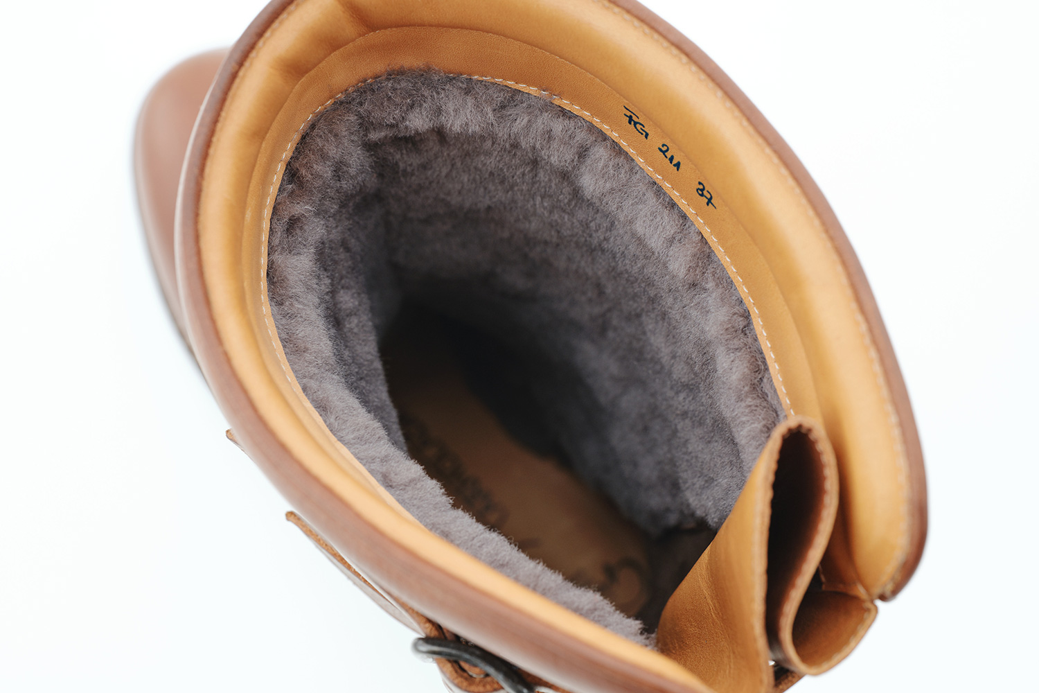甲革に肉厚なベジタブルタンニンレザーを用い、ライニングにはメリノ種のファーを使用しています。