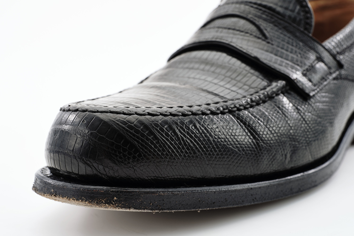 高い技術を有した職人が手裁断で柄合わせしたダイヤモンドパイソン。雨の日でも履いていますが、水染みはできていません。鱗の先は捲れてきますが剝がれることはありません。牛革と同じく屈曲部は裂けてくると思いますが牛革より柔らかく、同等の強度と言われます。特にメンテナンスはしていません。服を着た後で困った時に便利な一足です。