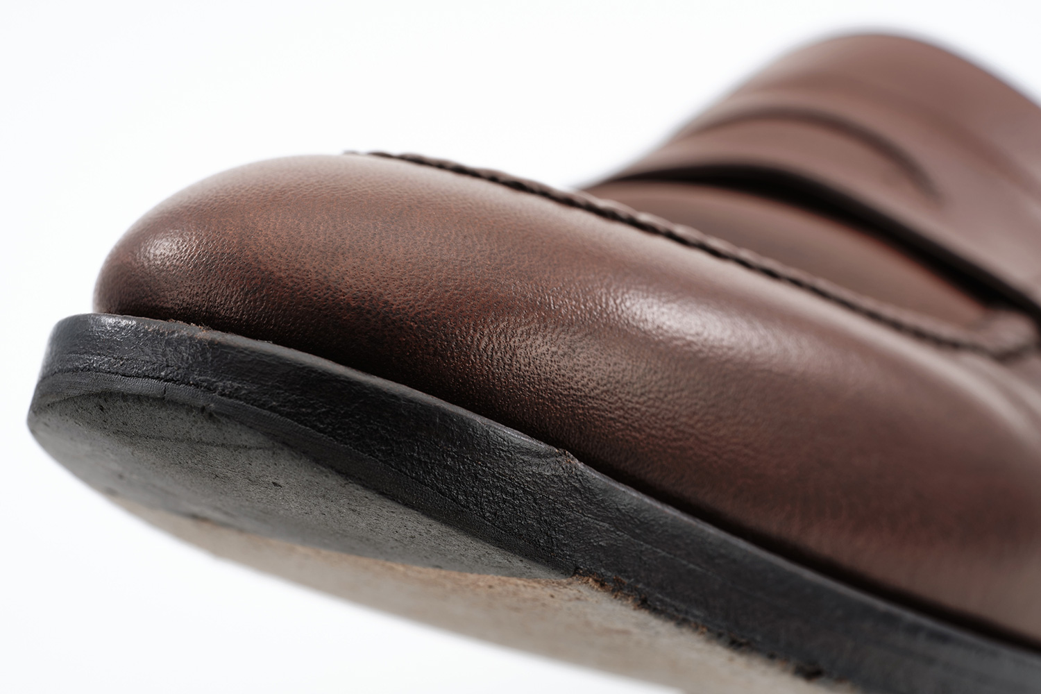 製法に影響されるソールの返りはボロネーゼ→マッケイ→G.Y.→ノルベの順に硬くなります。返りの硬い靴には靴下を履くことも1つのスタイルとしてお勧めしています。