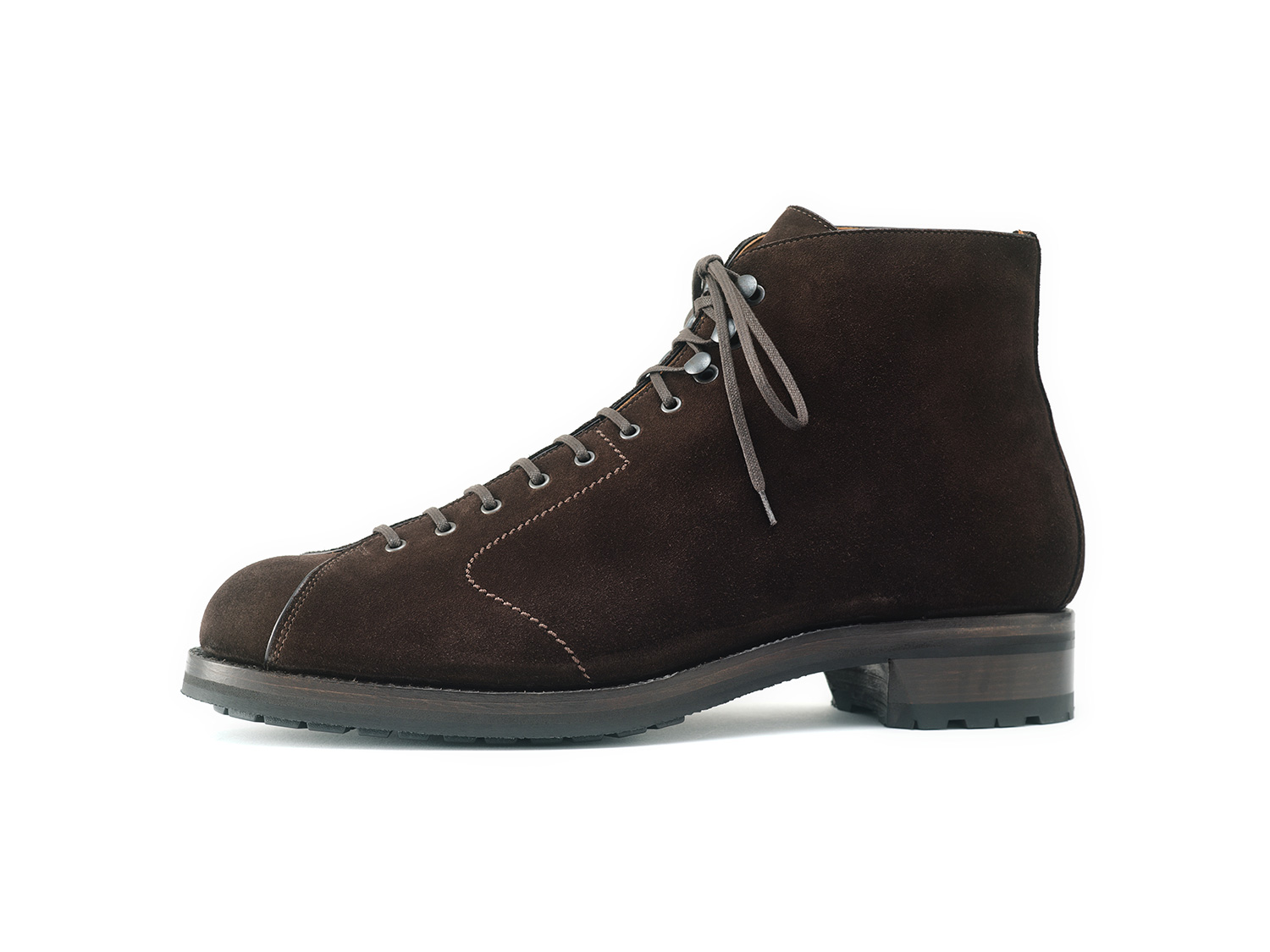 羽根の空きが狭いイタリア軍のブーツからイメージしたスタイル。毛足が短く揃ったスポーティなサーフェイスのSUPER BUCK/ Charles F Stead社(英)は牛スエードながらも発色が良く丈夫な革です。九分仕立て+VIBRAMソールとの組み合わせは現代のタウンユースに適した一足です。