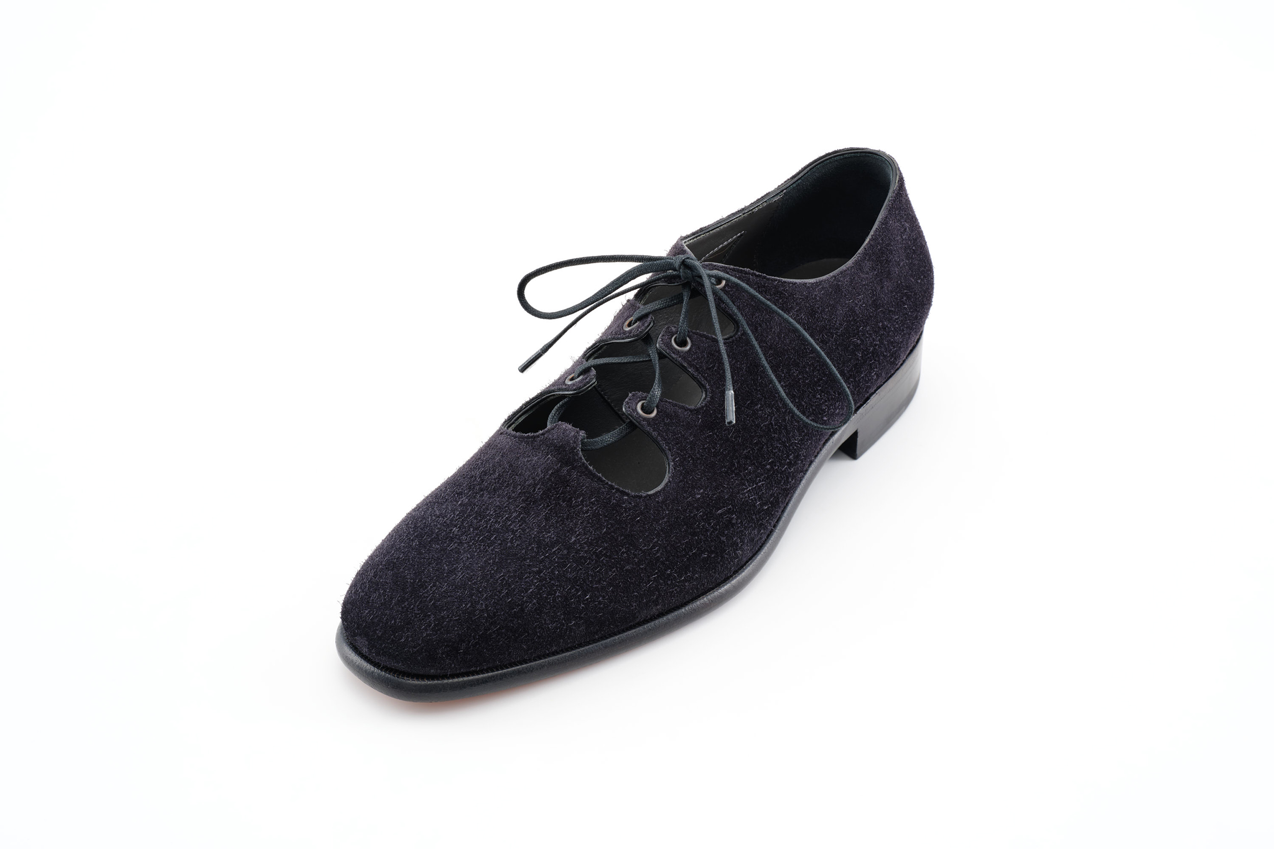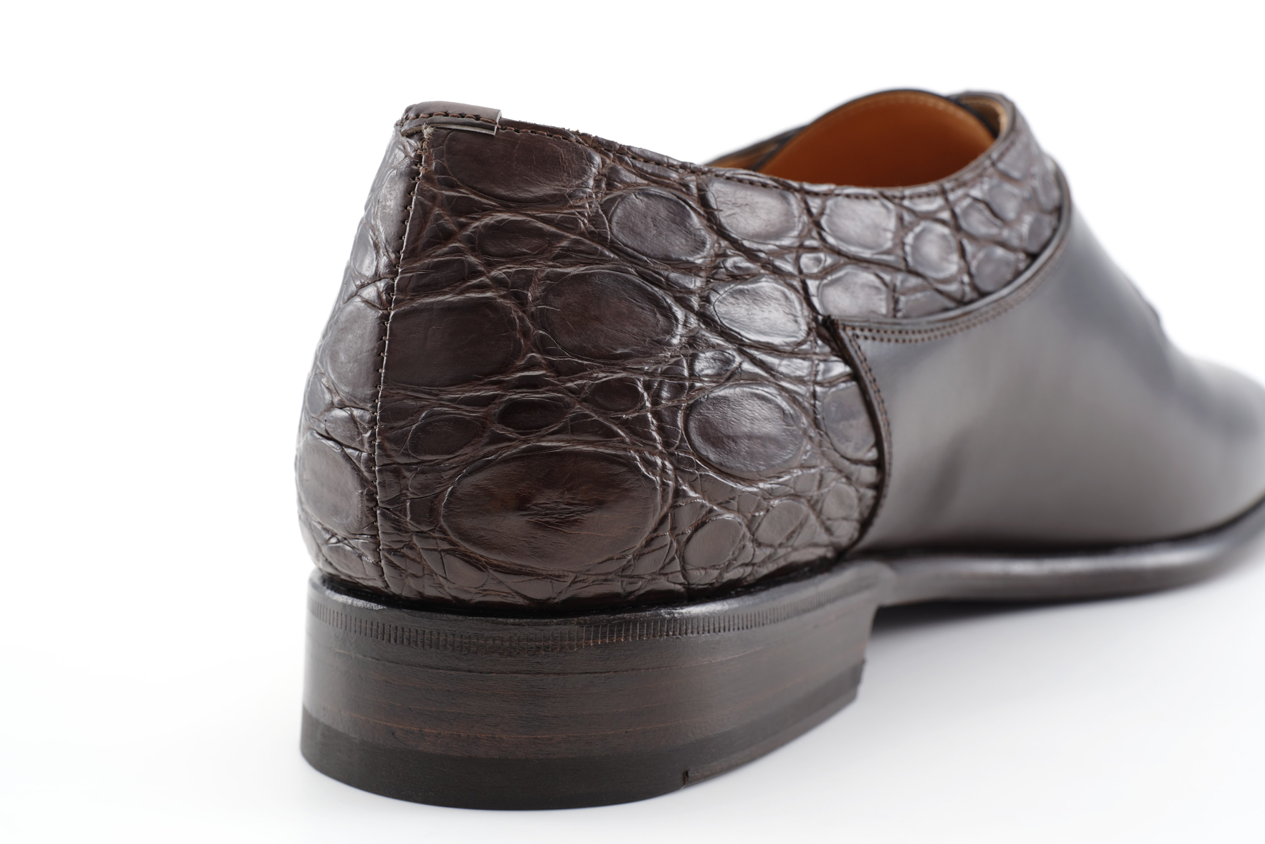 主張し過ぎない配置のワニ革がポイントのオックスフォード。カイマンワニの腹面は石灰質が溜まりやすいために脇腹の丸斑部分を主に用います。マッケイ製法で薄くシャープなトゥに仕上がっています。