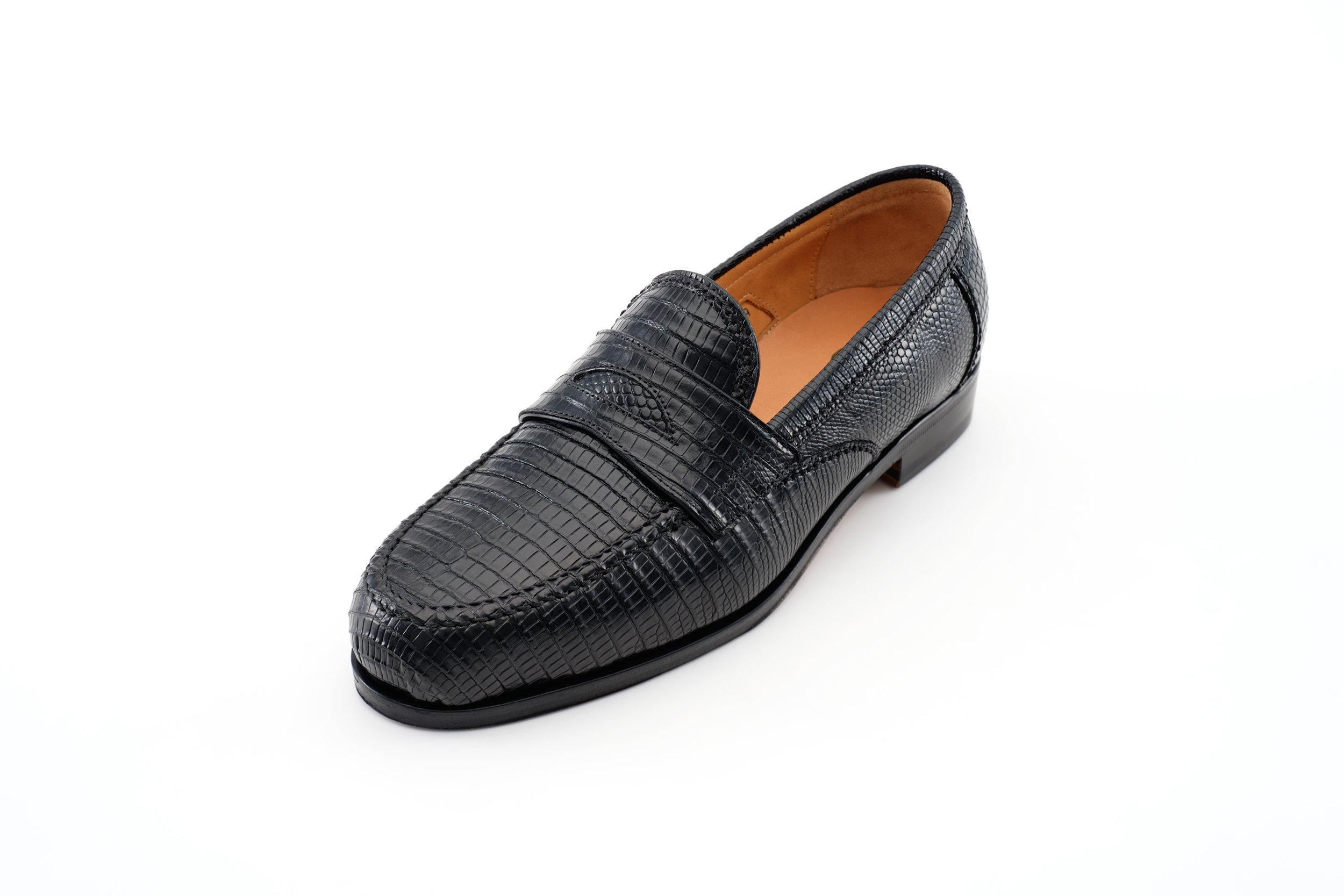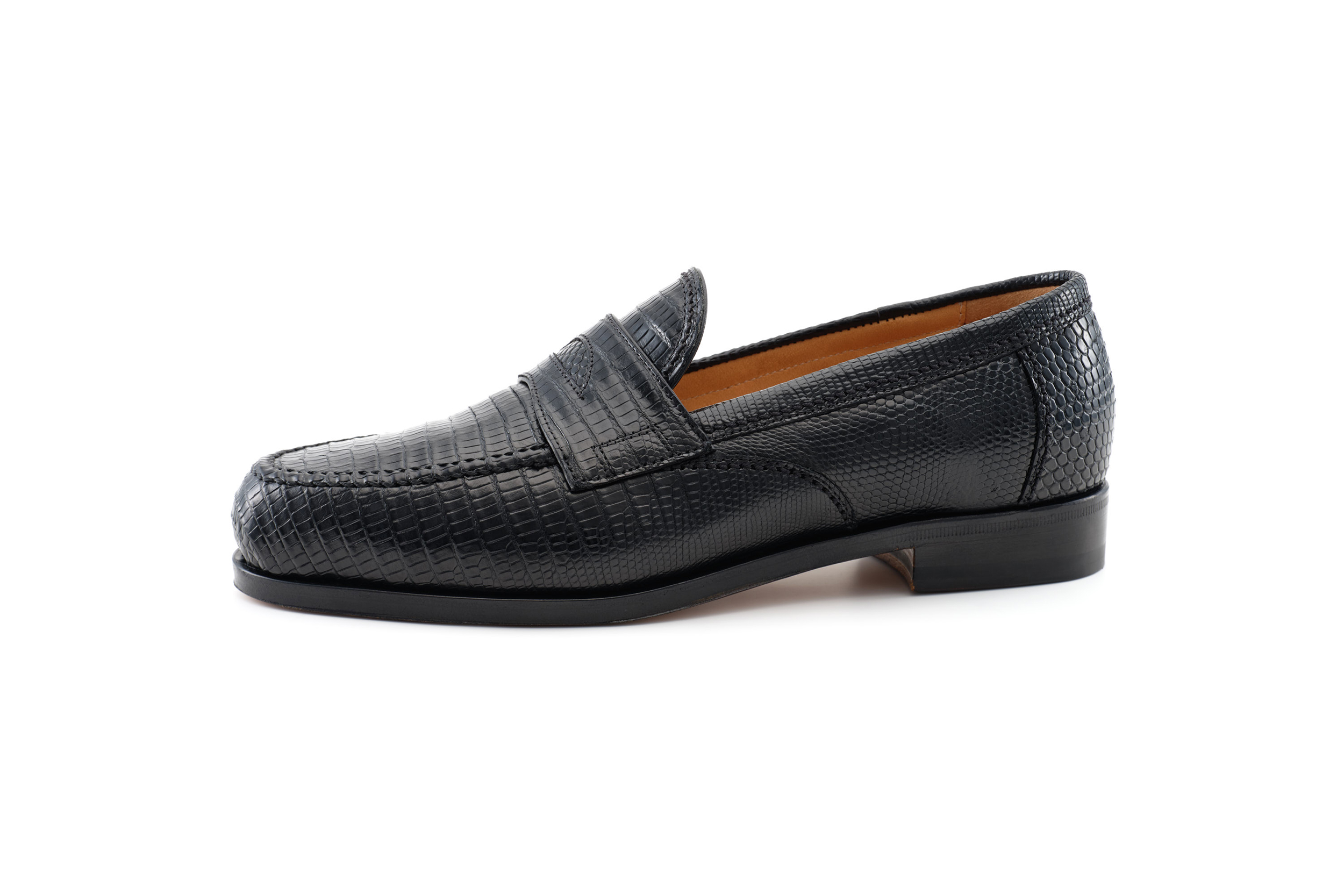 トカゲの柔らかい腹面を甲革に用いたローファー。透明感のある四角い腑が特徴で、片足に1匹を使用しています。レディースはマッケイ製法とハンドソーングッドイヤーがあります。