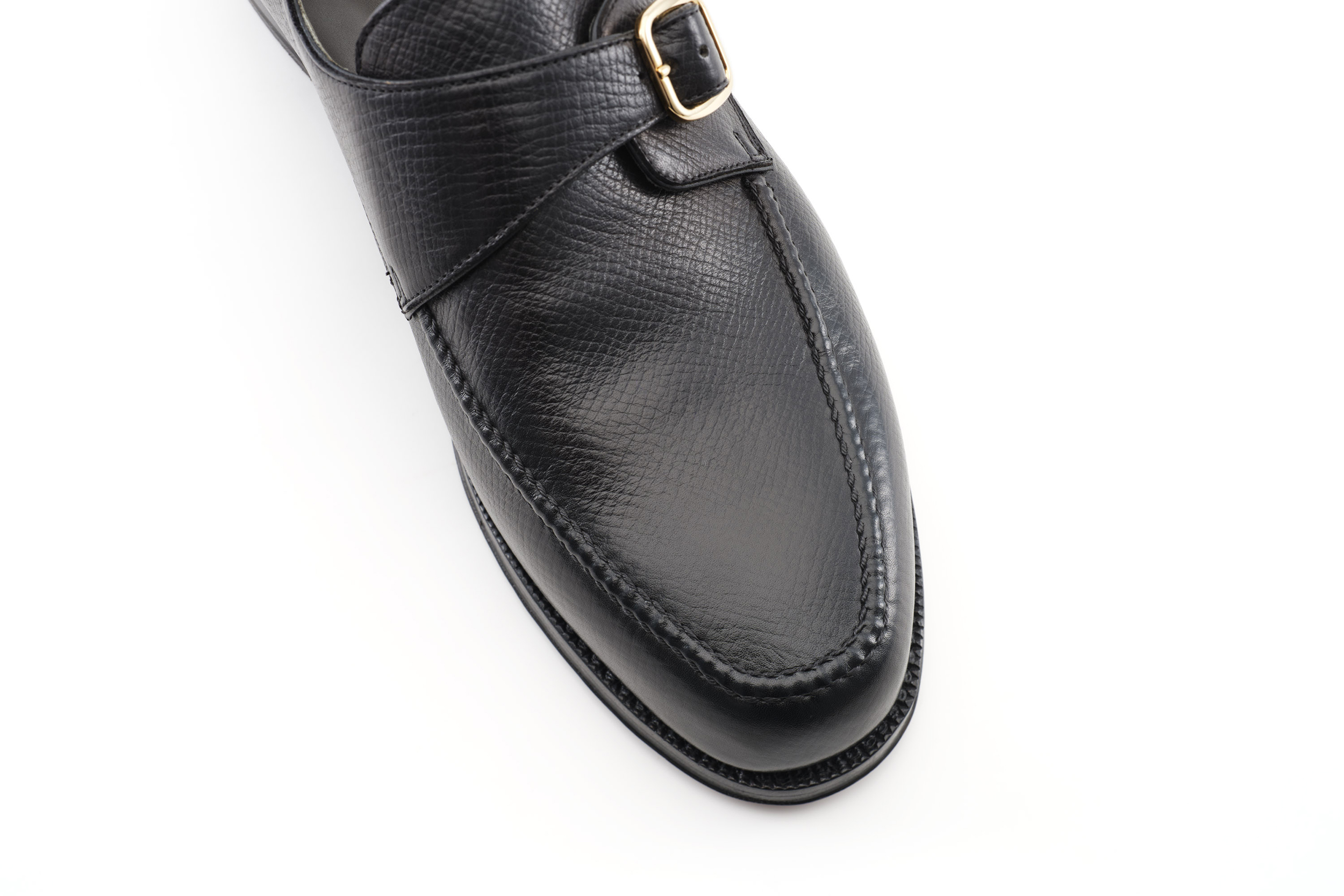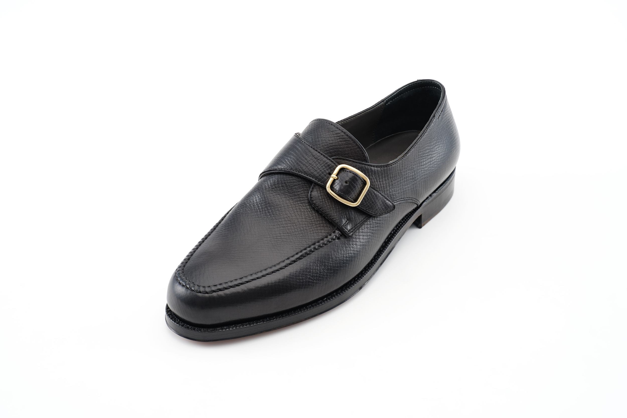 ハンドモカが温もりと古臭さを感じさせるモンクローファー。甲革のフランスHAAS社の型押しカーフが柔らかい仕上がりです。木型を入れた状態で掬い縫いされたモカは高級感が漂います。