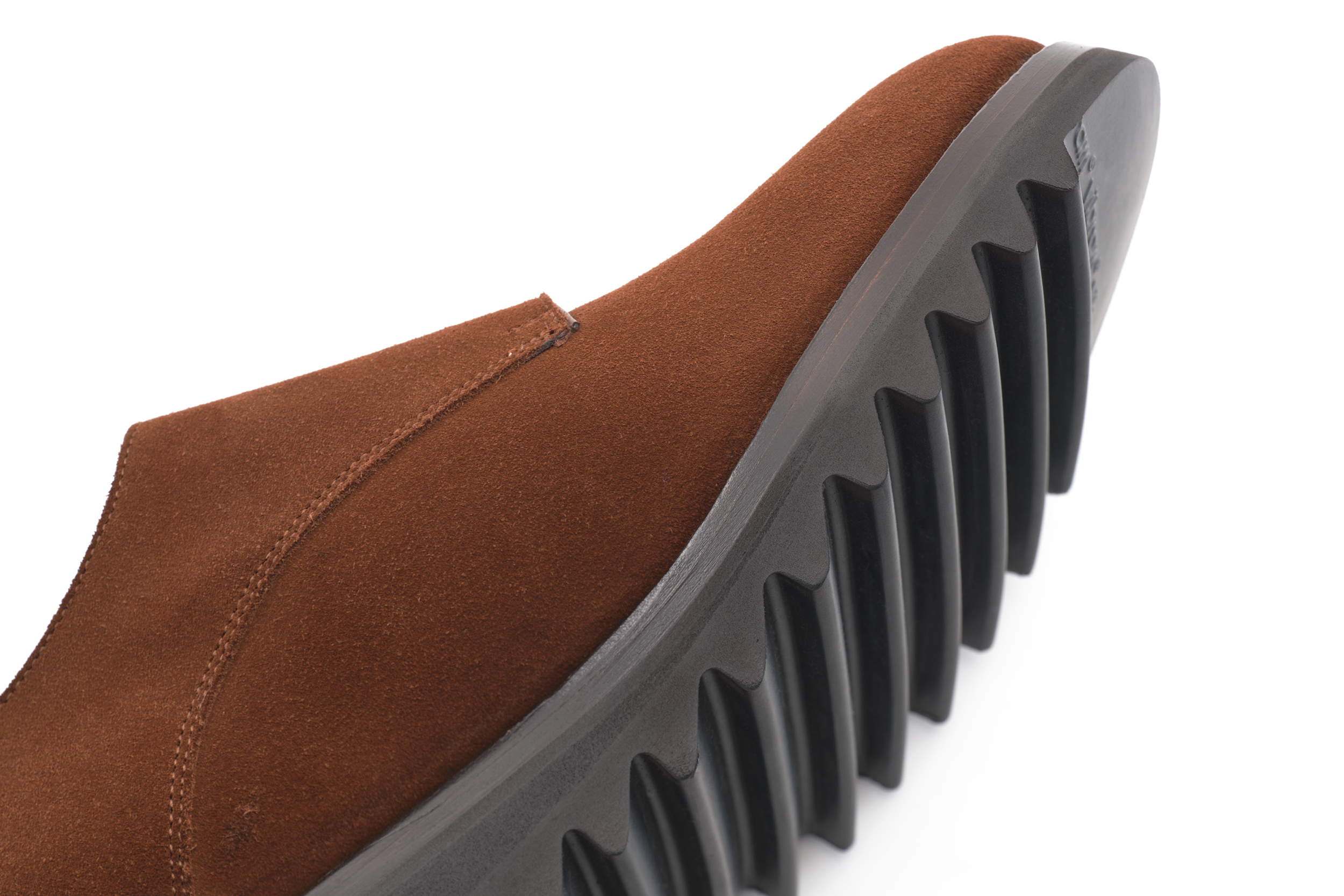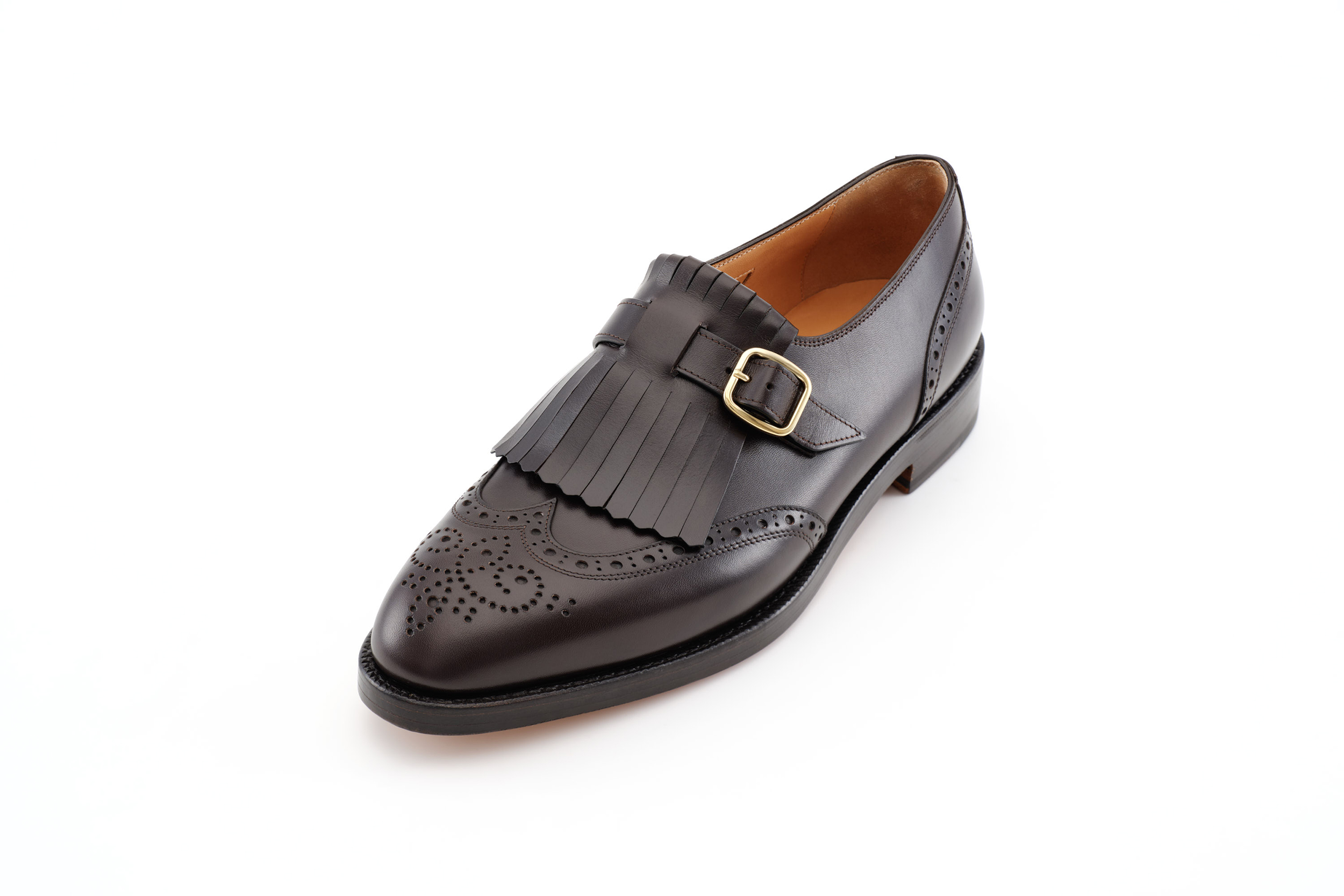 ウィングチップ、キルト、モンク、ダブルソール、と盛りだくさんのディテール。キルトの下にエラスティックを配したスリップオン仕様です。