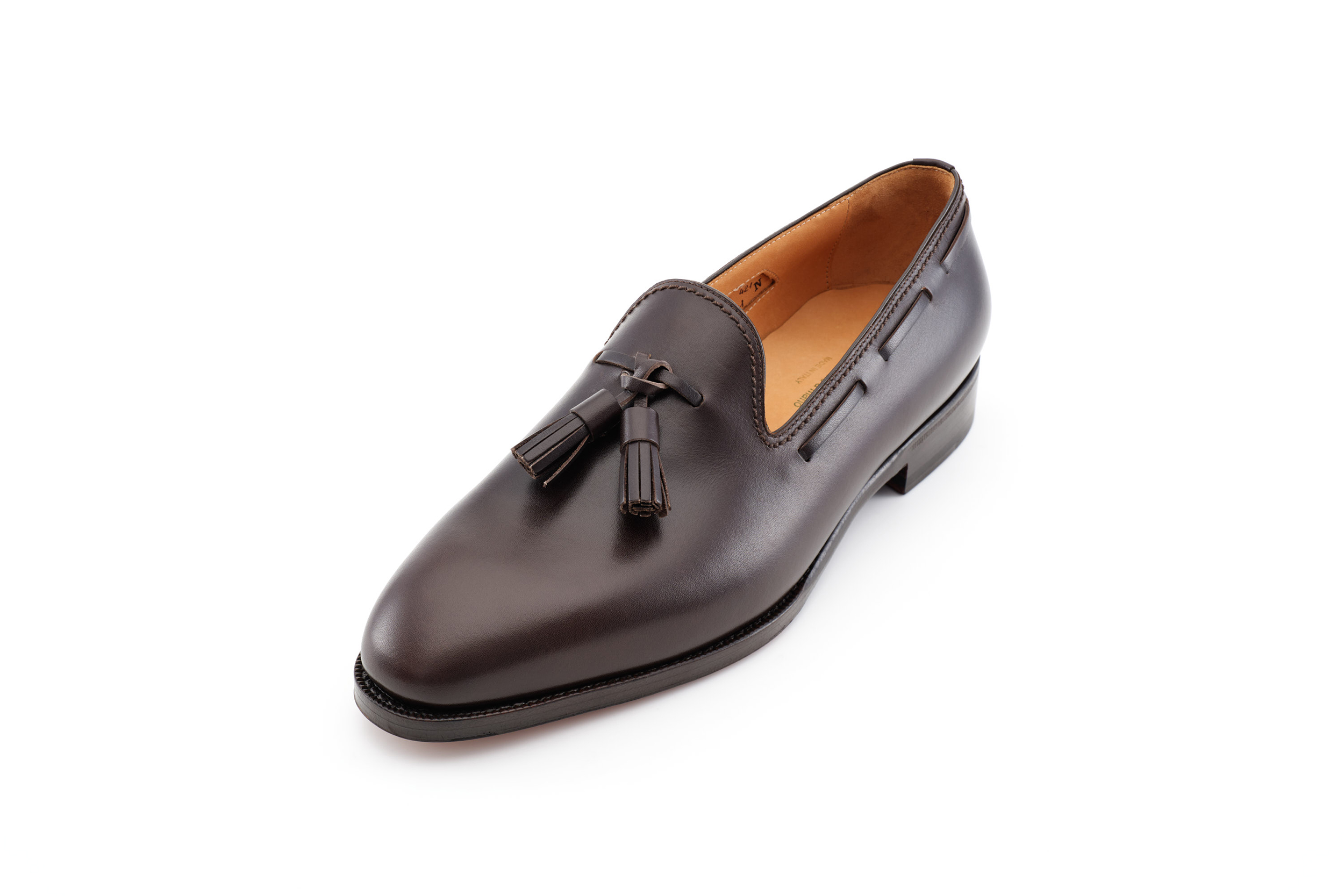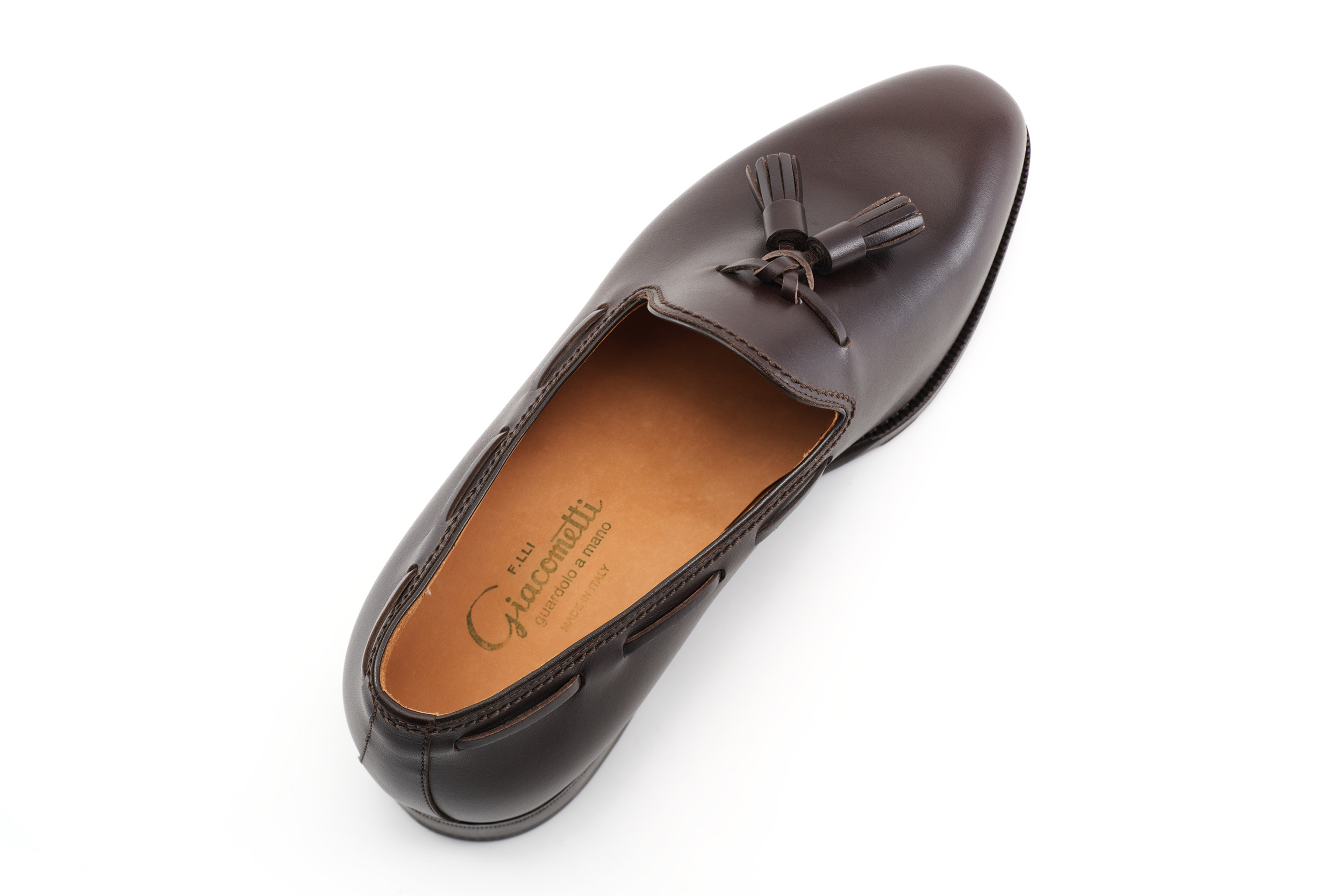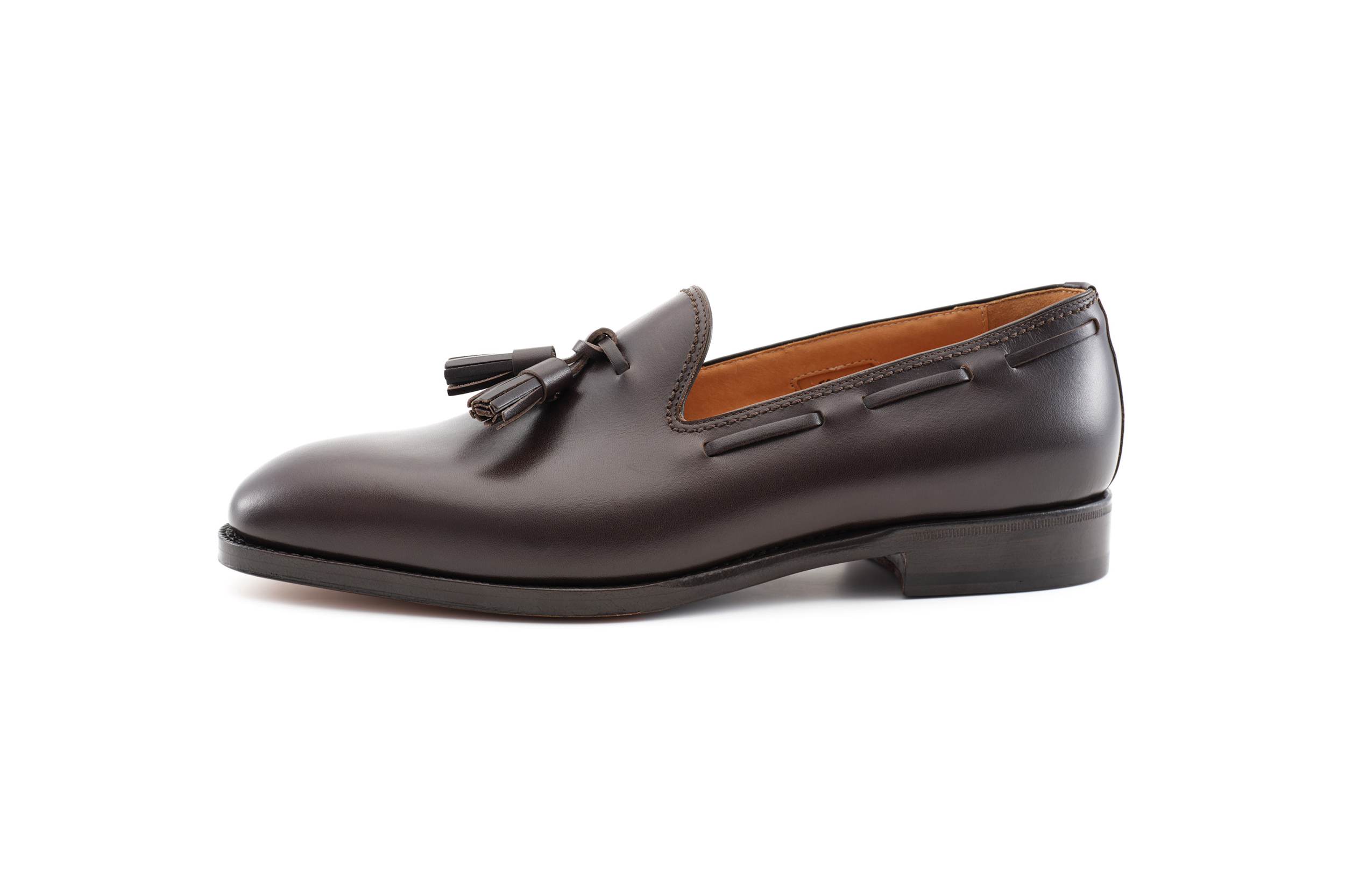フレンチカーフを革の取り効率の悪いタッセルを用いたワンピーススリップオン。シンプルかつエレガントで合わせやすいスタイル。