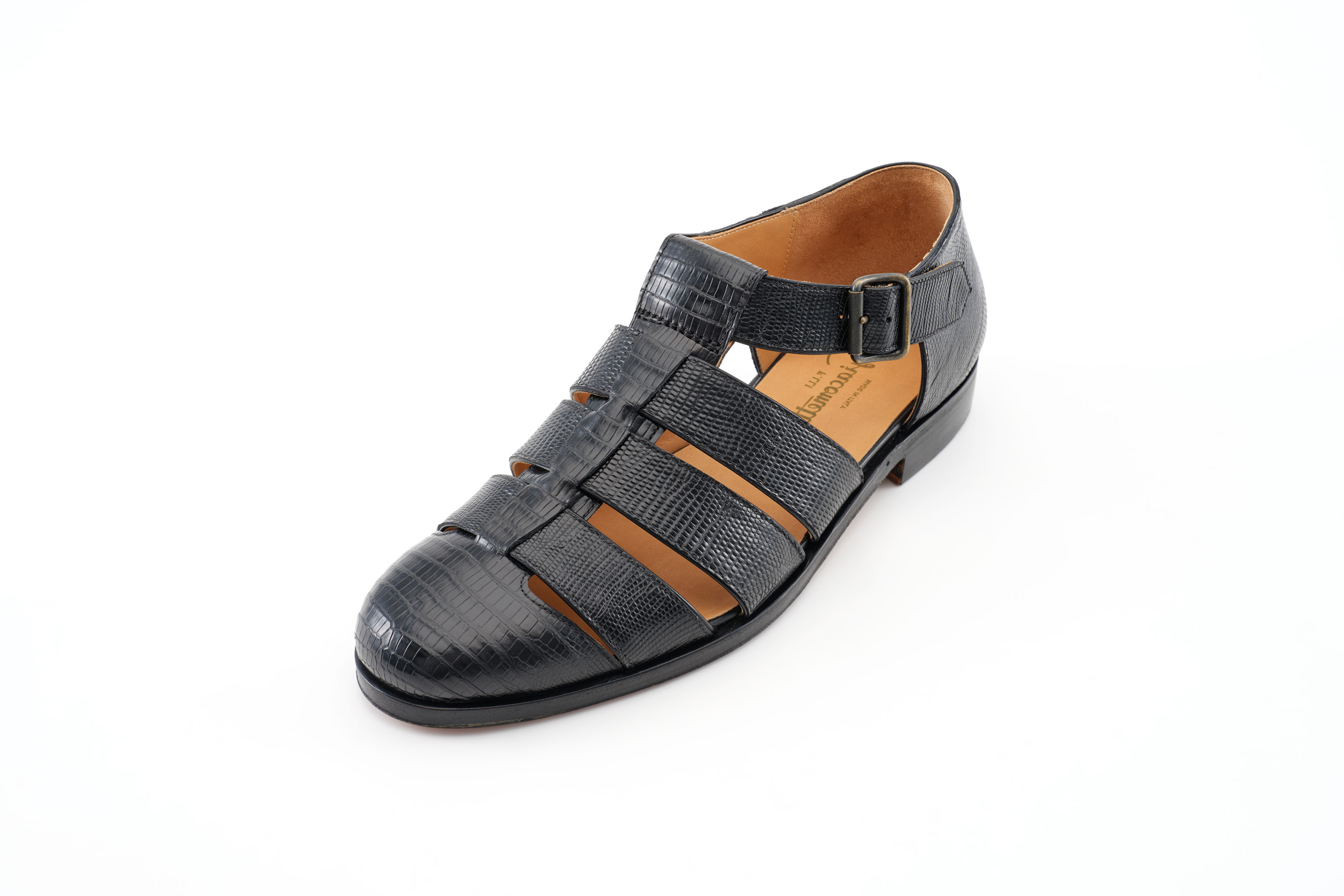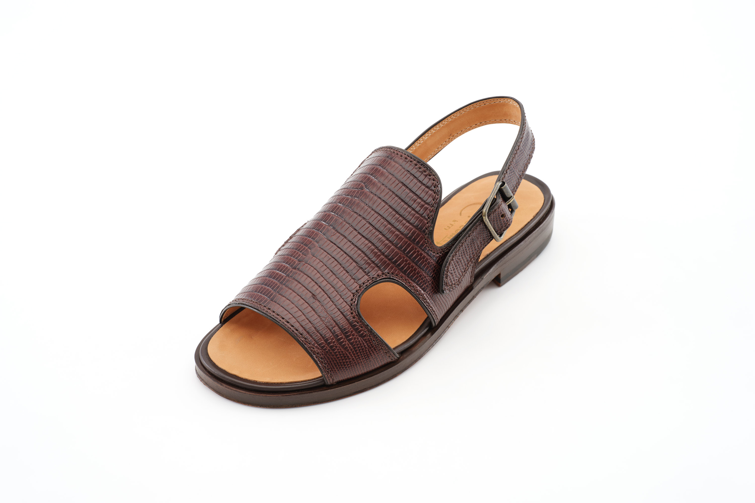オープントゥ+バックストラップ、夏に向けたスタイルです。バックストラップがソックスとの相性を良くしています。腹面の透明感が有る大きな四角い斑のトカゲ革を片足に1匹使用しています。