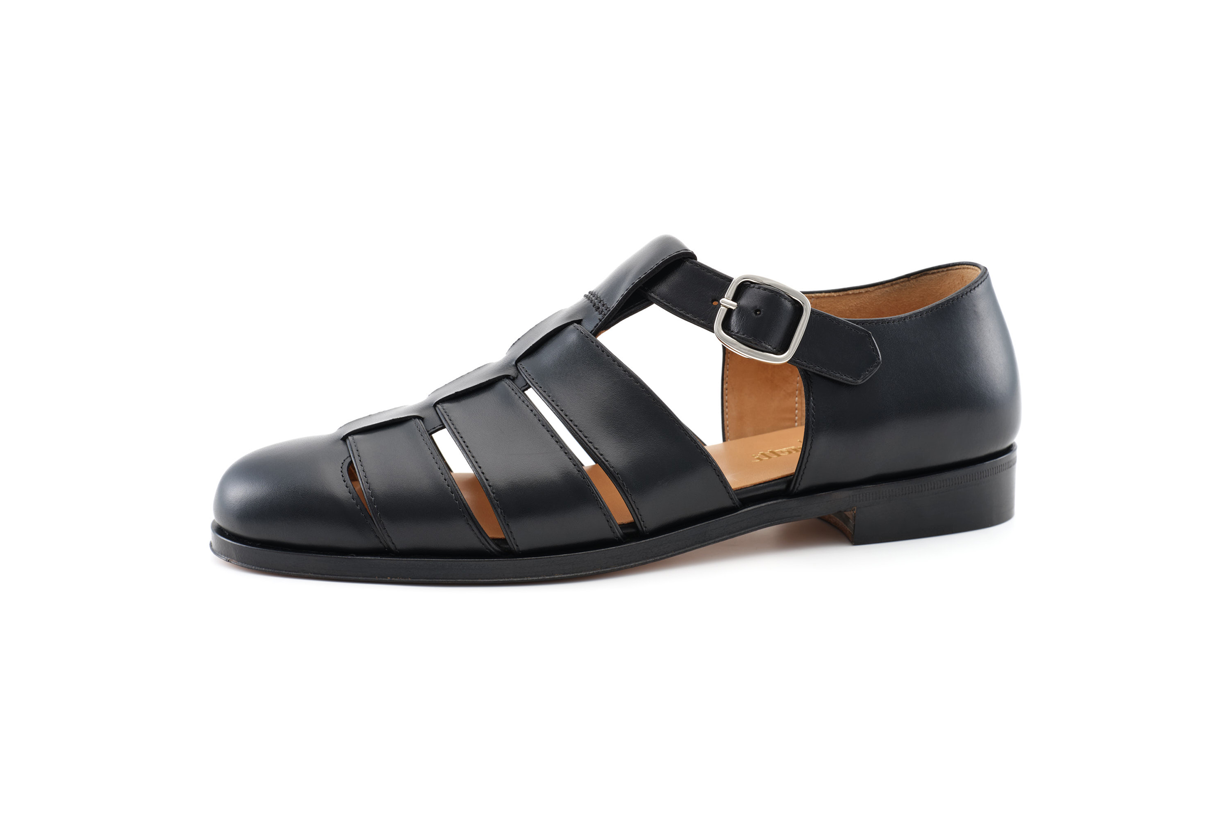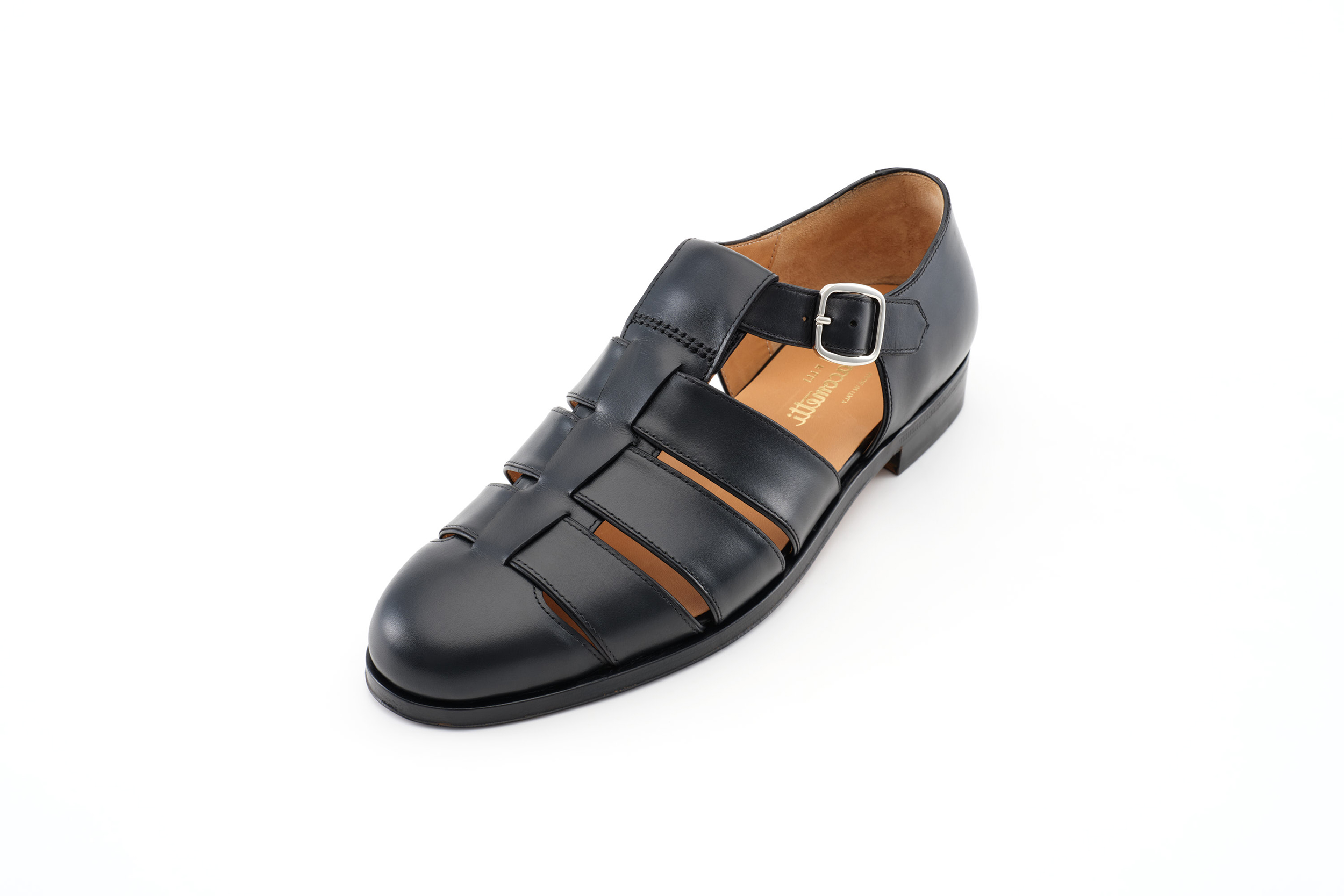 武骨且つ機能美の軍靴に華奢でエレガントな仕立てを用いたスタイルは長い年月を経た現代においてトラディショナルなスタイルとして認知されました。先芯を入れた爪先、トップラインのベルトループ形状、フランス原皮ハイメゾン傘下のフレンチカーフ、カンガルー革が覗く甲革切り口、革の積上げが美しい底回り、メンズ同様のF.LLI Giacomettiグルカサンダルスタイルです。