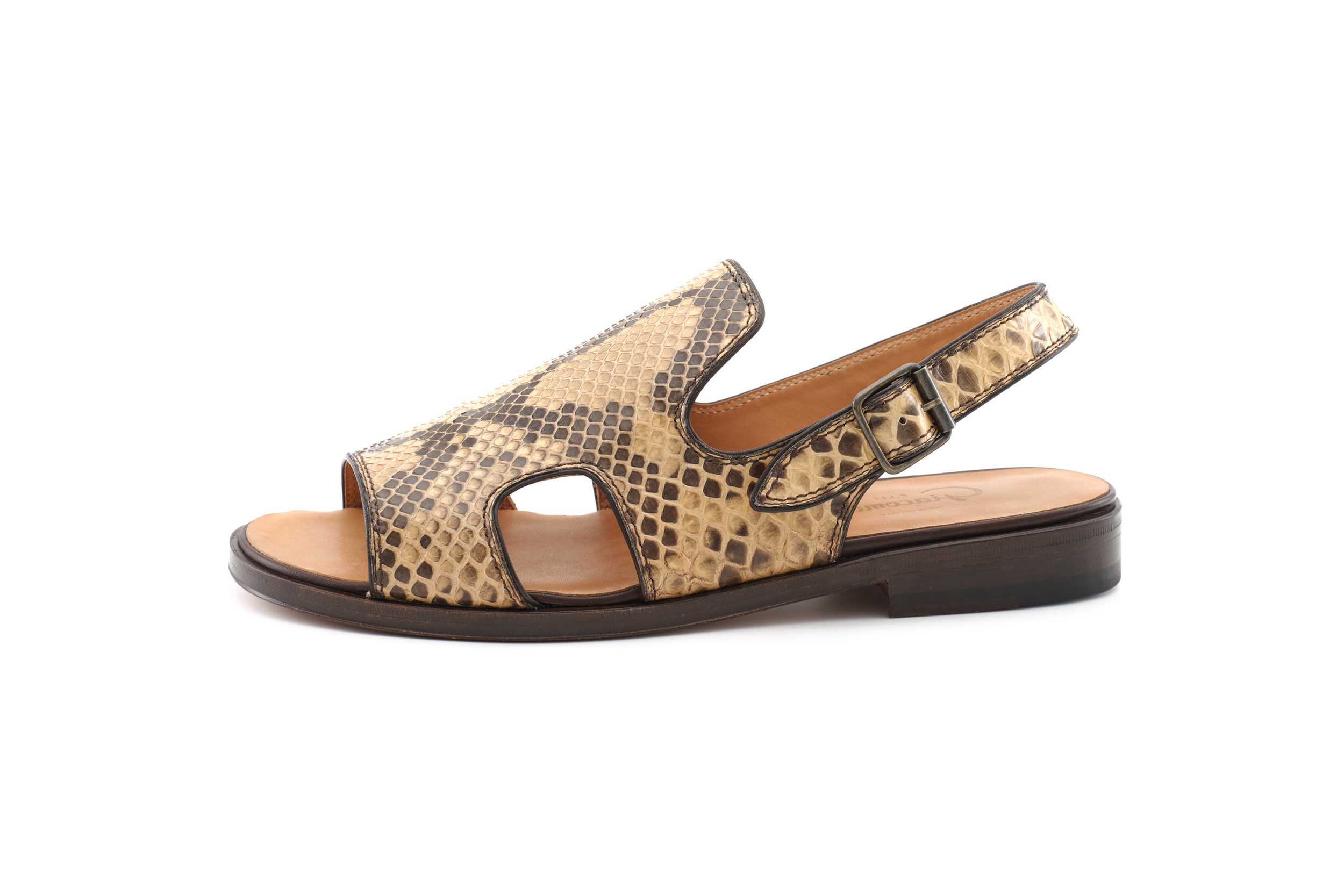F.LLI GiacomettiのグルカサンダルをOpen toeに改良したモデルです。革の切り口のカンガルー革が伸び止めの役目と共に、仕立て映えにも一役買っています。同じ柄が存在しない3-5mのダイヤモンドパイソン革を熟練した職人が一足の仕上がりが揃うように手裁断しています。