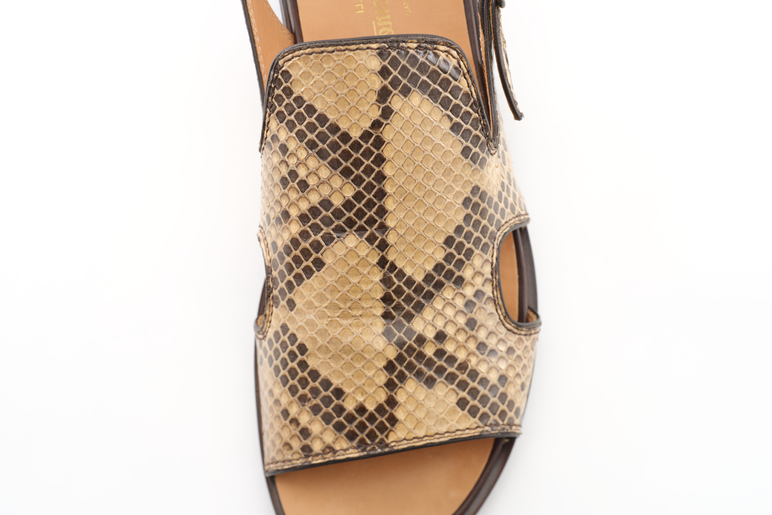 職人が手裁断で柄合わせしたフロントカットダイヤモンドパイソン革のスリングバックサンダル。同じ柄が存在しない3-5mのダイヤモンドパイソン革を熟練した職人が一足の仕上がりが揃うように手裁断しています。