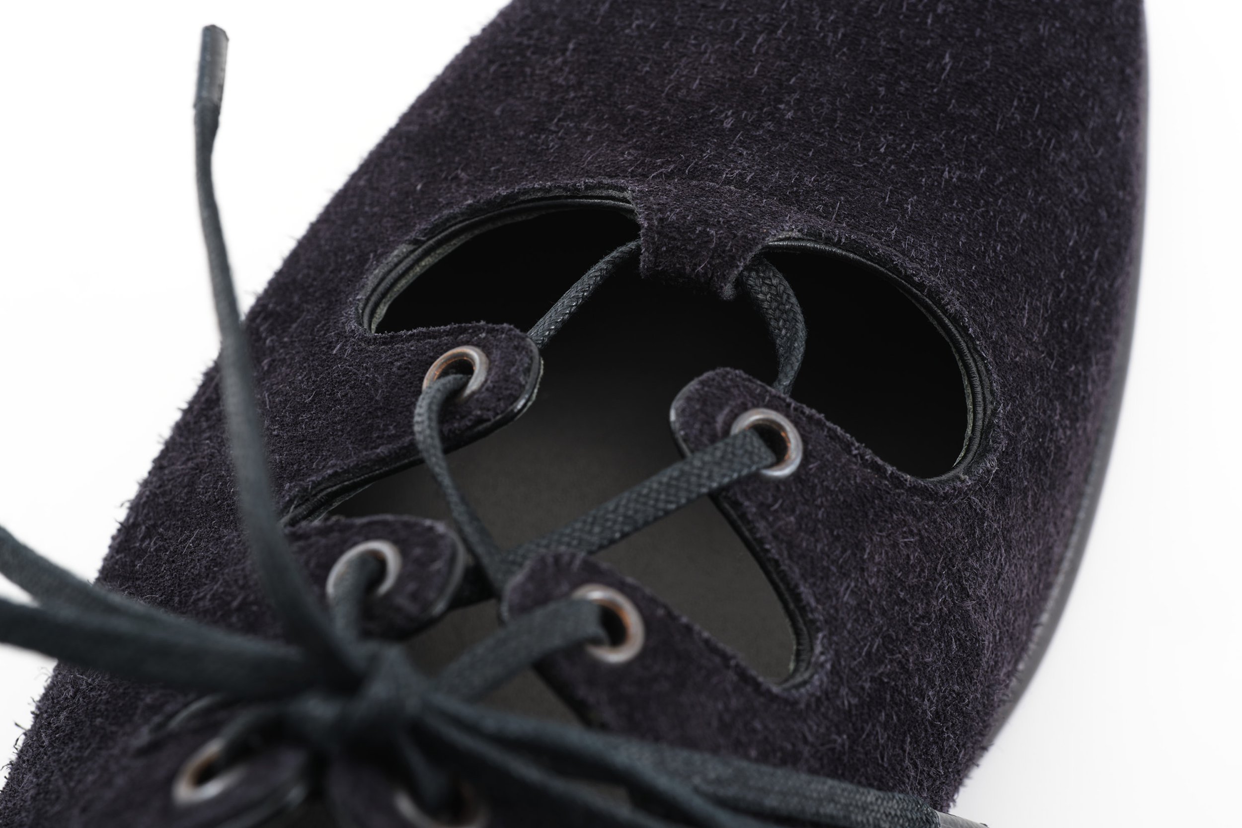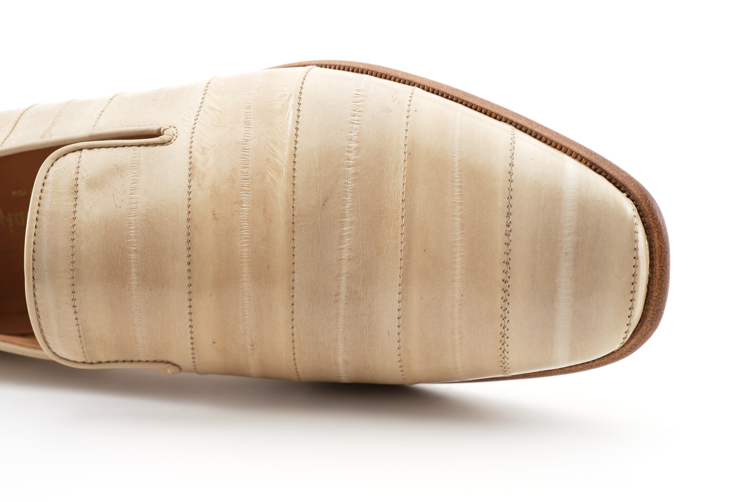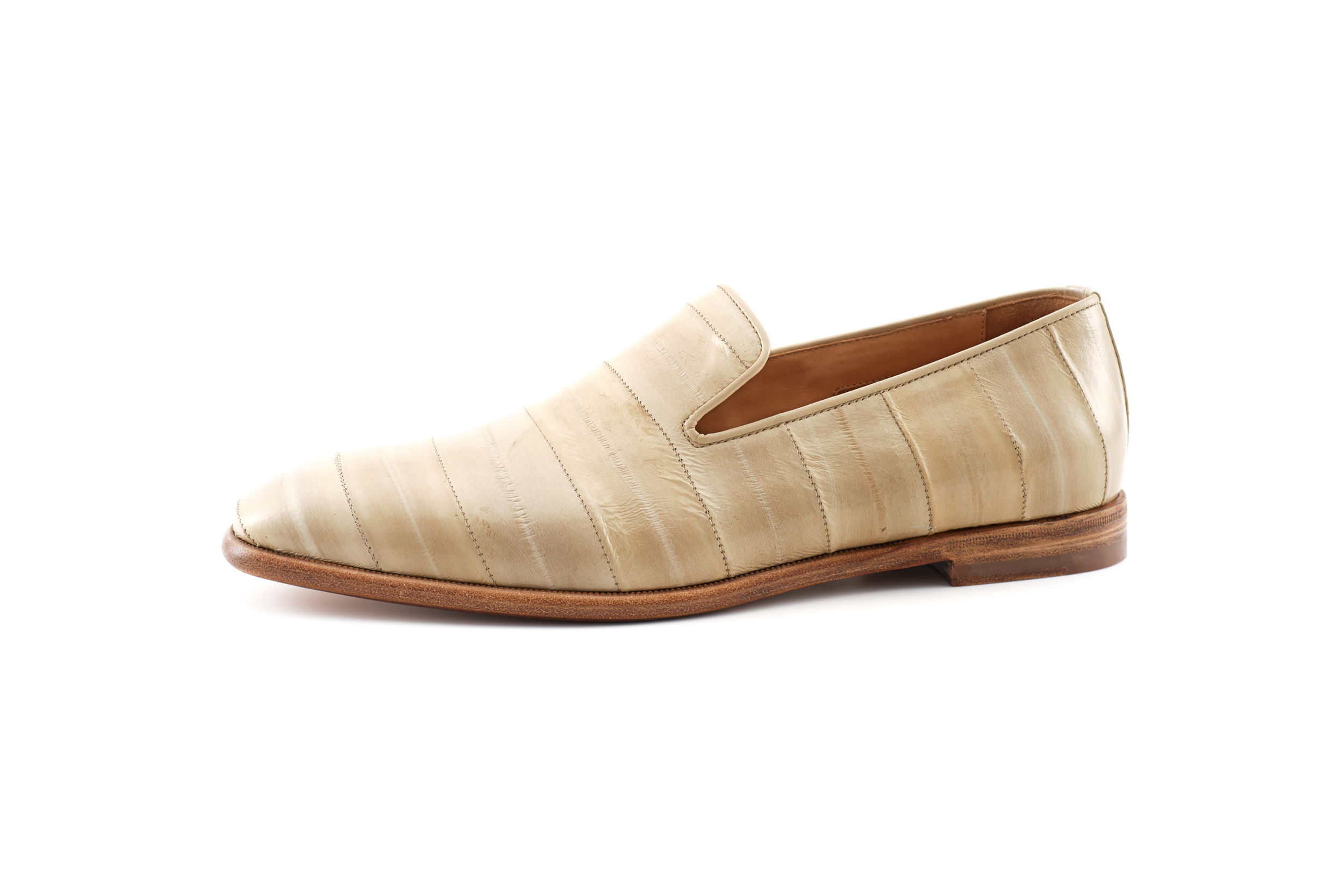 ウナギ革の形状と艶を活かしたトップラインの高いスリップオン。ボーダー状に接がれた革はウナギならではのスタイルです。