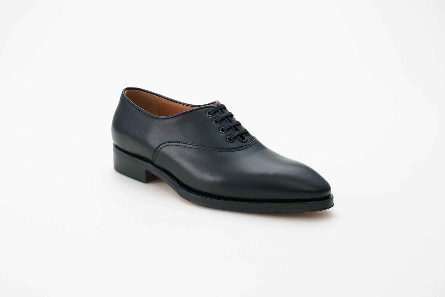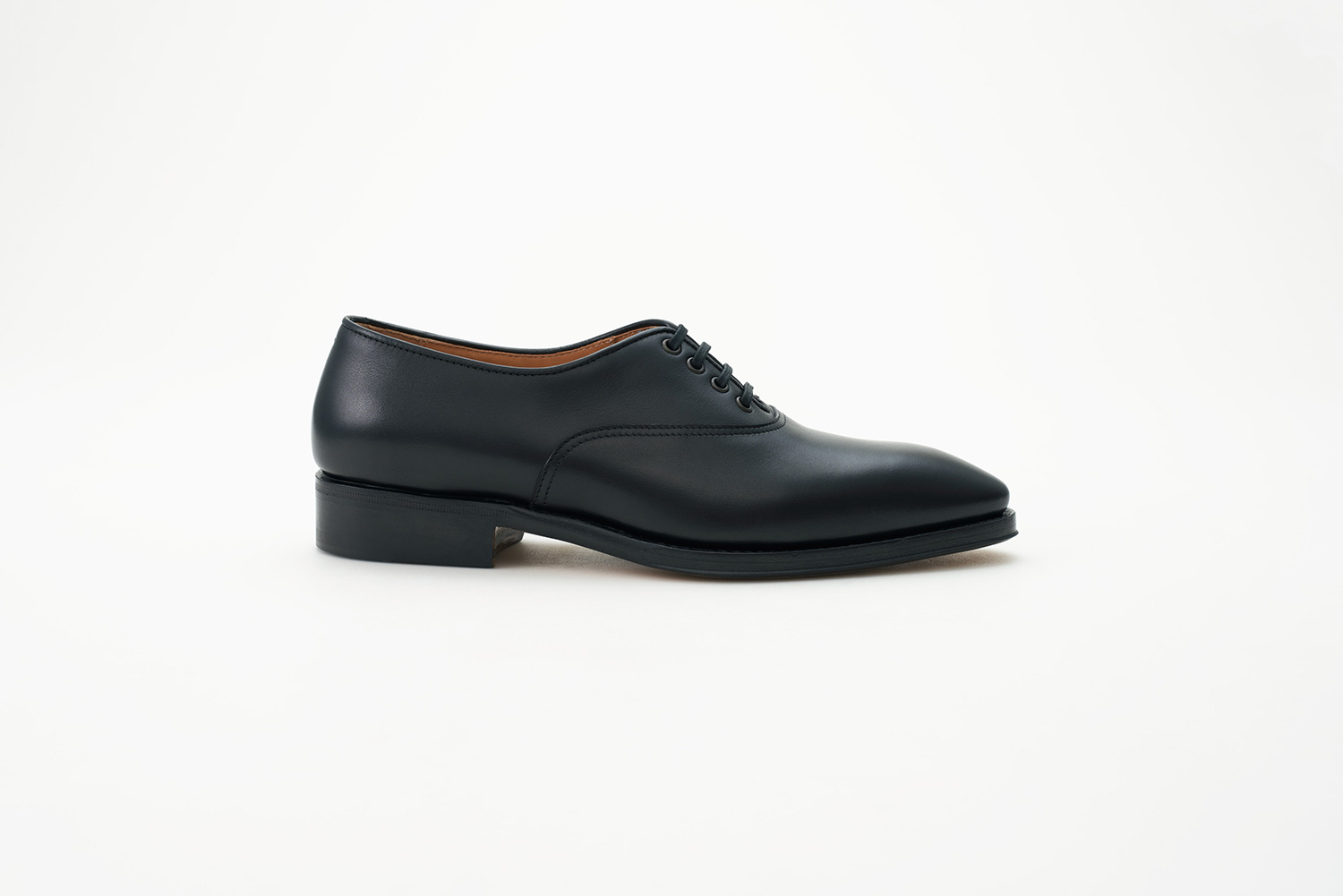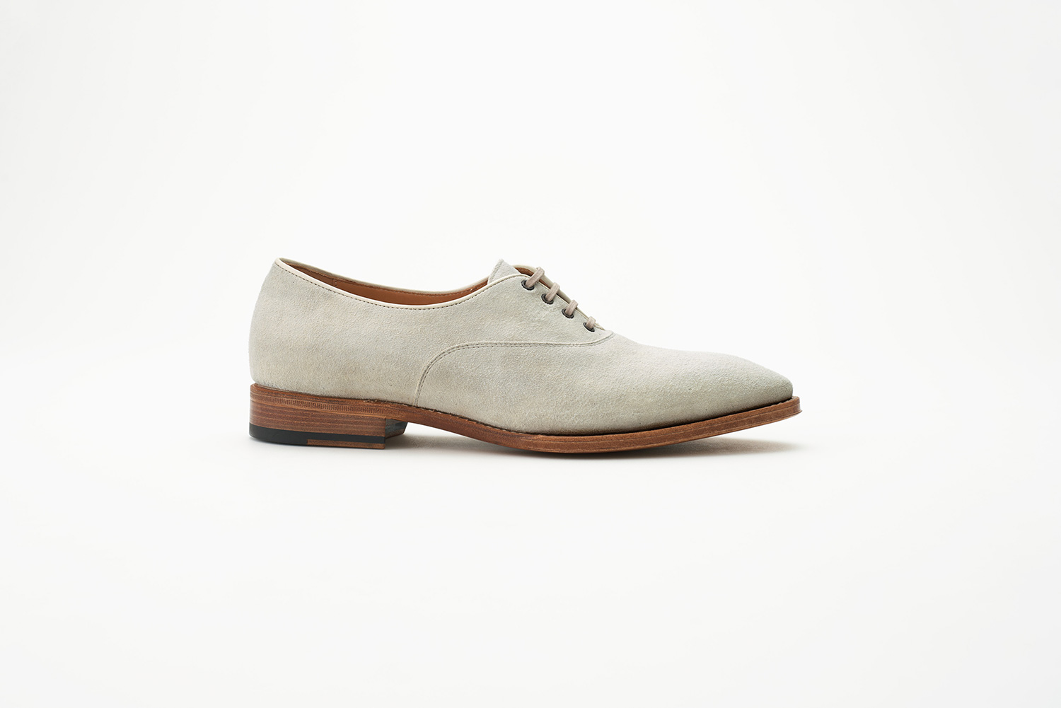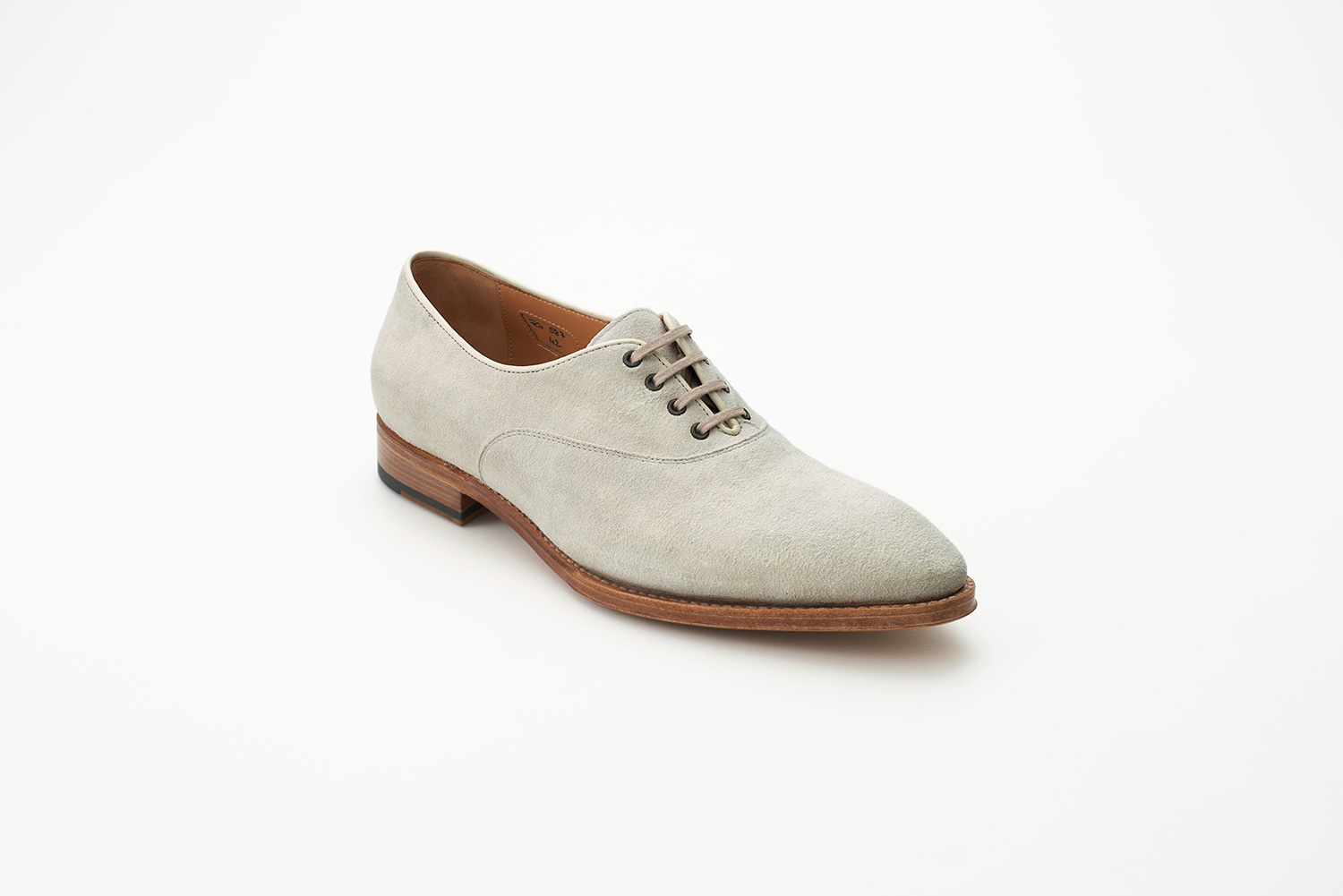 トップラインの低い、クラシックなテニススタイル。よりスポーティーな仕上がりを狙って玉縁の仕様を用いています。足をスマートに見せる、ハンドメイドならではの人間の足に沿った内振り設計の木型です。