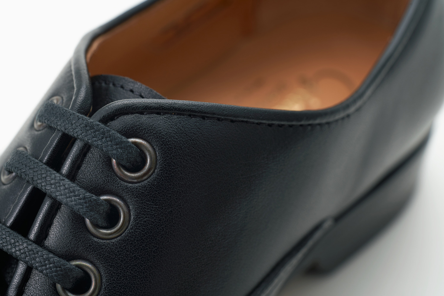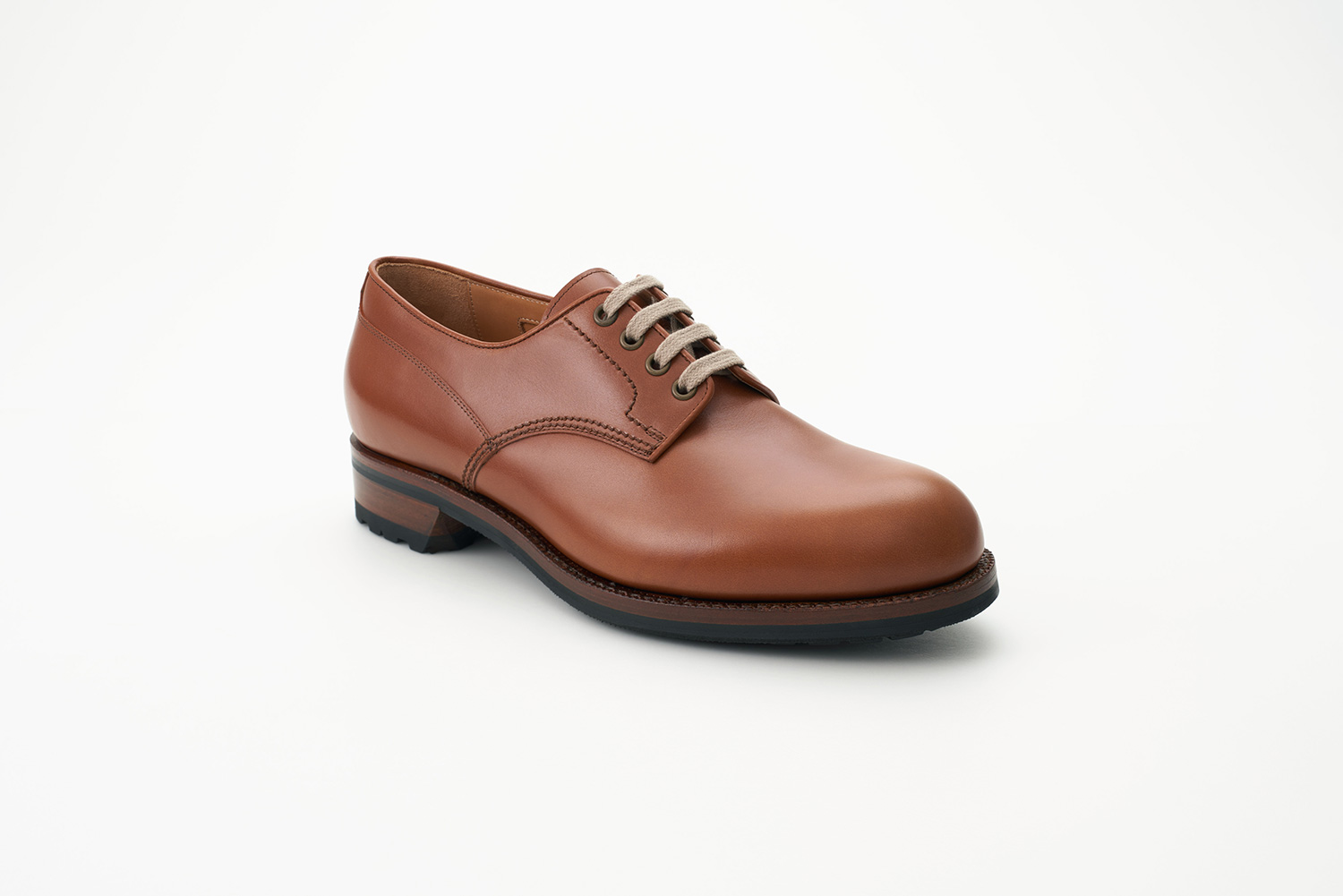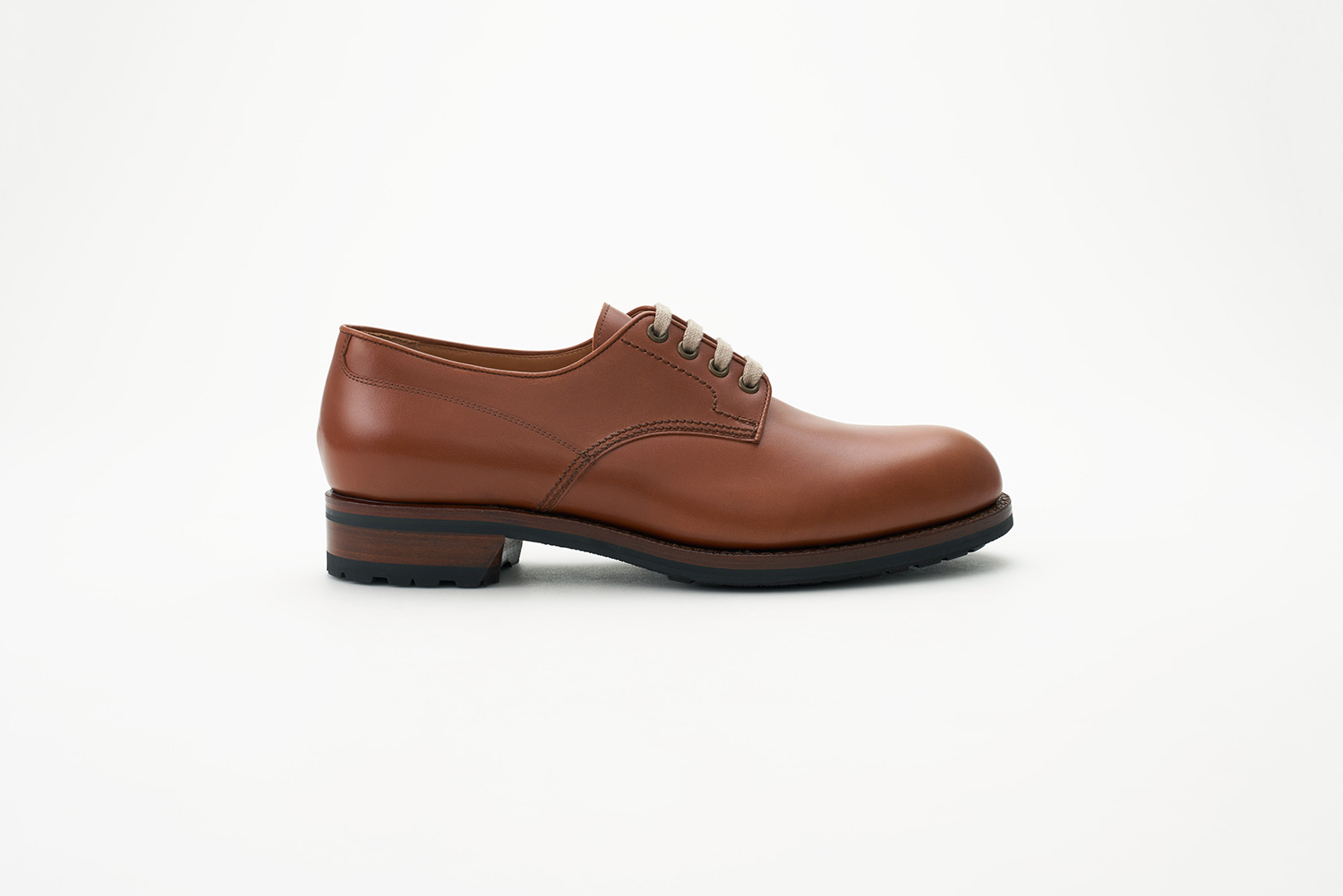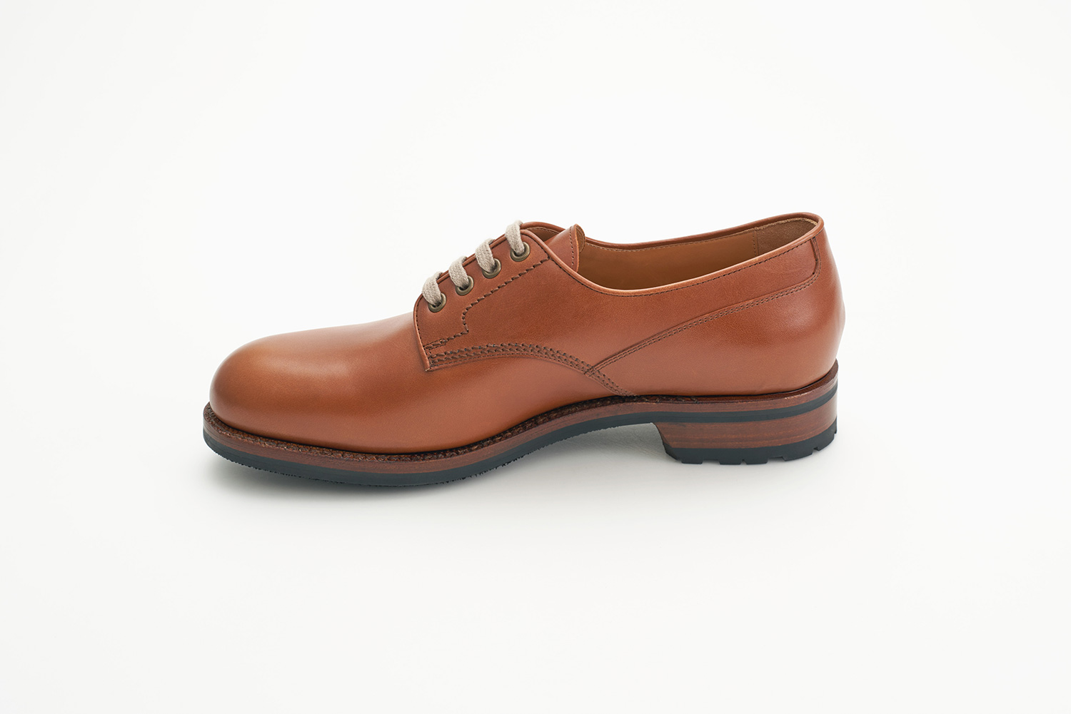 オブリークトゥとハンドメイドならではの内振り設計の木型。広めの履き口に短い捨て寸ですが、ボリュームが先にあるため寸詰まりに見えないカントリースタイルのダービー。繊細な製甲縫製と相まってヴィンテージシューズのような仕上がりです。