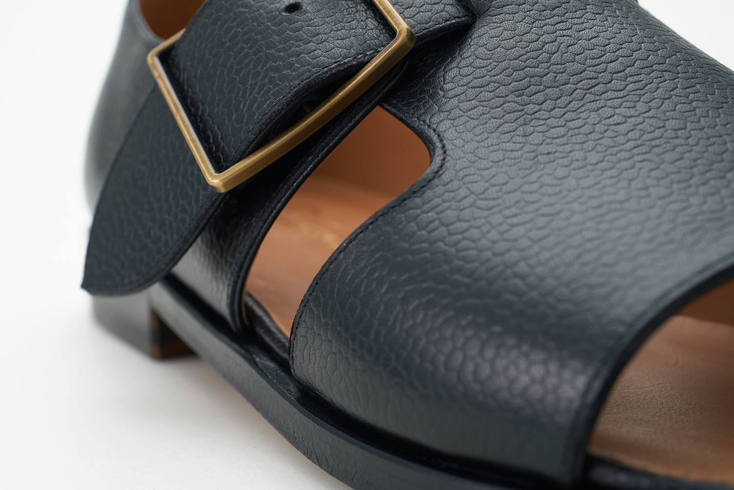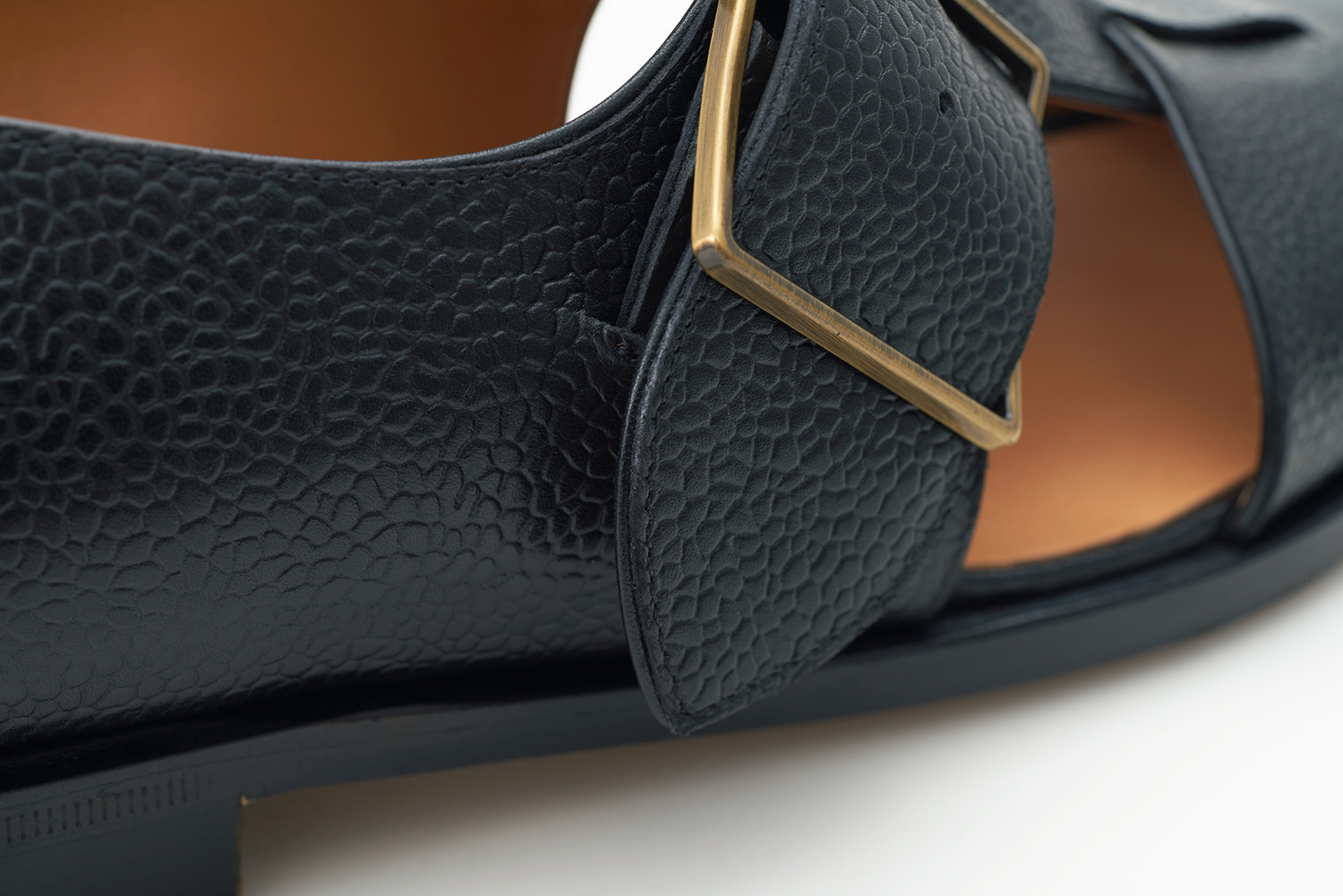 2022SSの新型グルカサンダル。フランスのタンナリーDu Puy社の型押しカーフ。スリッポン設計のため甲の低い木型DIEGOを採用しています。ハンドメイドの大ぶりなバックルがポイントです。甲革切り口にはカンガルー革を挟み縫うことで、伸び止めの役割と共に、佇まいを良くしています。