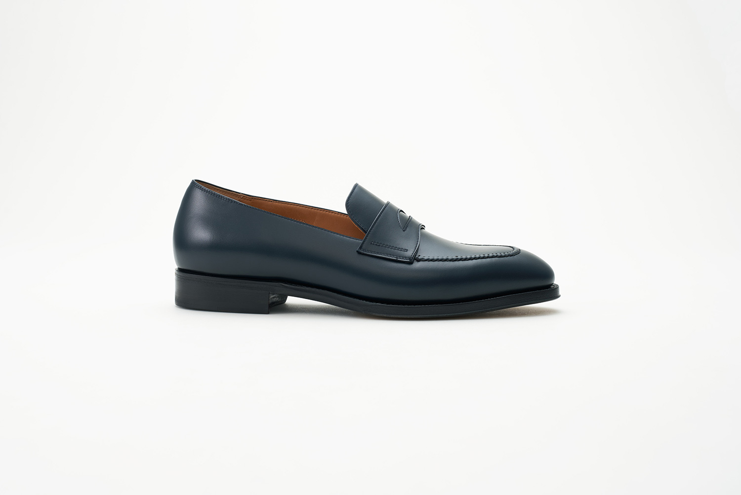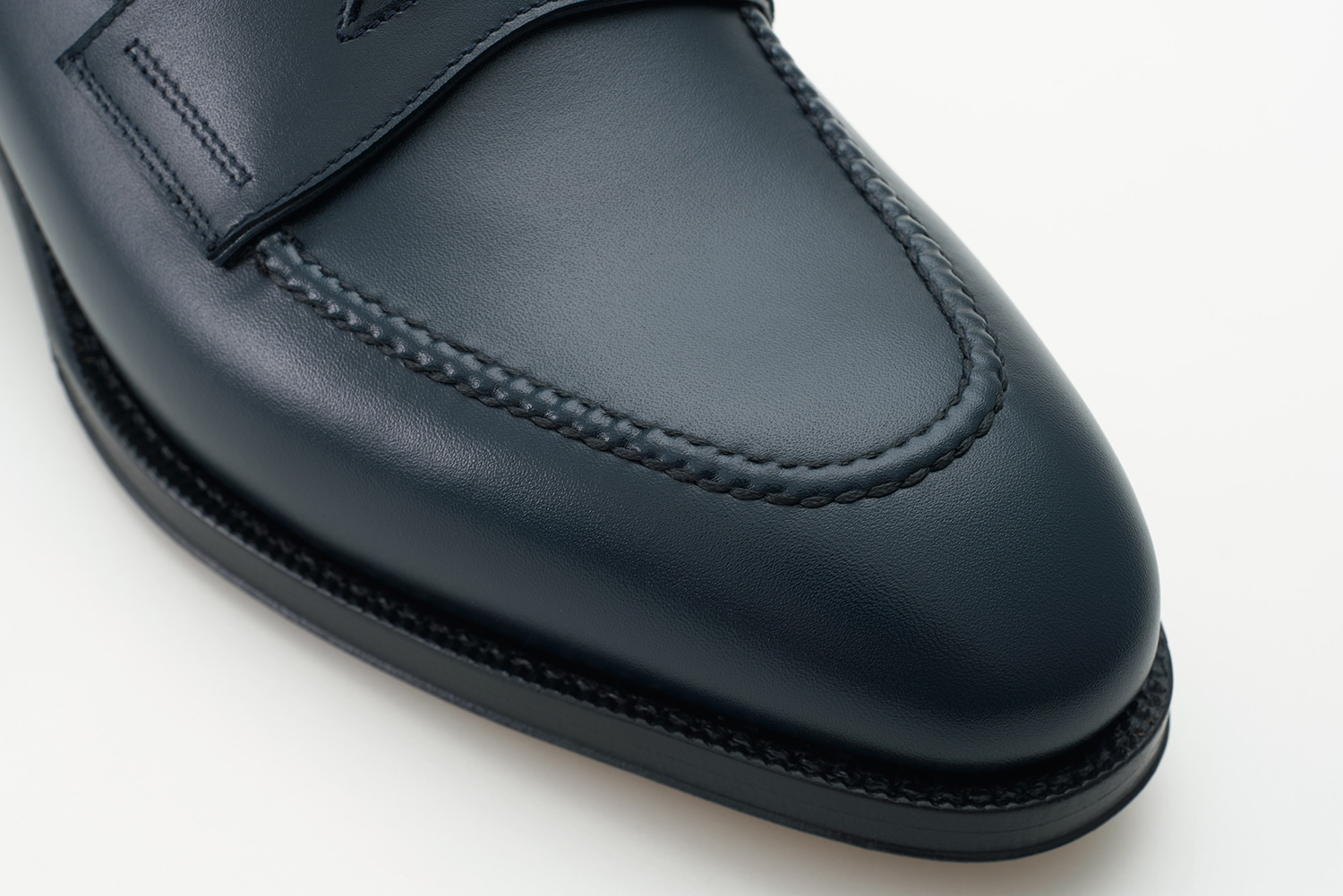 ハンドモカが手の温もりと古臭さを感じさせるローファー。細いトゥに内に入った小さなモカラインは本来スーツにも用いられる英国によく見たスタイルです。甲革はCARL FREUDENBERGから技術を引き継いだポーランドのWEINHEIMER LEDER社のグレイかかったネイビー。落ち着いた色合いから多くのクラシックシューズブランドで使われていました。