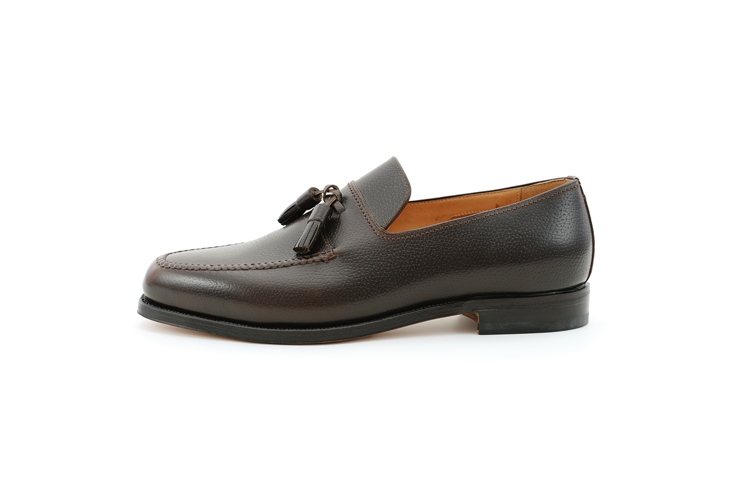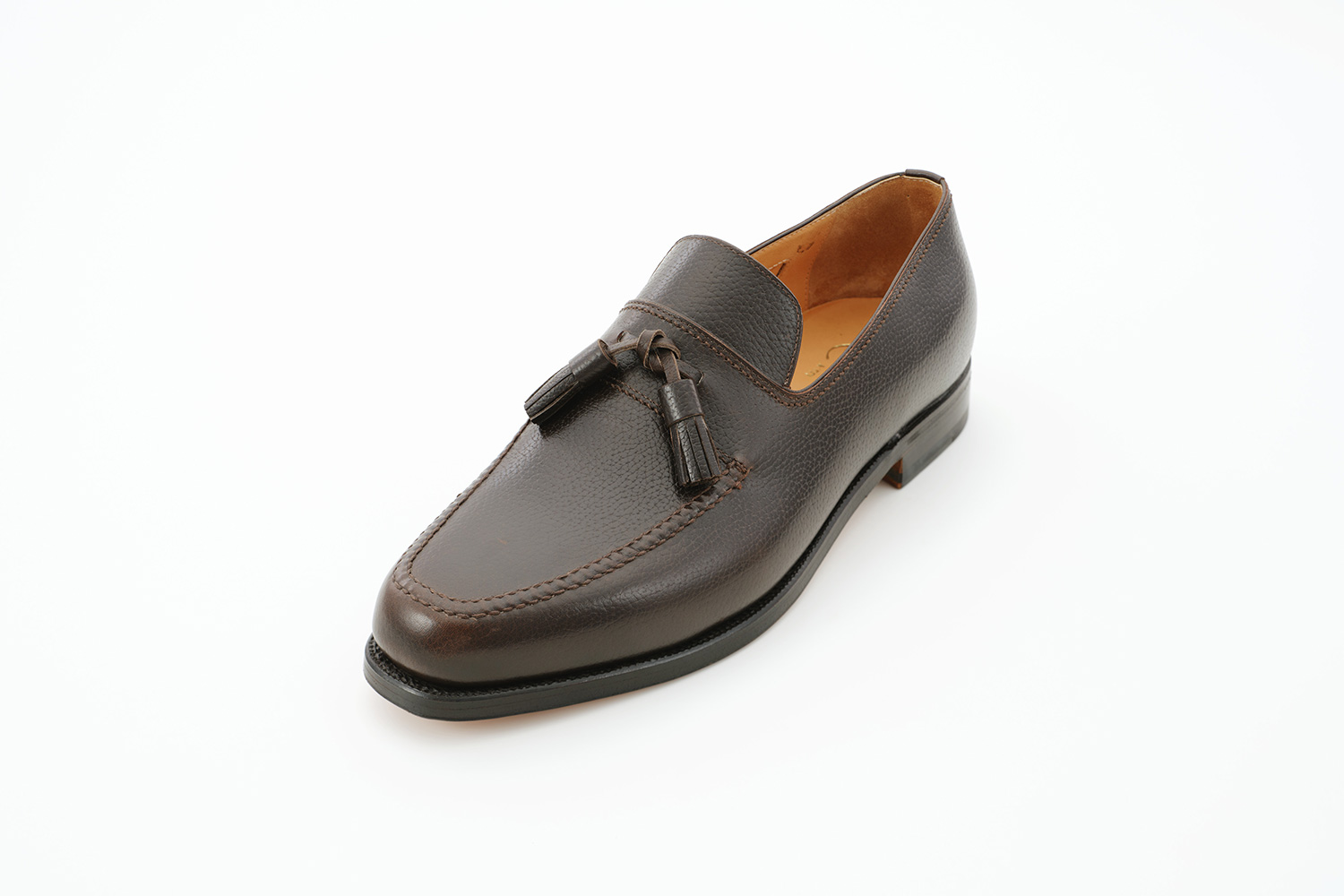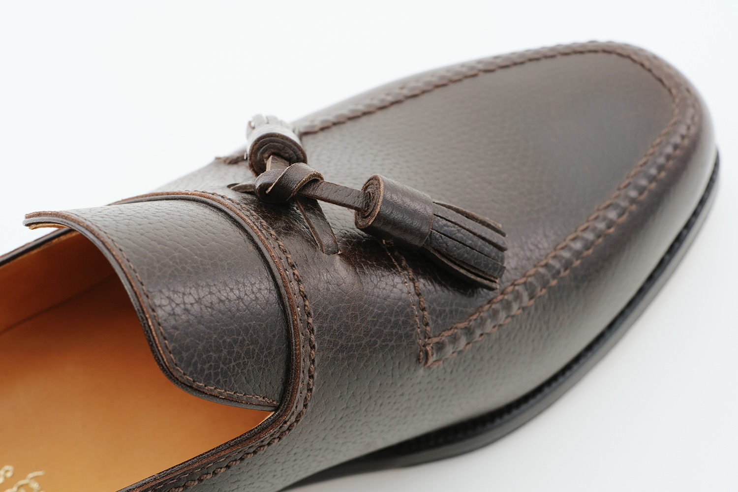 セミスクエアのローファー木型JONATHANを用いたTASSEL SLIP-ON SHOES。木型を入れた状態で熟練した職人が掬い縫いしたモカは、独特の立体感がミシン縫いのモカとは一味違う高級感のある仕上がりです。