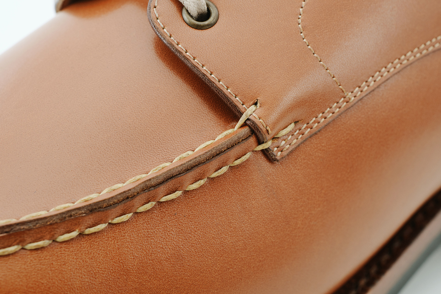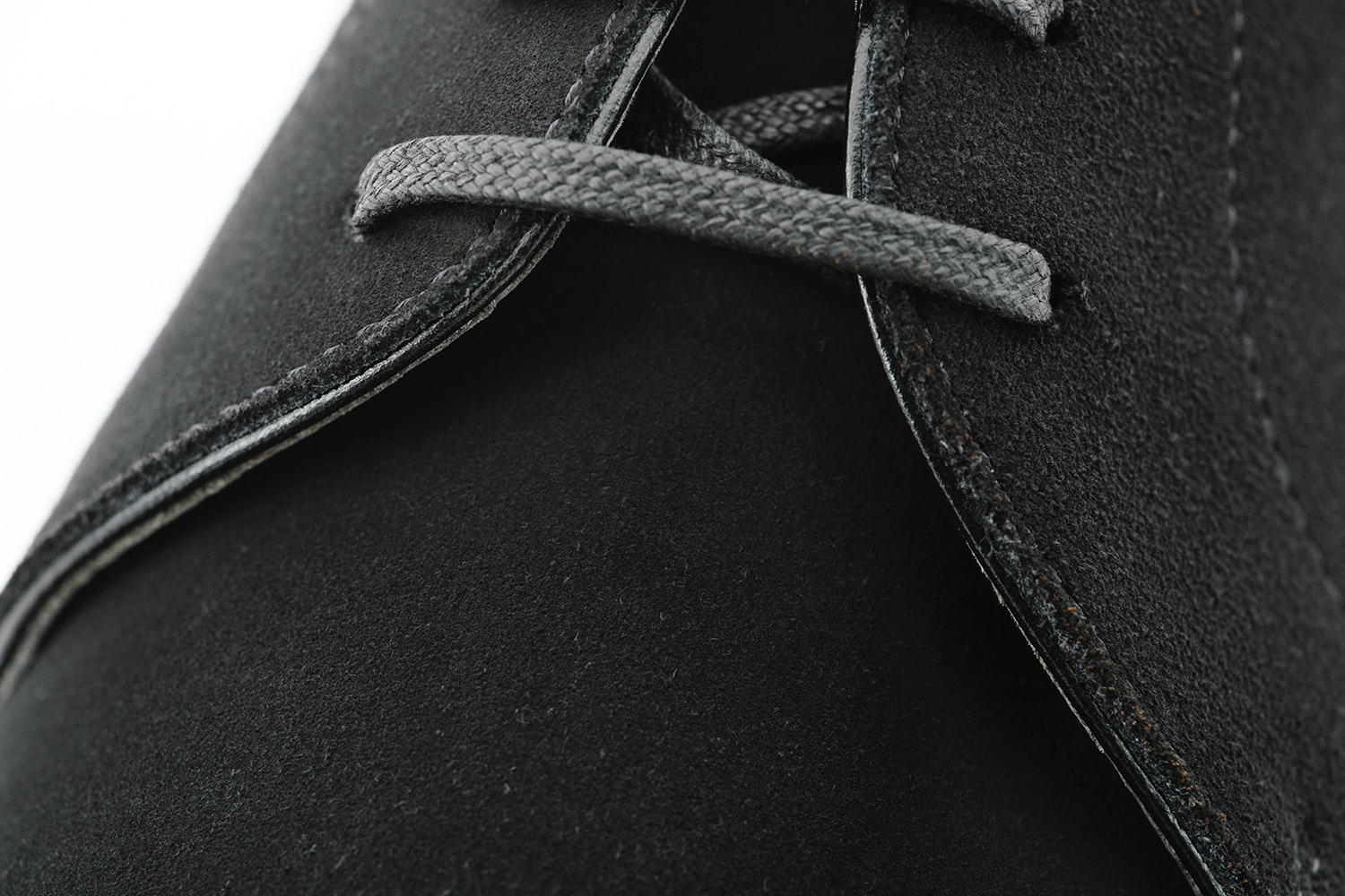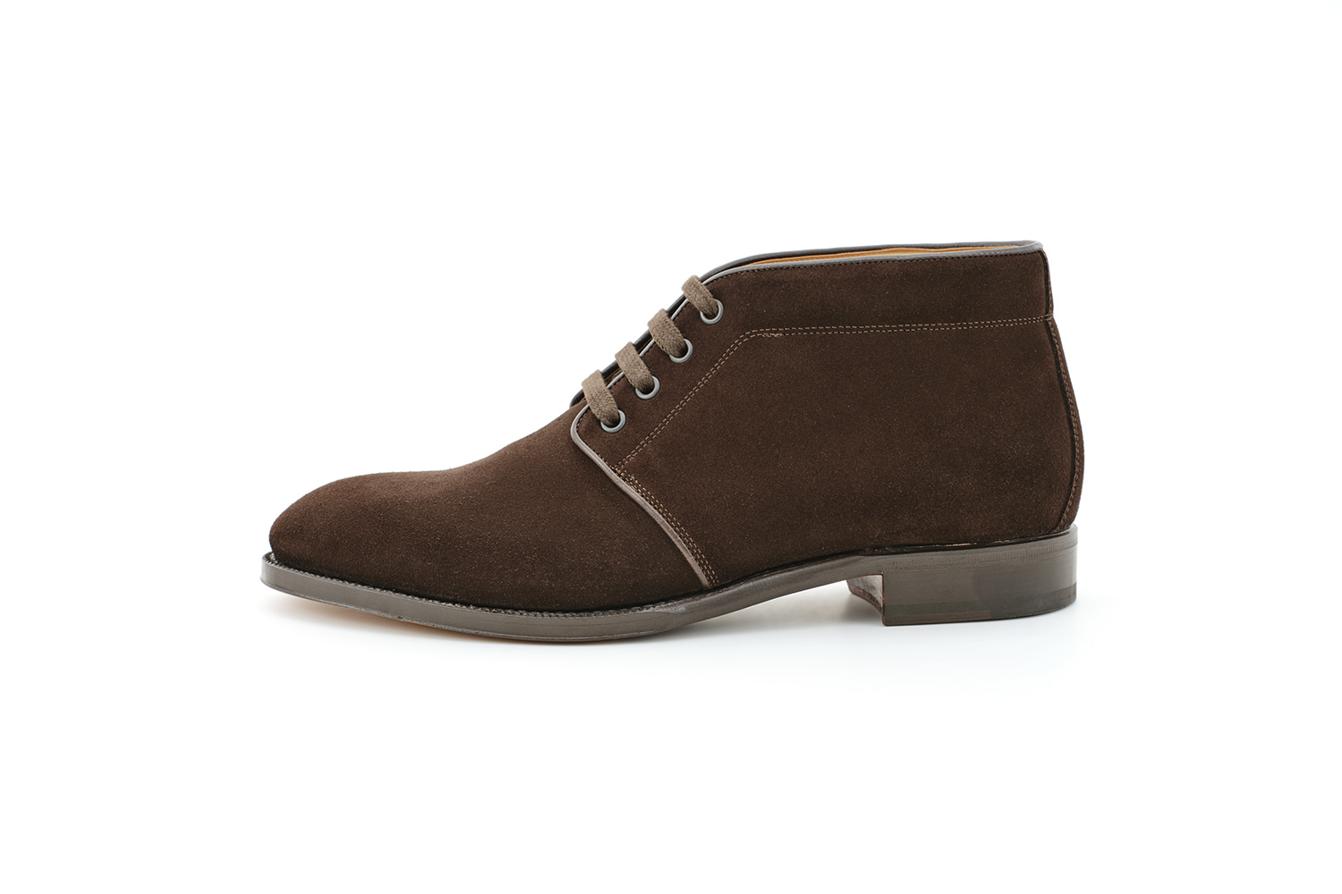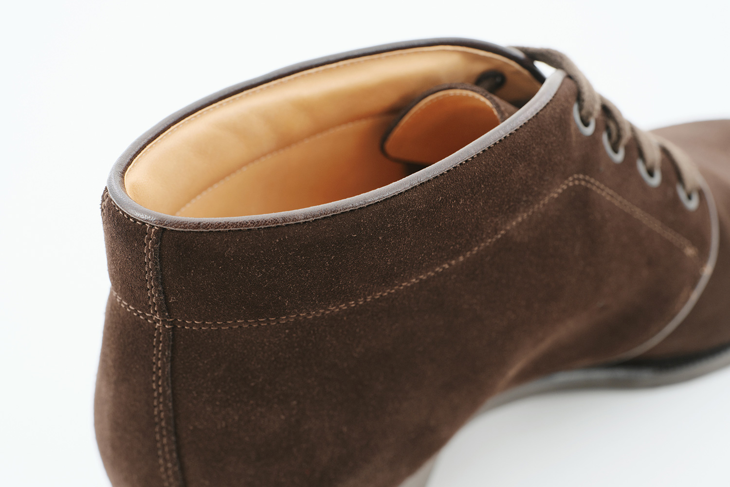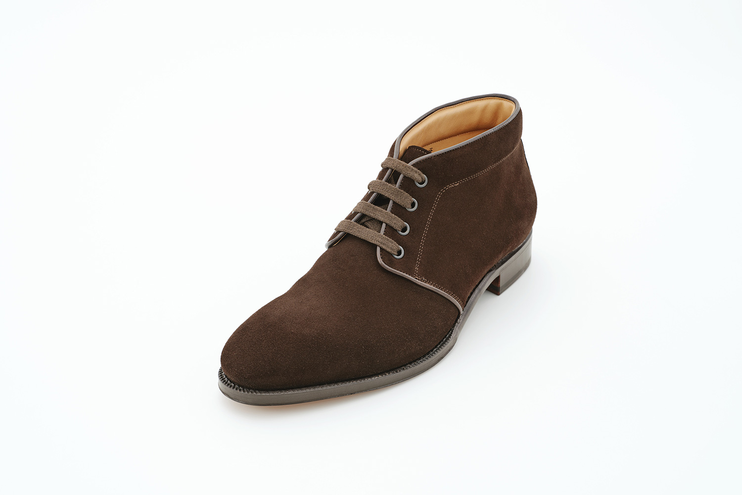オブリークトゥのブーツ木型のCHUKKA。履き口にパディング、大きめのハトメと太い平紐が配されて本来スポーティーなチャッカをより特徴付けています。オールドスクール スニーカーを合わせるようなスタイリングも新鮮です。