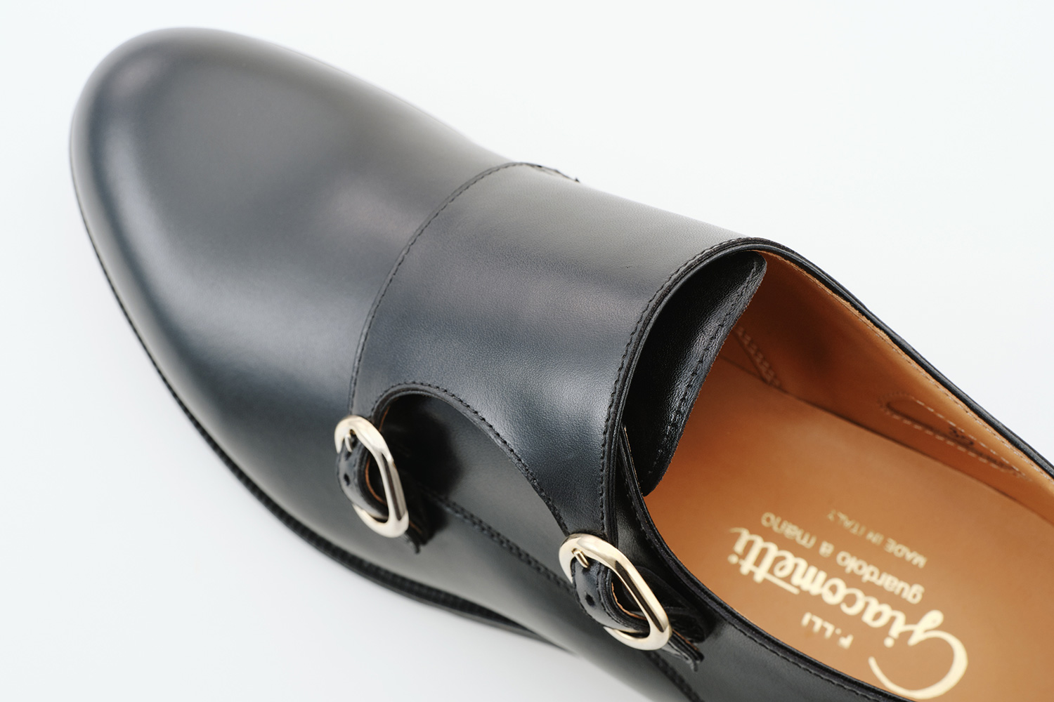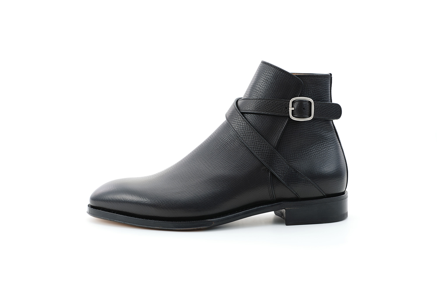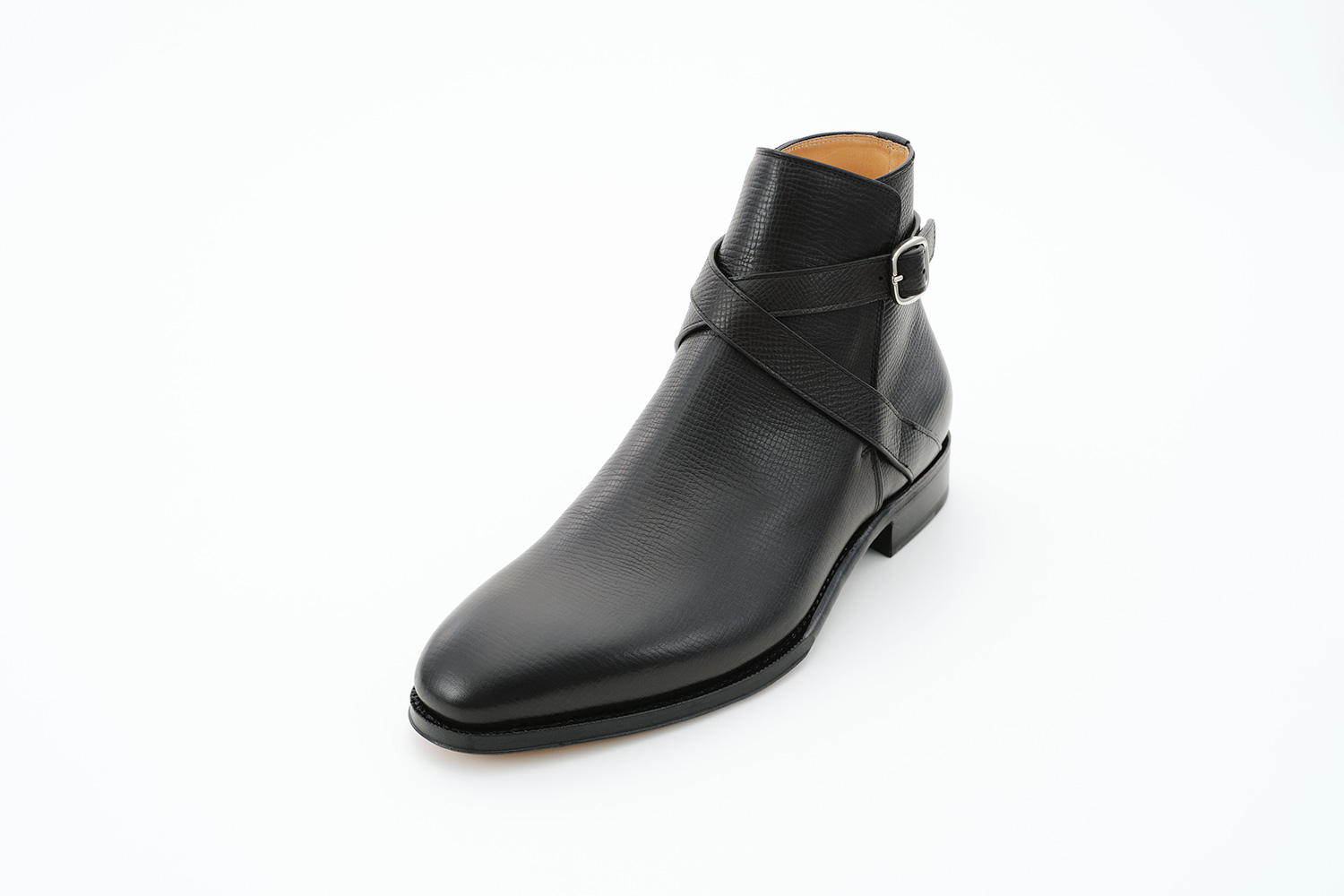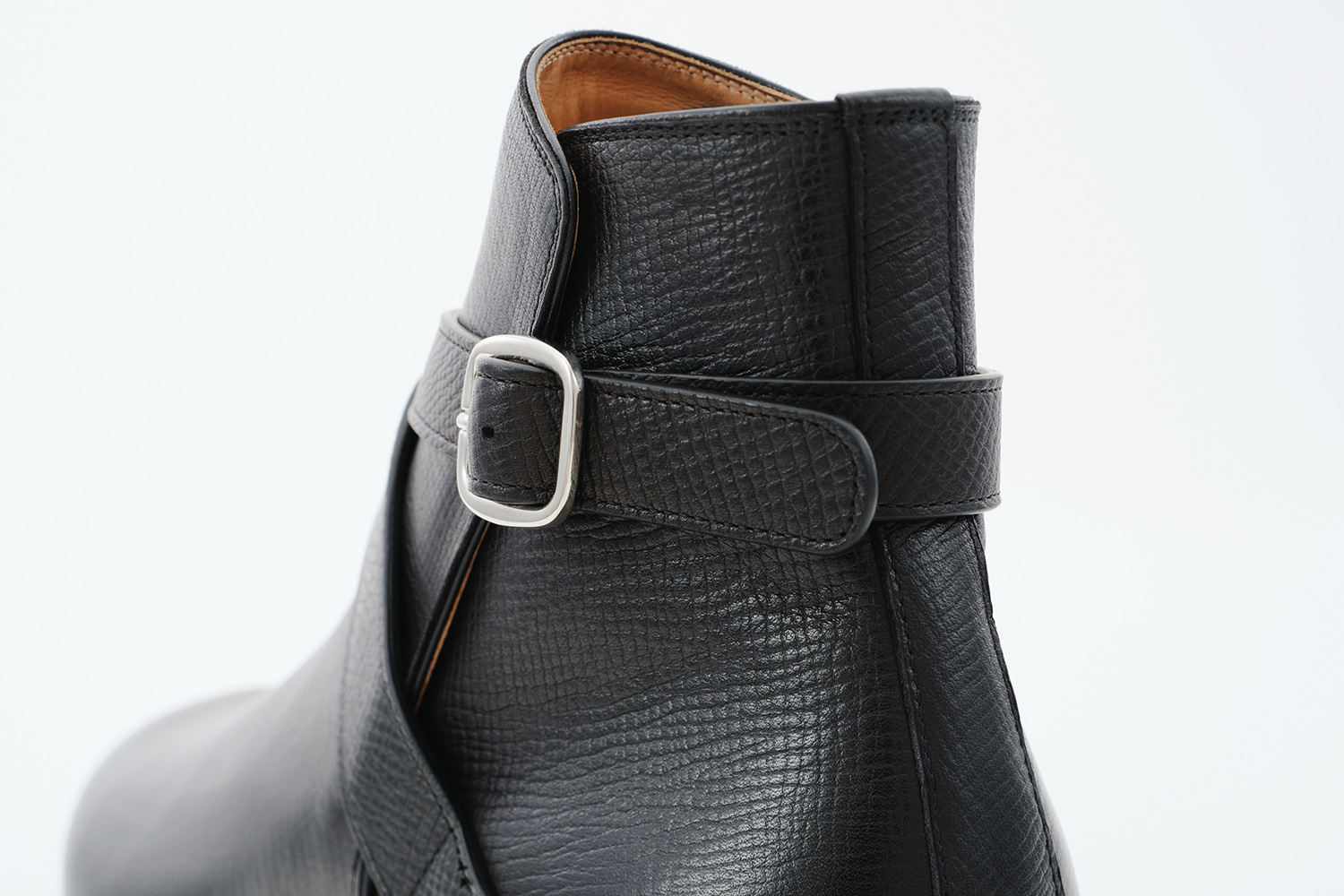 型押しカーフでもクイッピングを可能にする柔らかさの仏HAAS社のカーフを使用。現代となってはF.LLI Giacomettらしいベルト回しと切り口の仕上げ、甲革とライニングの間に挟んだカンガルー革の艶からは職人メーカーらしい仕上りのJODHPUR BOOTS。