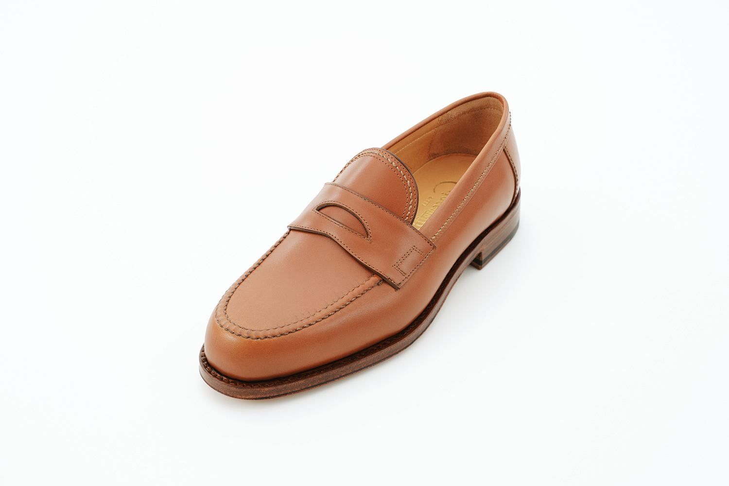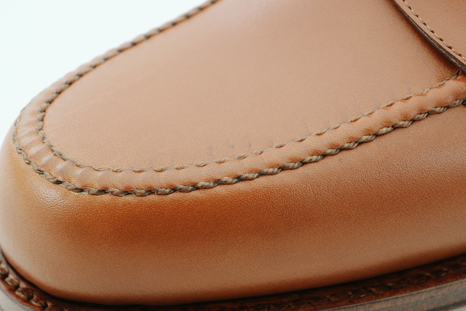 ハンドモカが手の温もりと古臭さを感じさせるローファー。木型を入れた状態で、職人が2本の針を用いて1本の糸を一針一針掬い縫いしています。フランスタンナーのアニリンカーフの持つ透明感と相まってハンドメイドならではの仕上がりです。