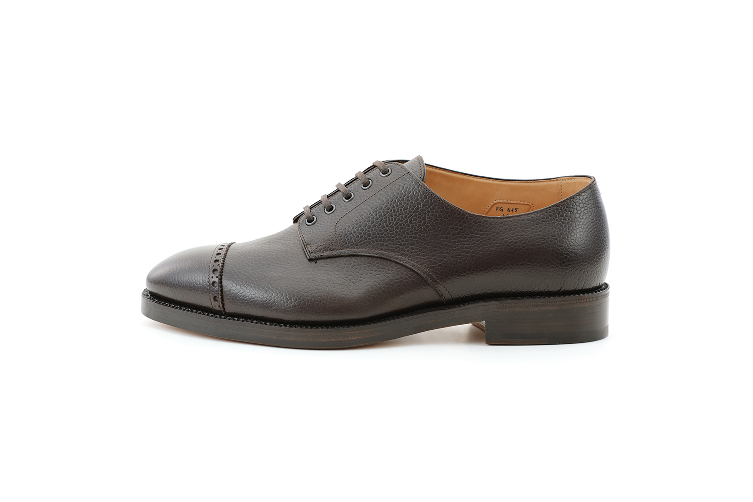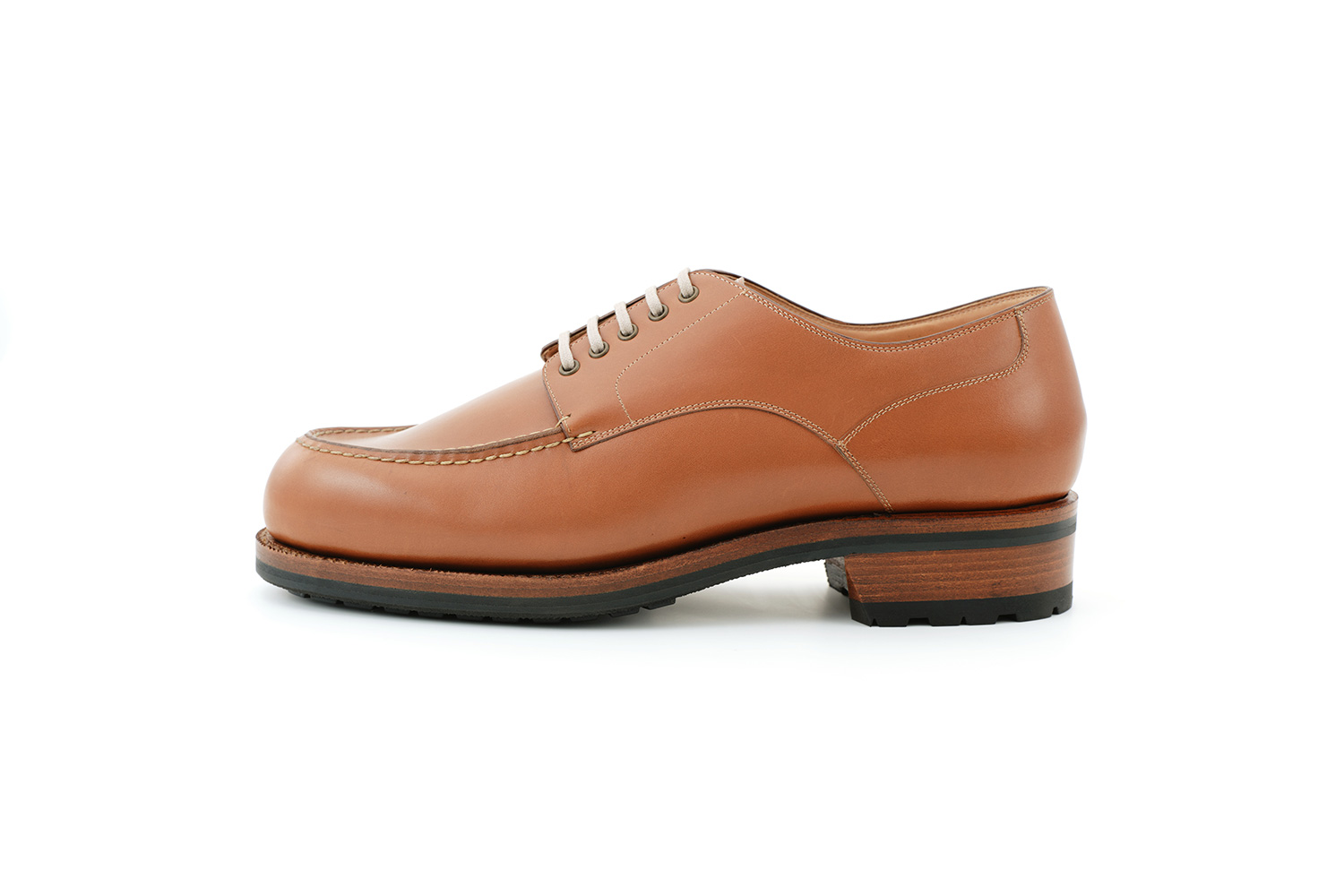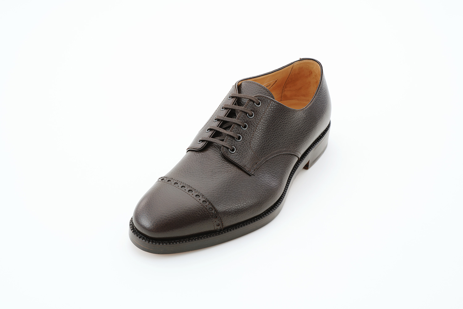 正統スタイルの代表CAP TOE DERBY+オブリークトゥ木型。ダブルソールに大きな目付けとハトメが堅牢に作られたハンドメイドの古靴に見るカントリースタイルです。イタリア靴らしい厚いダブルソールが泥臭いスタイルを演出します。
