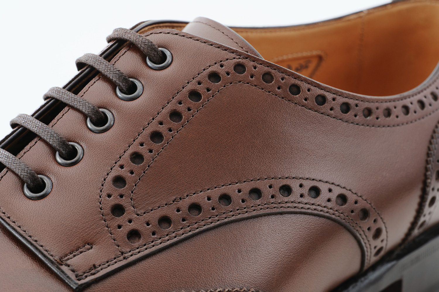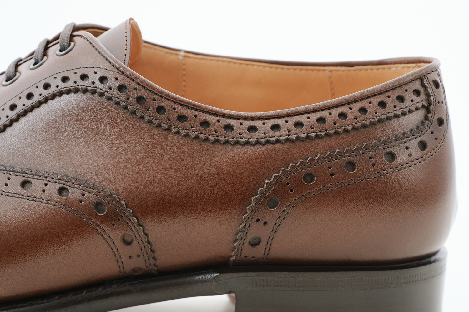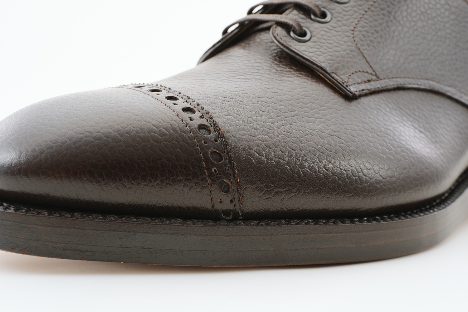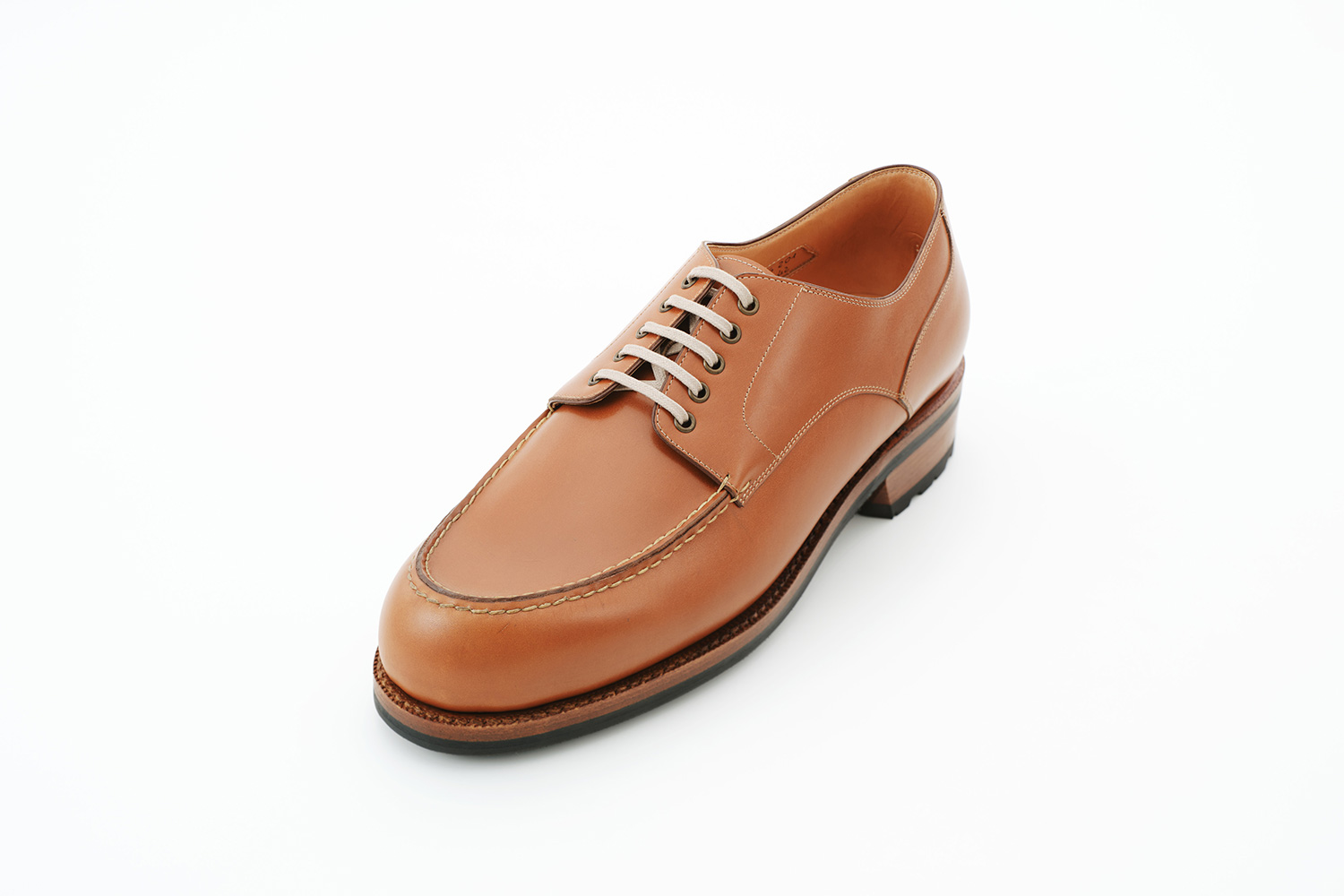 正統スタイルの代表CAP TOE DERBY+オブリークトゥ木型。ダブルソールに大きな目付けとハトメが堅牢に作られたハンドメイドの古靴に見るカントリースタイルです。イタリア靴らしい厚いダブルソールが泥臭いスタイルを演出します。