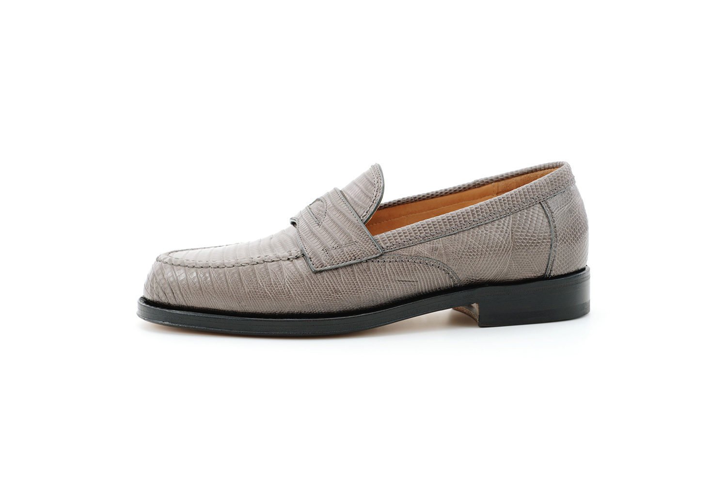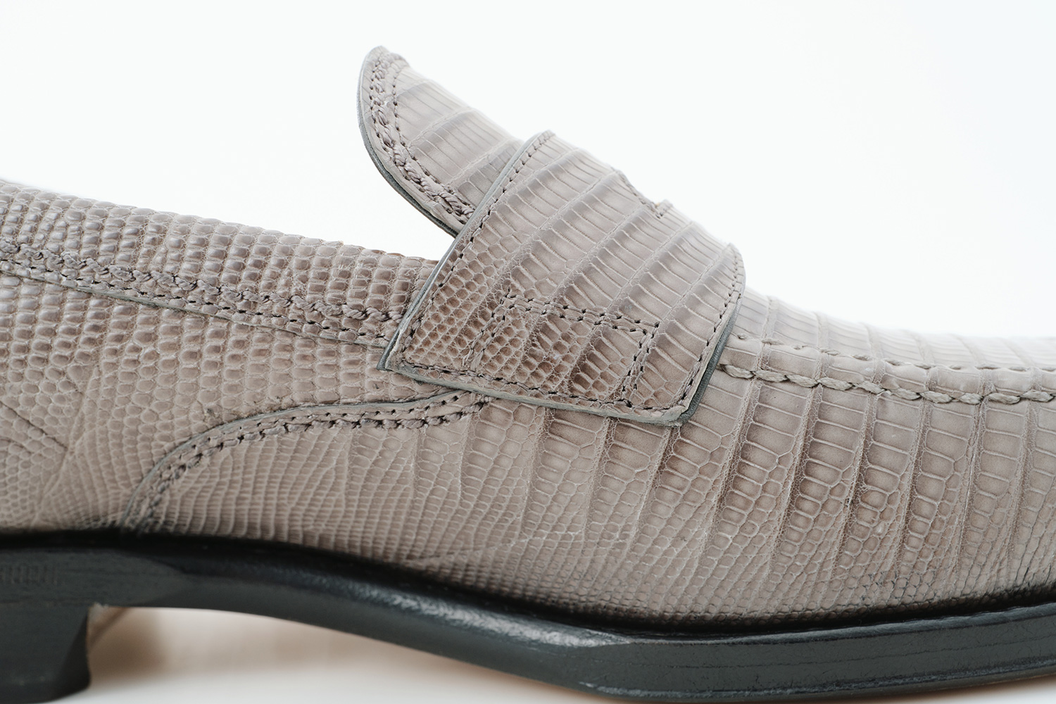 トカゲの柔らかい腹面を甲革に用いたローファー。透明感のある四角い腑が特徴で、片足に1匹を使用しています。
