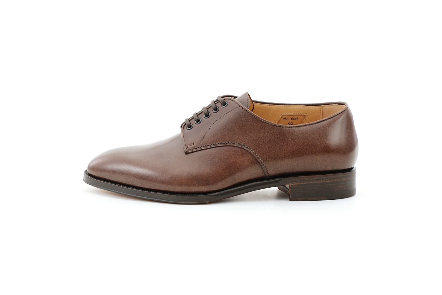 履き口が広く、踝下の内外の高さを極端に変えたスタイルは英国の古いビスポークシューズを見本としています。コードバンのダークブラウンと相まって履き皺と手入れの後を想像させられます。伝統的な技術と素材を用いて作られた革靴は履き手の生活スタイルに合わせた変化も楽しみの一つです。