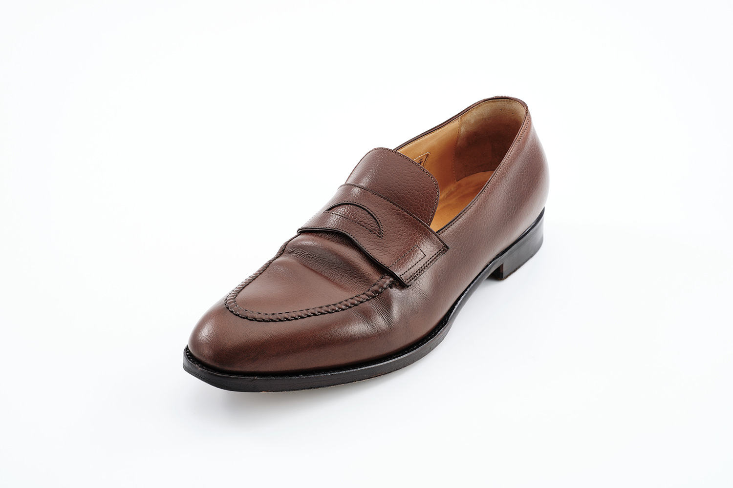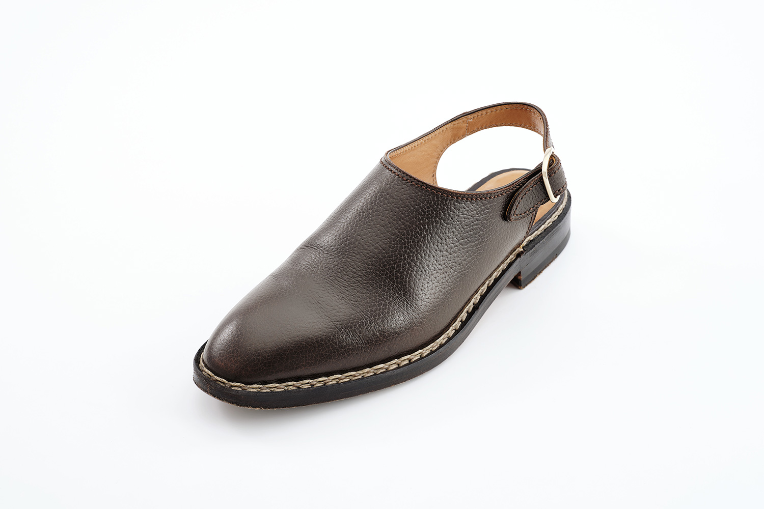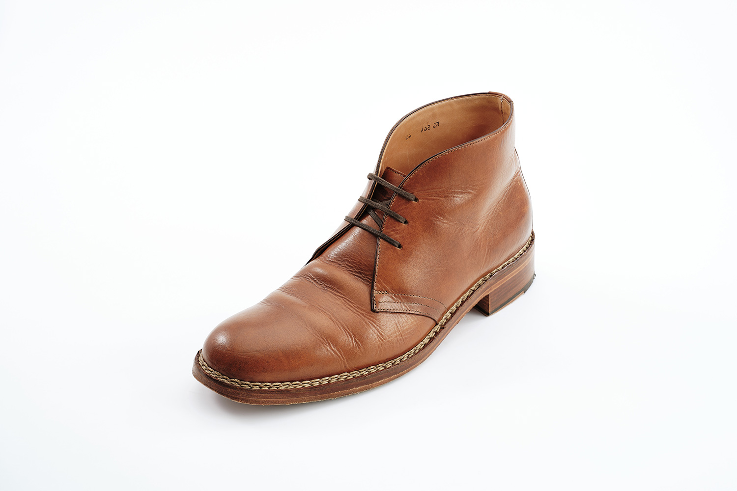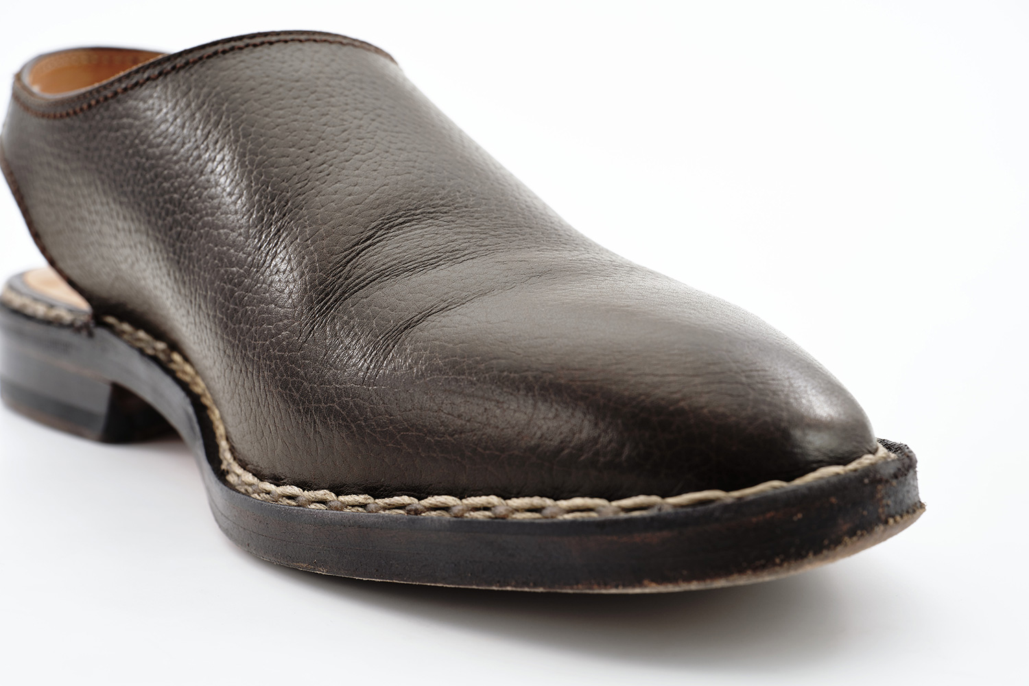 植物性天然成分で作られたタンニンで鞣された牛革です。透明感のある色味が特徴です。個体差はありますが、履き皺は粗く入ります。日々の手入れは履く前のブラッシング。水染みが出来易い革なので、撥水の為に茶色のワックスを使用しています。その際にノルベジェーゼ糸にもワックスを使用します。爪先の減りを革で補修しました。
