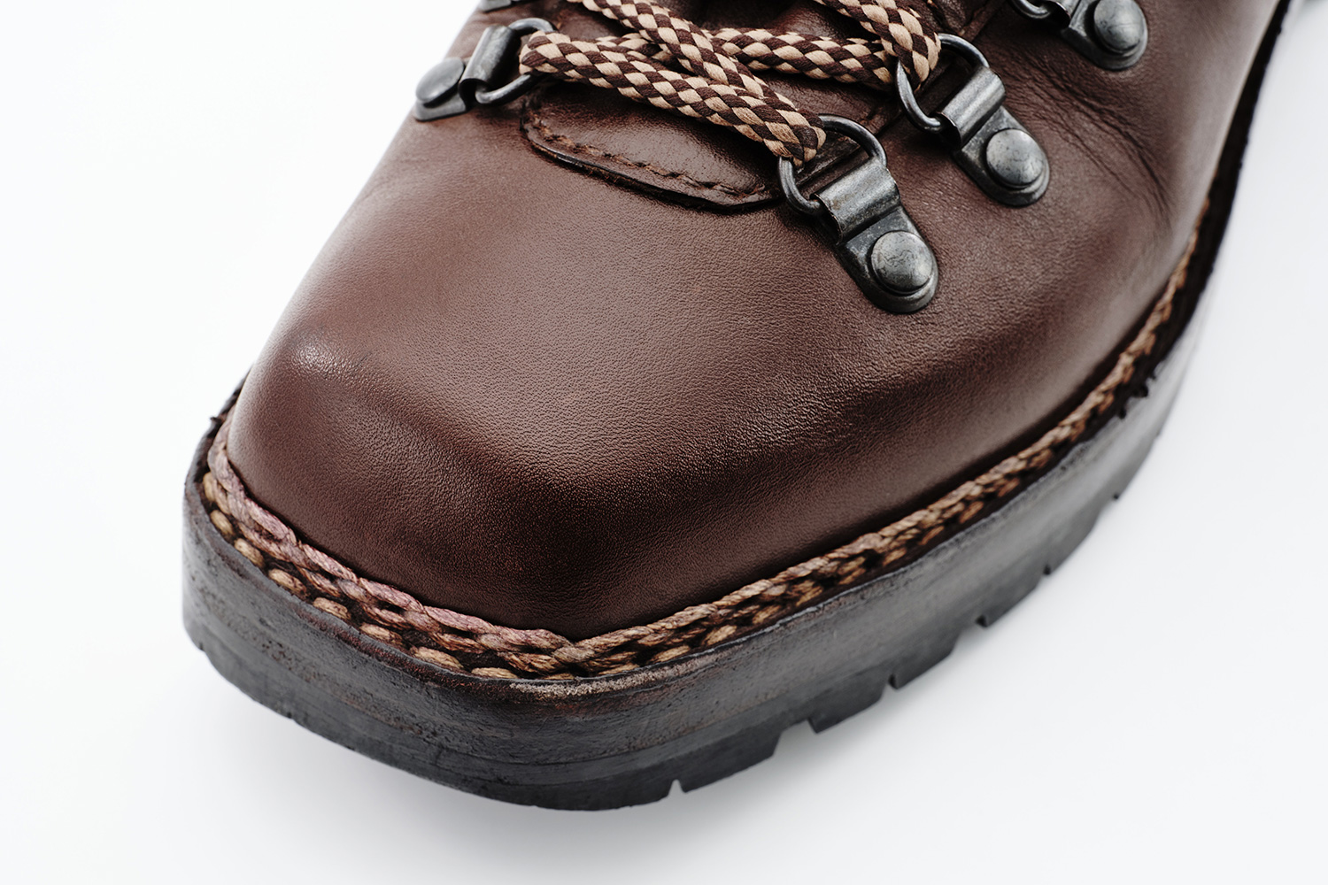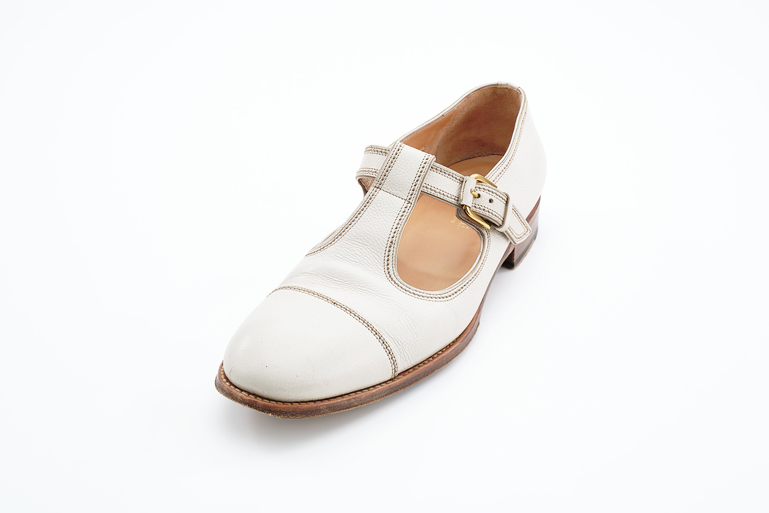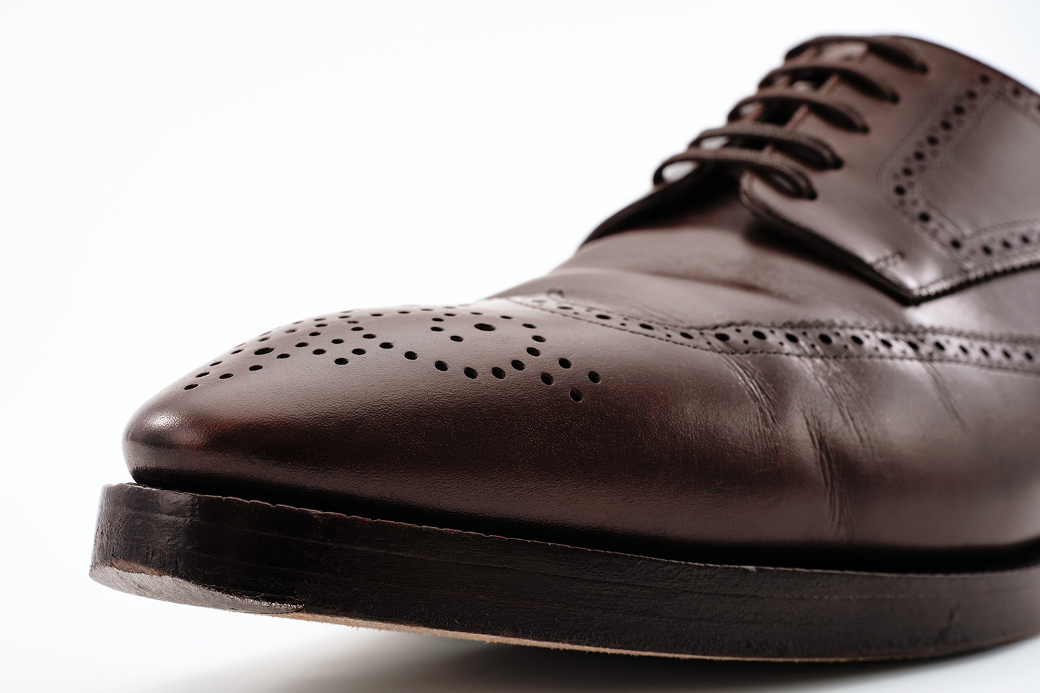 植物性天然成分で作られたタンニンで鞣された牛革です。透明感のある色味が特徴です。個体差はありますが、履き皺は粗く入ります。日々の手入れは履く前のブラッシング。水染みが出来易い革なので、撥水の為に茶色のワックスを使用しています。その際にノルベジェーゼ糸にもワックスを使用します。爪先の減りを革で補修しました。