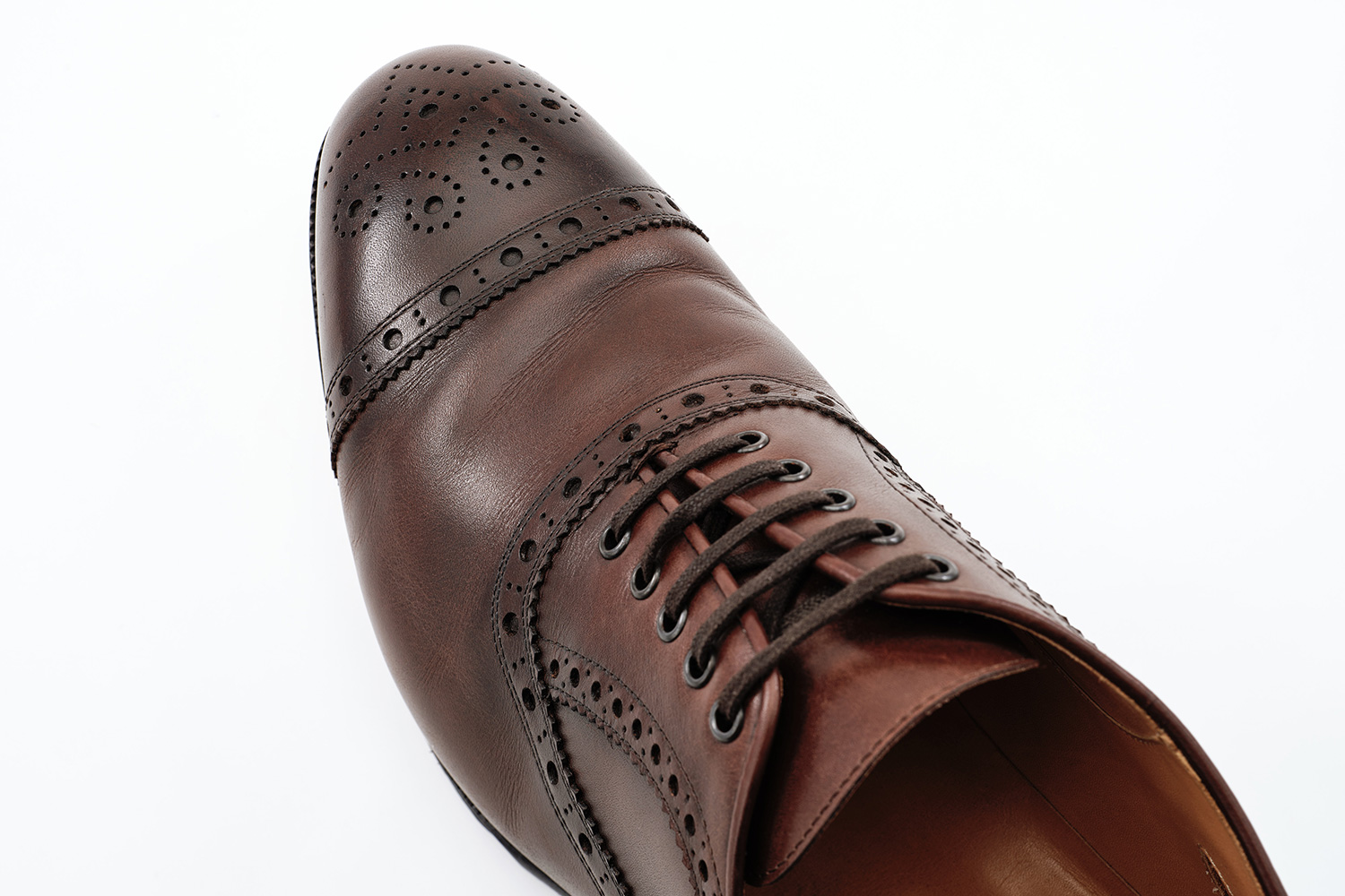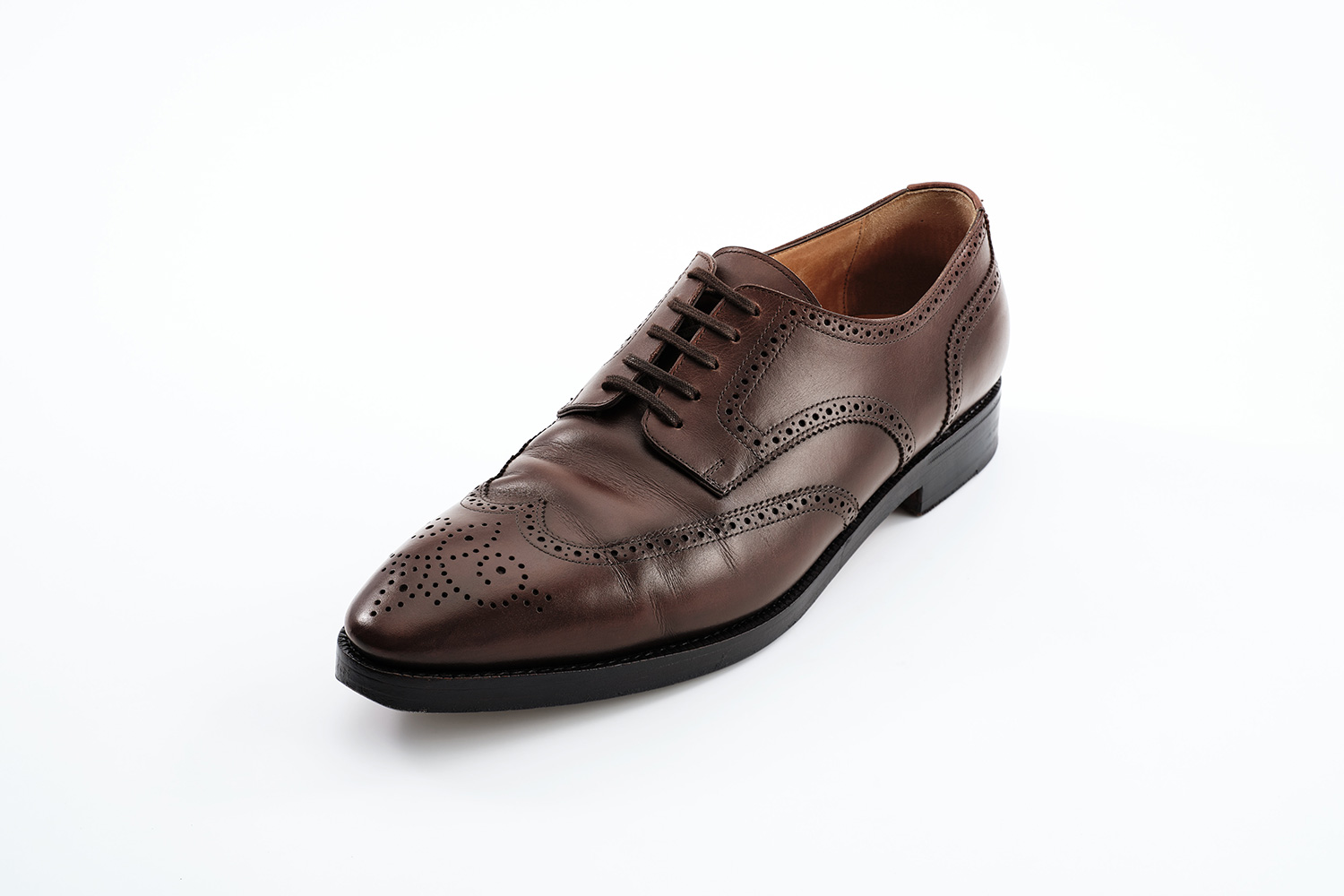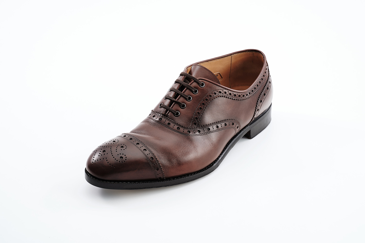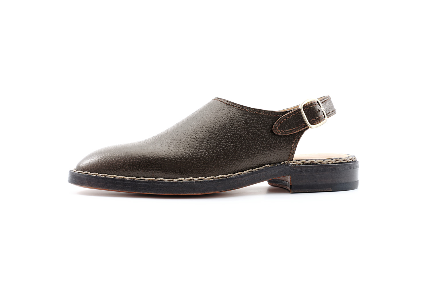 植物性天然成分で作られたタンニンで鞣された牛革です。透明感のある色味が特徴です。個体差はありますが、履き皺は粗く入ります。日々の手入れは履く前のブラッシング。水染みが出来易い革なので、撥水の為に茶色のワックスを使用しています。その際にノルベジェーゼ糸にもワックスを使用します。爪先の減りを革で補修しました。