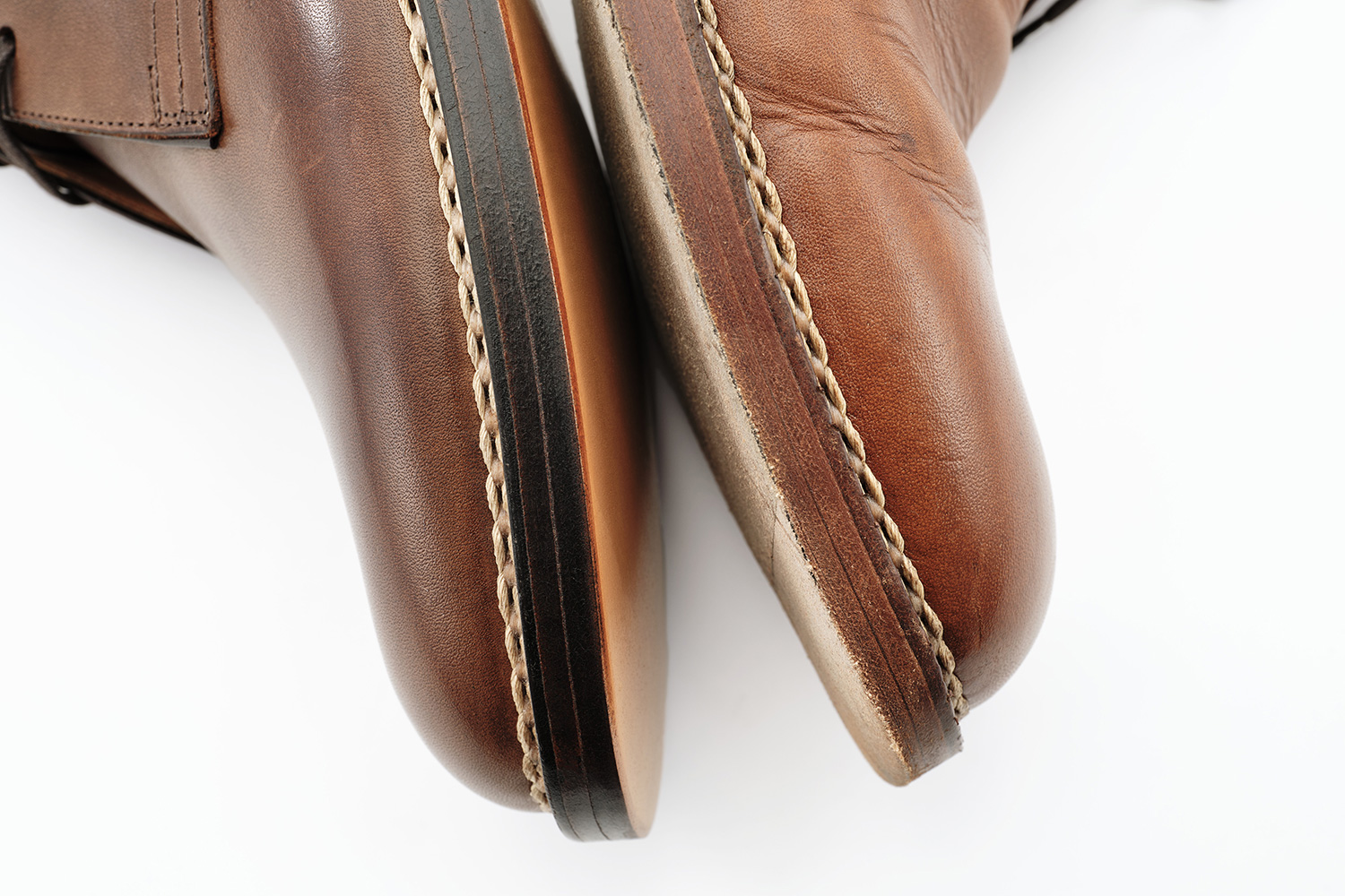 製法に影響されるソールの返りはボロネーゼ→マッケイ→G.Y.→ノルベの順に硬くなります。返りの硬い靴には靴下を履くことも1つのスタイルとしてお勧めしています。