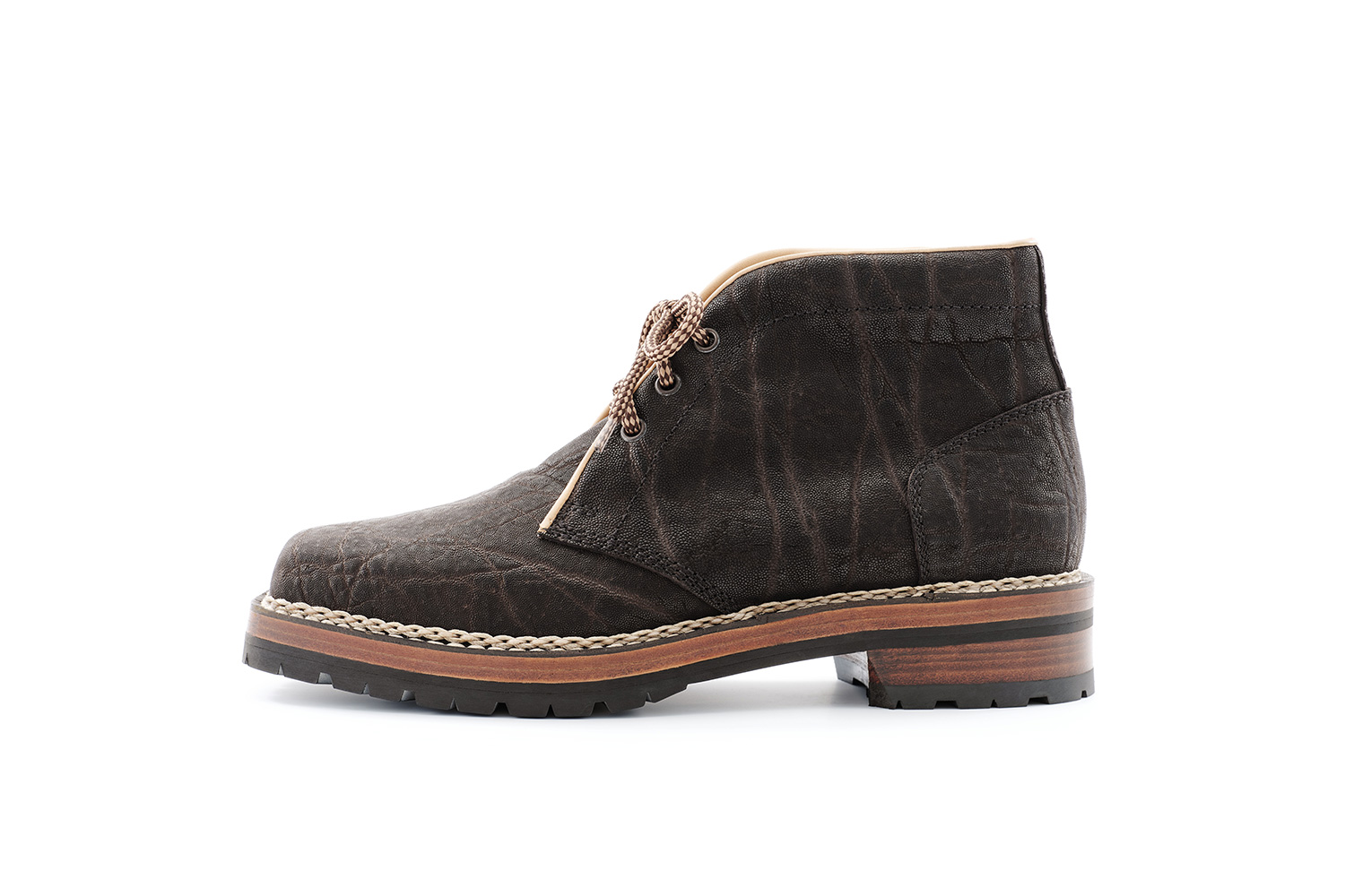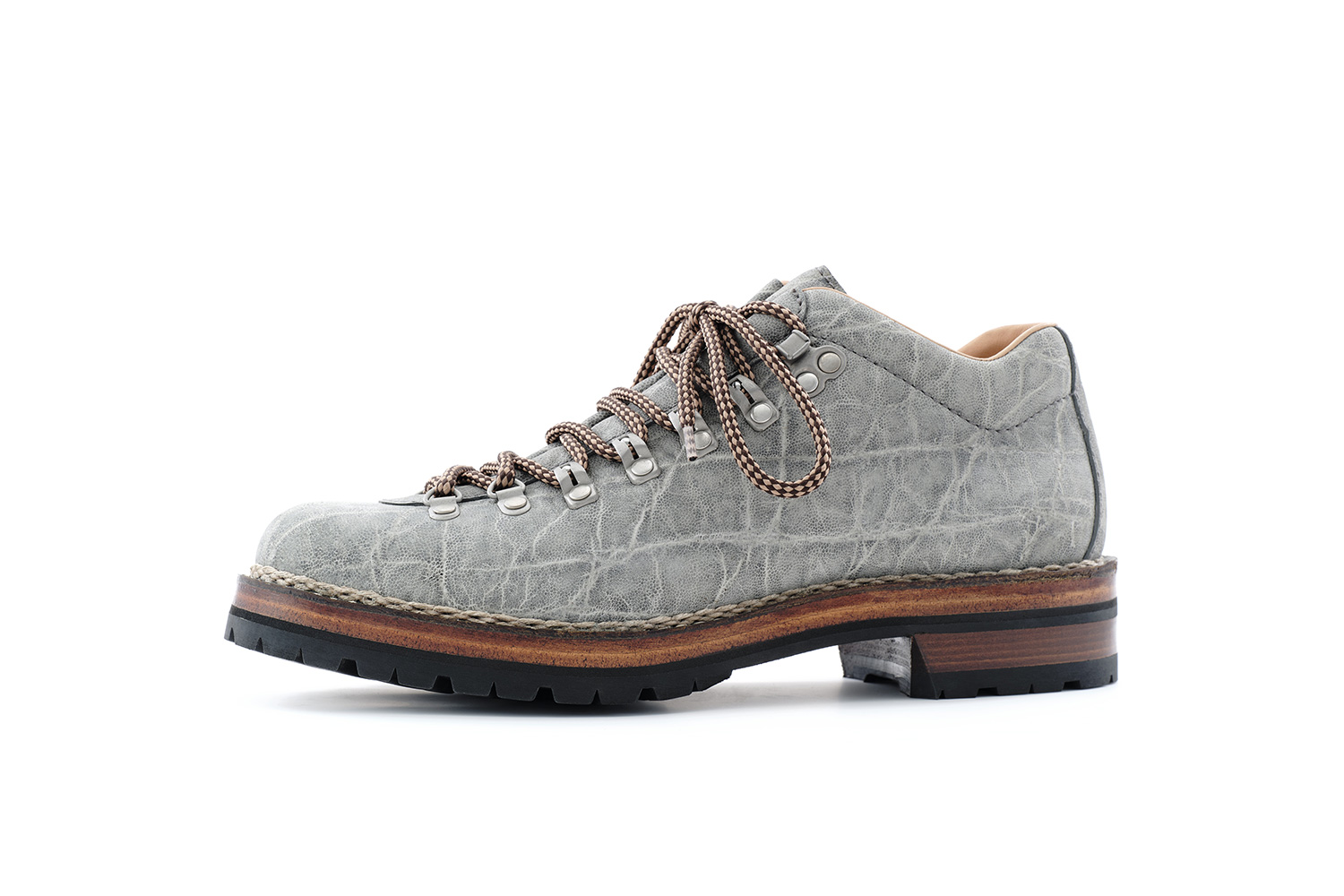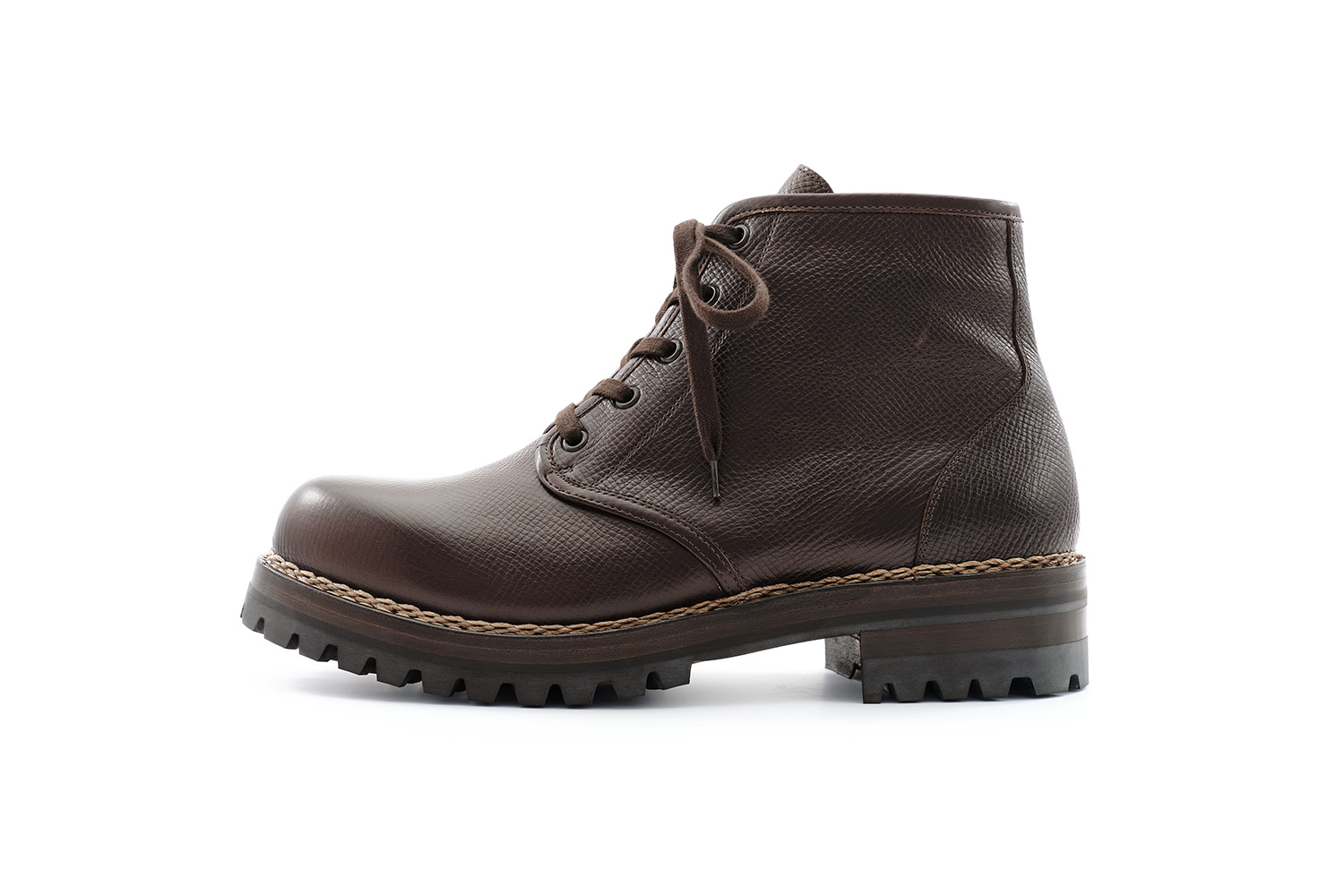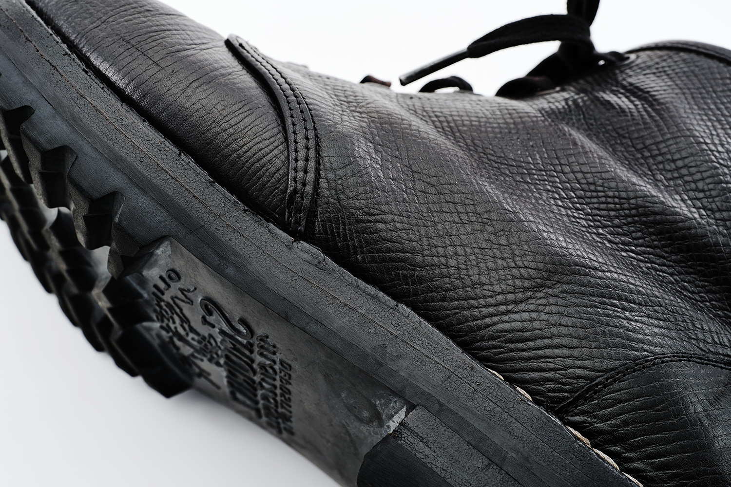 型押しがクラシックな雰囲気のフランスタンナー型押しカーフです。顔料で染色された革は擦り/引っ掻きキズは付きますが、ほぼ手入れいらず。個人的には小雨程度なら履いています。カンガルー革を覗かせた高級感ある製甲と、G.Y.製法の組み合わせが無機質な革にも愛着が湧きます。
