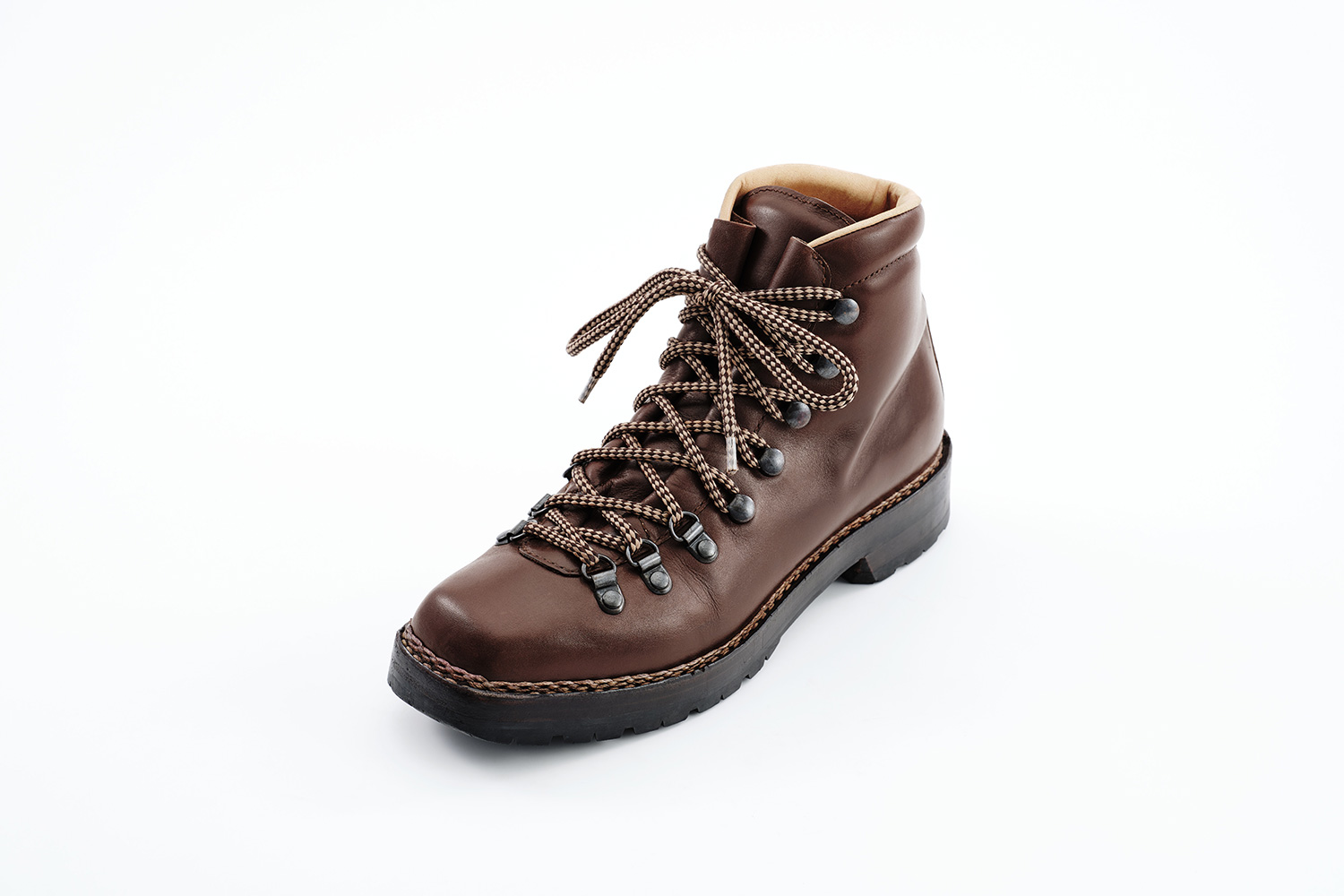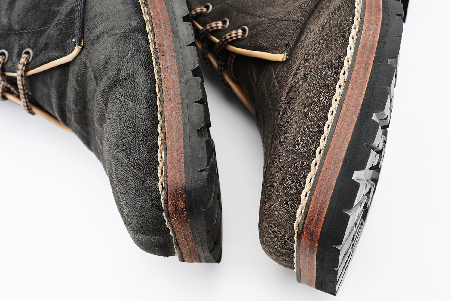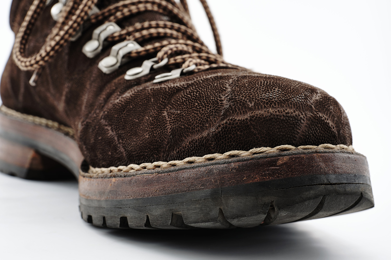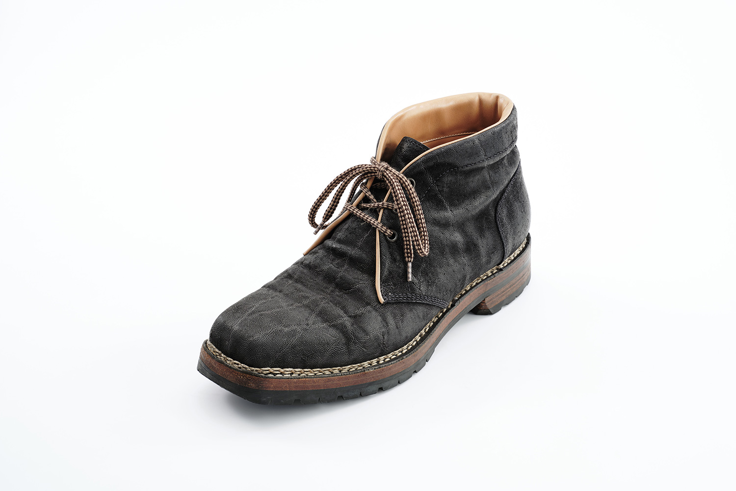夏の雷雨の予想される日はショーツに合わせて、冬の雪の日はタイツに合わせて履いています。雪用に開発されたソールSt.Moritzですが日本の雪ではVibramと大差なく思います。ソールが厚く仕上がるのは魅力です。下ろす前、定期的に黒ワックスを甲、ノルベ糸、コバに塗っています。UTAH CALFは型押しながらブーツのクリンピングもできる柔らかい革です。クリーム等は厚塗りしないようにご注意ください。