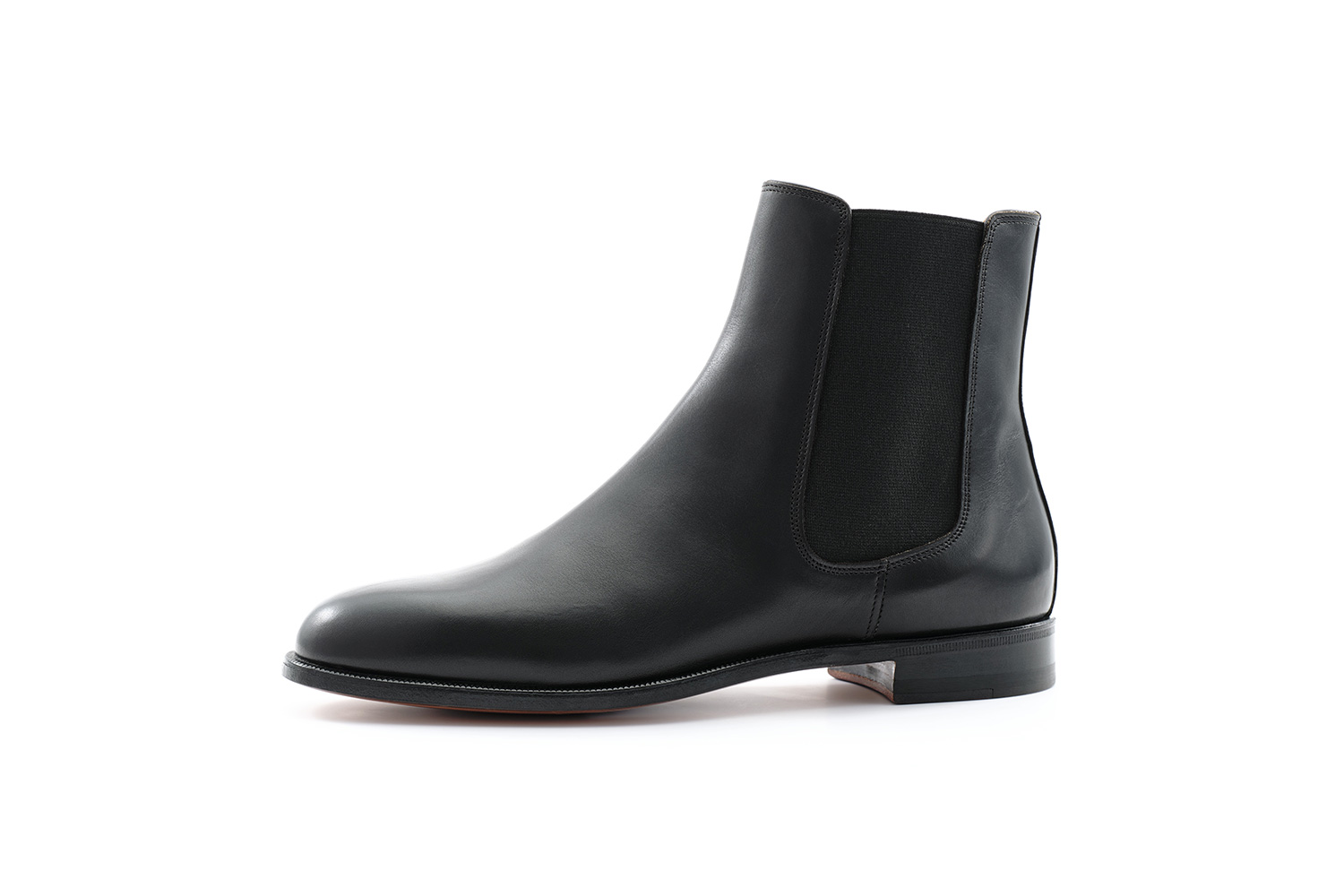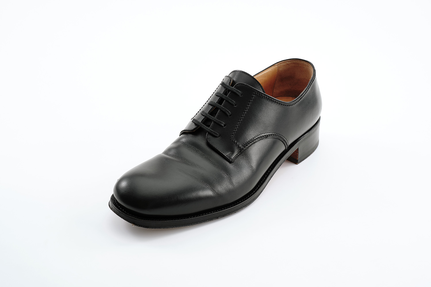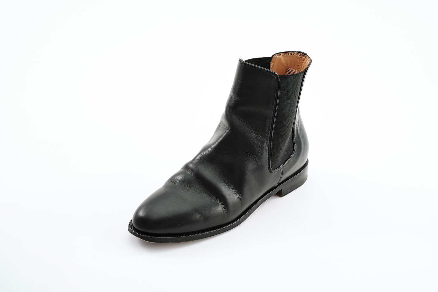 フランス原皮のフレンチカーフ。美味しく柔らかい肉を食すために去勢された牛の皮です。近年、一層高価に貴重になってきています。履き口とライニングの間から覗くカンガルー革が佇まい良く見せています。ワイドなスクウェアトゥ、高めのヒールが裾幅の広いパンツと好相性です。下ろす前にライニングや中敷きにはアルガンオイルを指で薄く塗り、甲革に黒ワックスでしっかりと手入れしました。日々履く前のブラッシングが適度な艶を出しています。