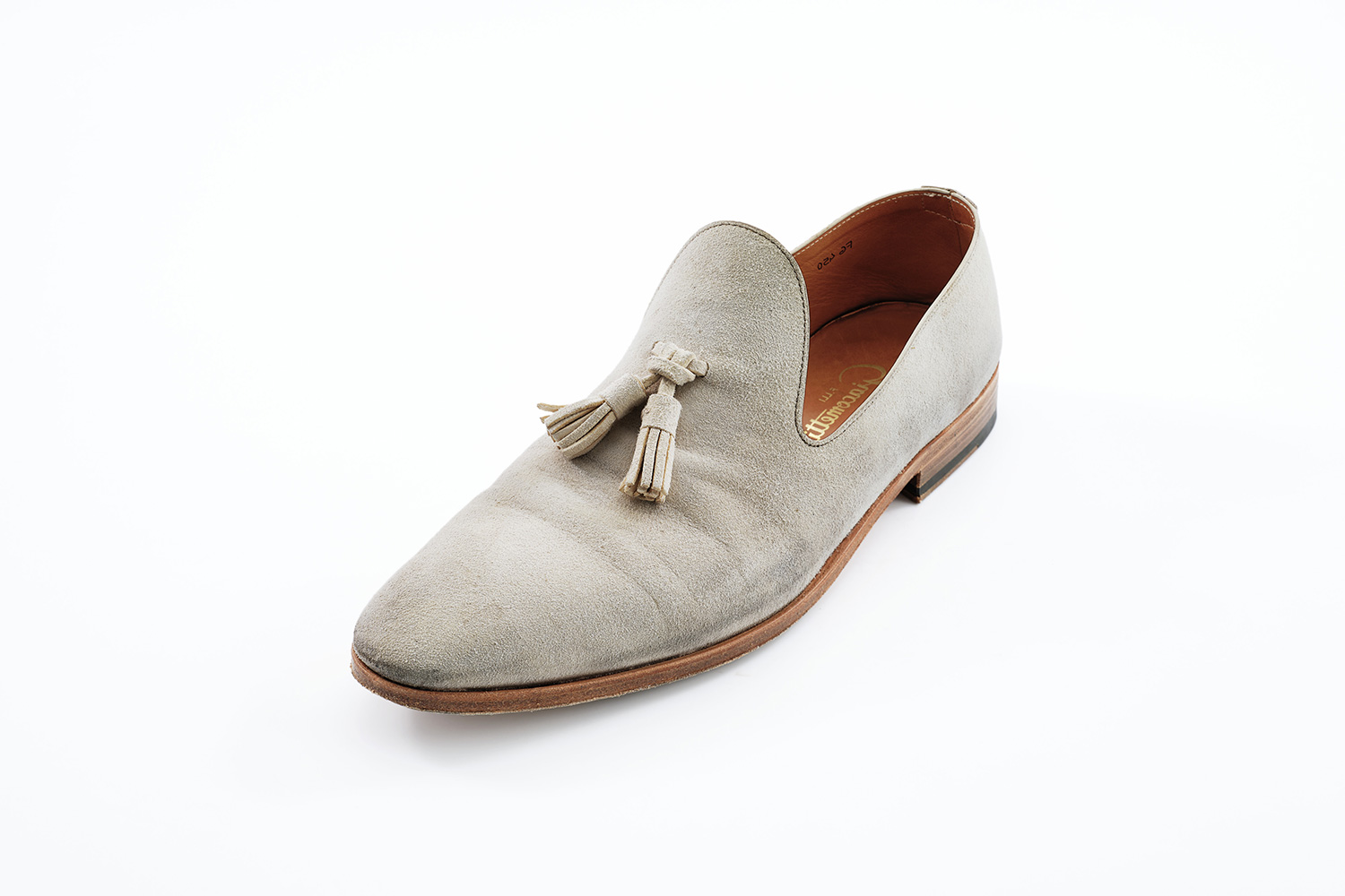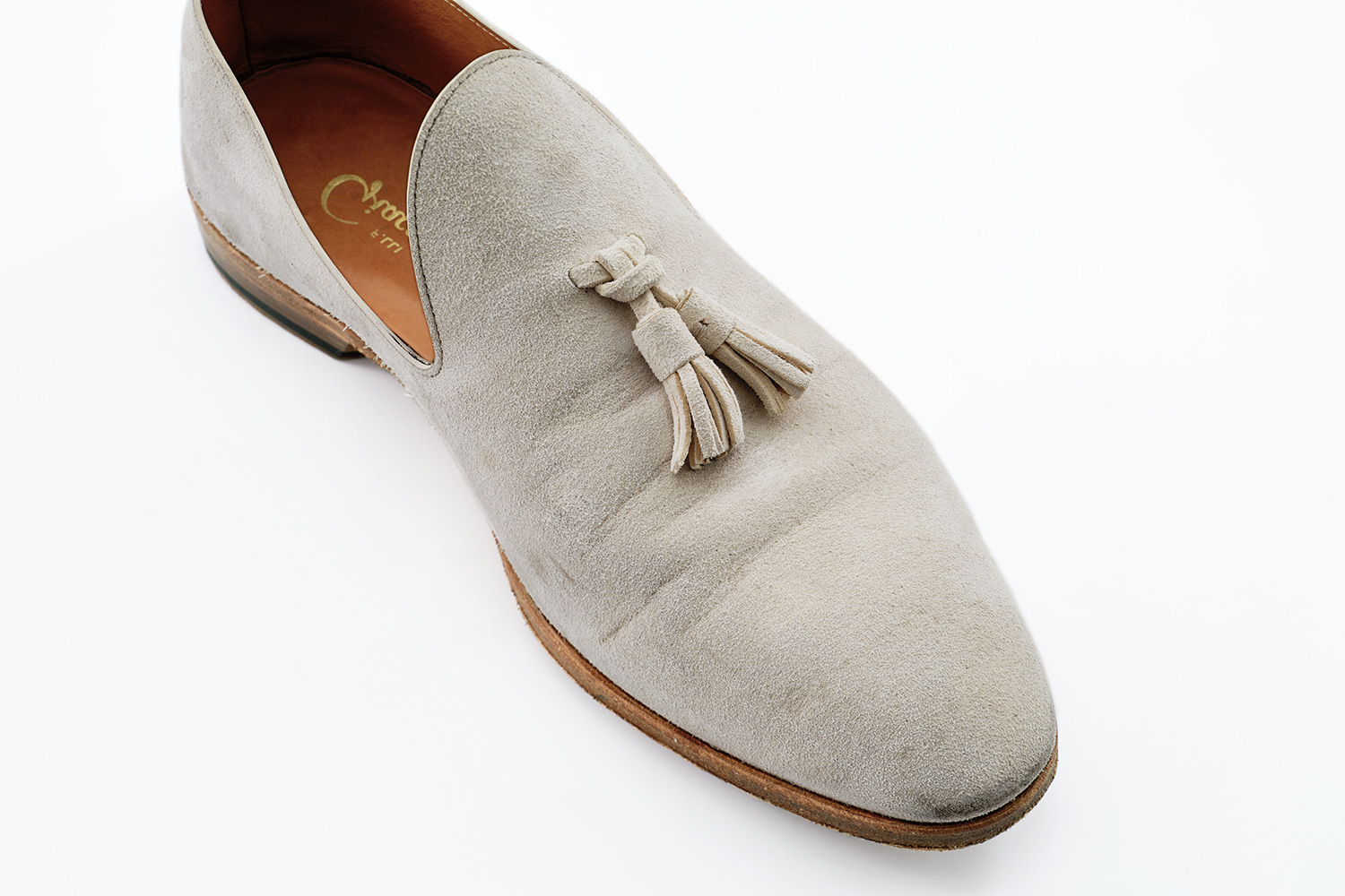 馬革のギン付きスエードを脱色して白くした革です。コーテイング(染めた)した白と異なり、汚れを吸い込みます。汚れを味わいとすることを前提にした革です。日々の着用の中で汚れた雰囲気が気に入っています。ボロネーゼ製法の履き心地も柔らかく快適ですが、地面が近いので長距離を歩くときは選びません。日々の手入れは着用5-6回で防水スプレーです。