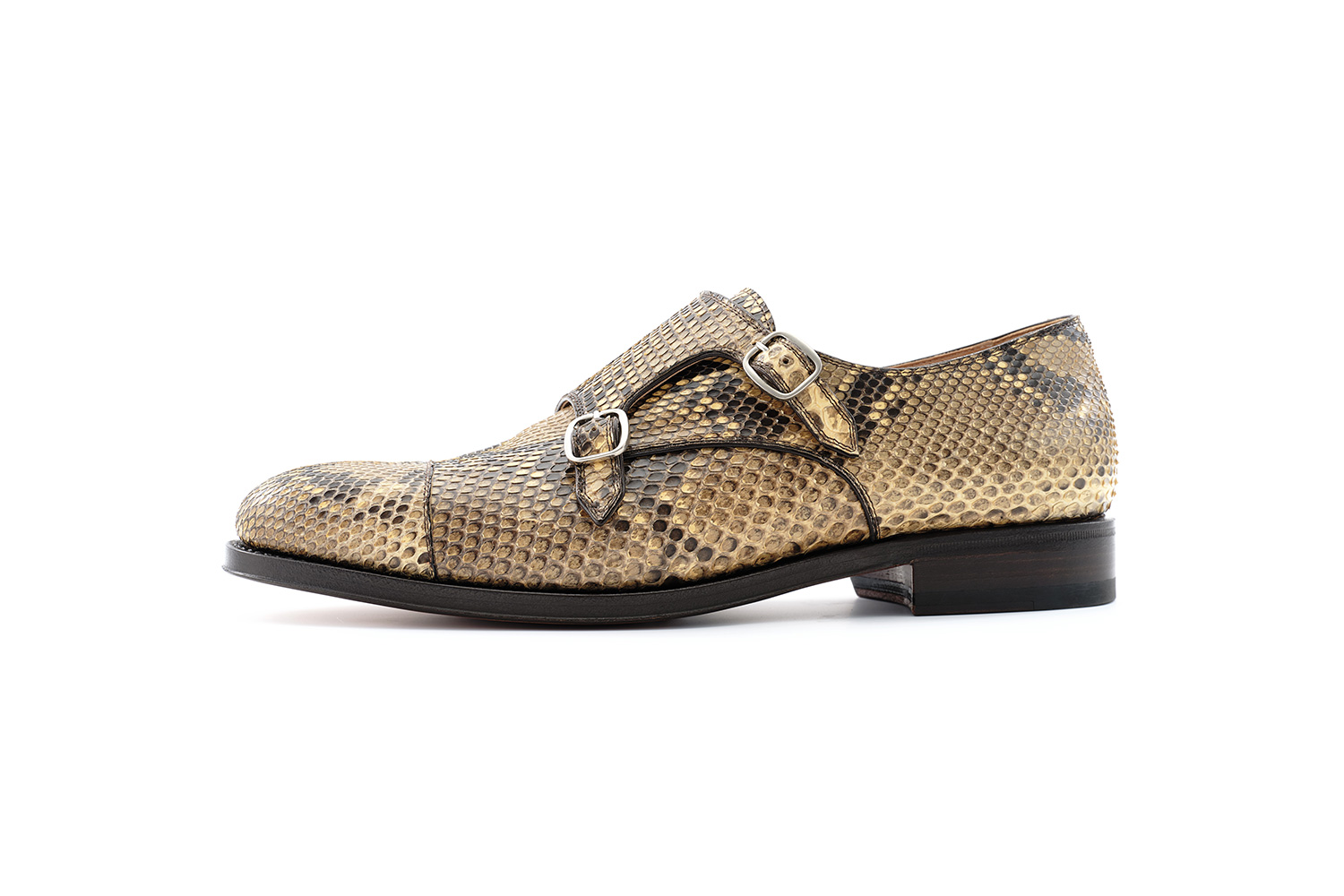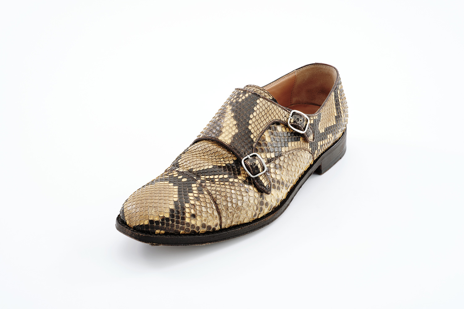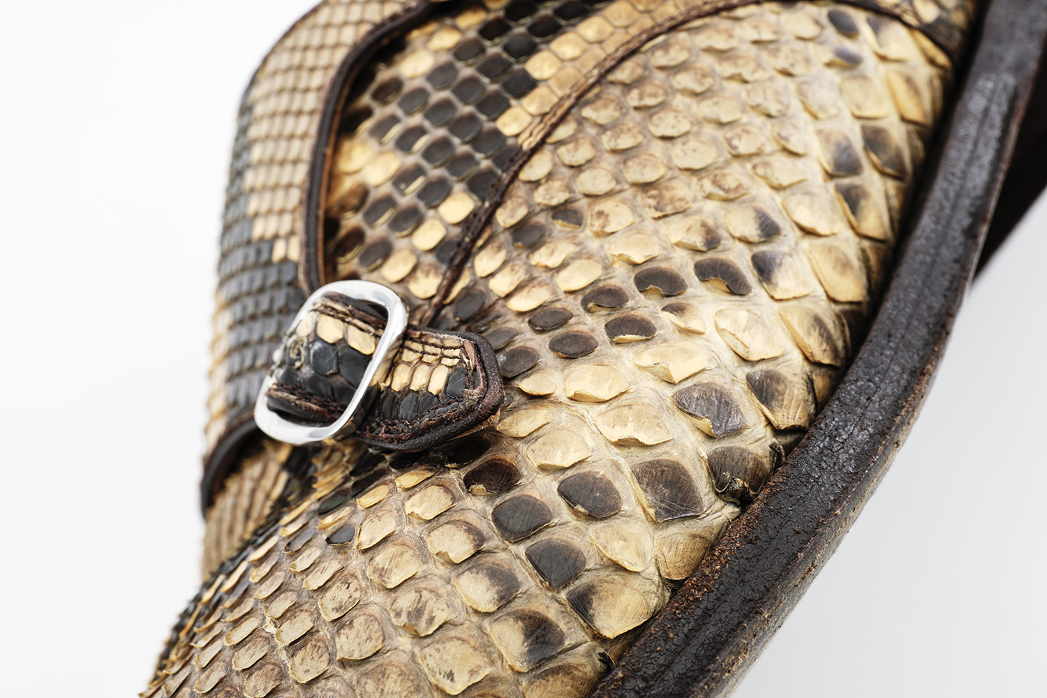 高い技術を有した職人が手裁断で柄合わせしたダイヤモンドパイソン。雨の日でも履いていますが、水染みはできていません。鱗の先は捲れてきますが剝がれることはありません。牛革と同じく屈曲部は裂けてくると思いますが牛革より柔らかく、同等の強度と言われます。特にメンテナンスはしていません。服を着た後で困った時に便利な一足です。