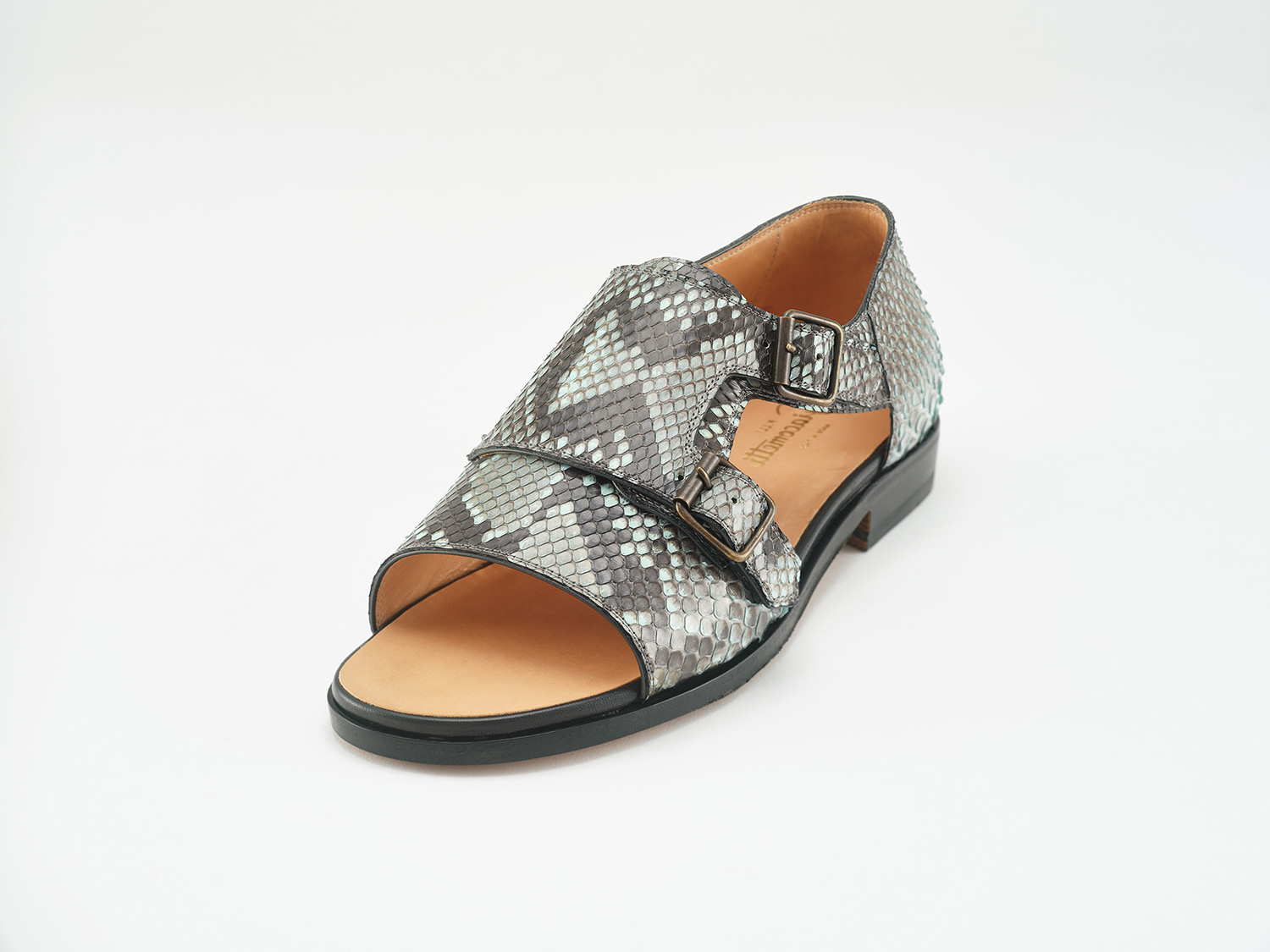 ダイヤモンドパイソンの背面の柄を活かしたダブルモンクサンダル。同じ柄が存在しない3-5mのヘビ革を熟練した職人が一足の仕上がりが揃うように手裁断しています。