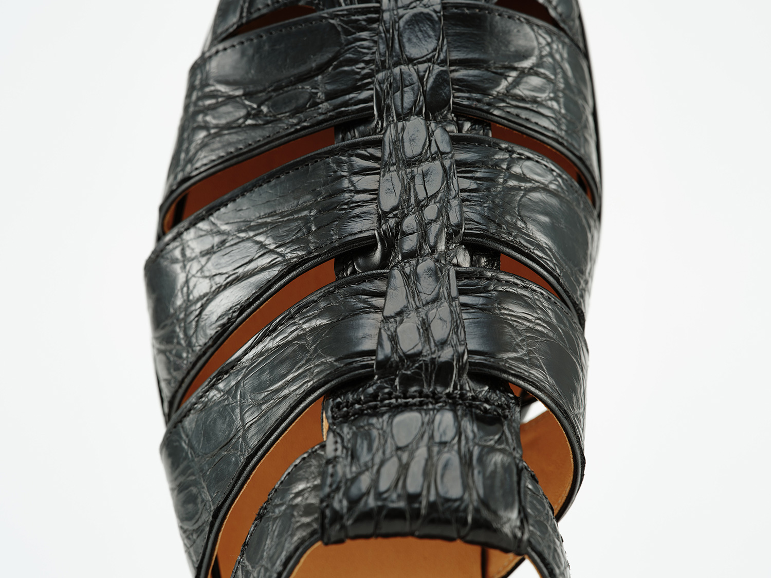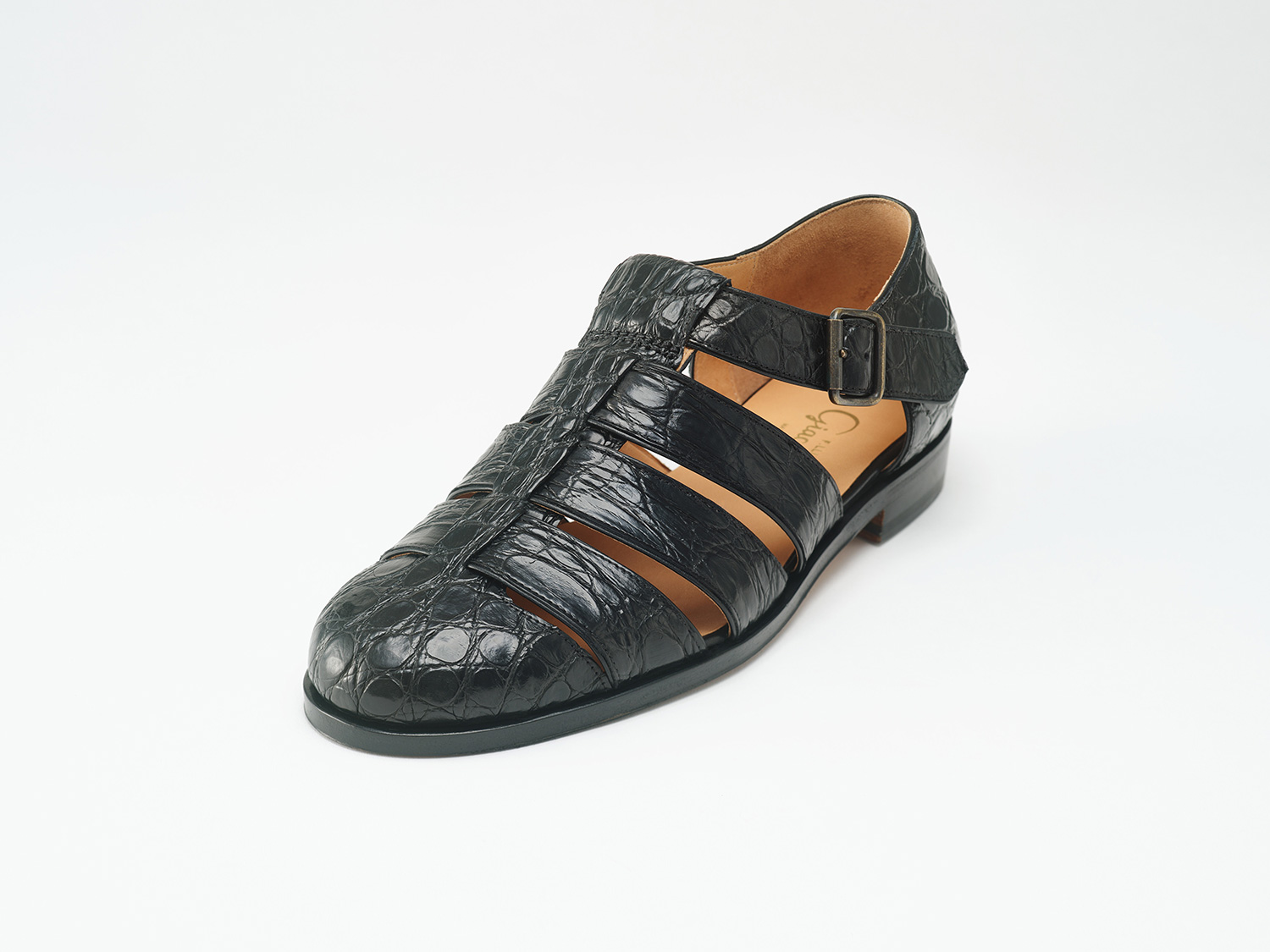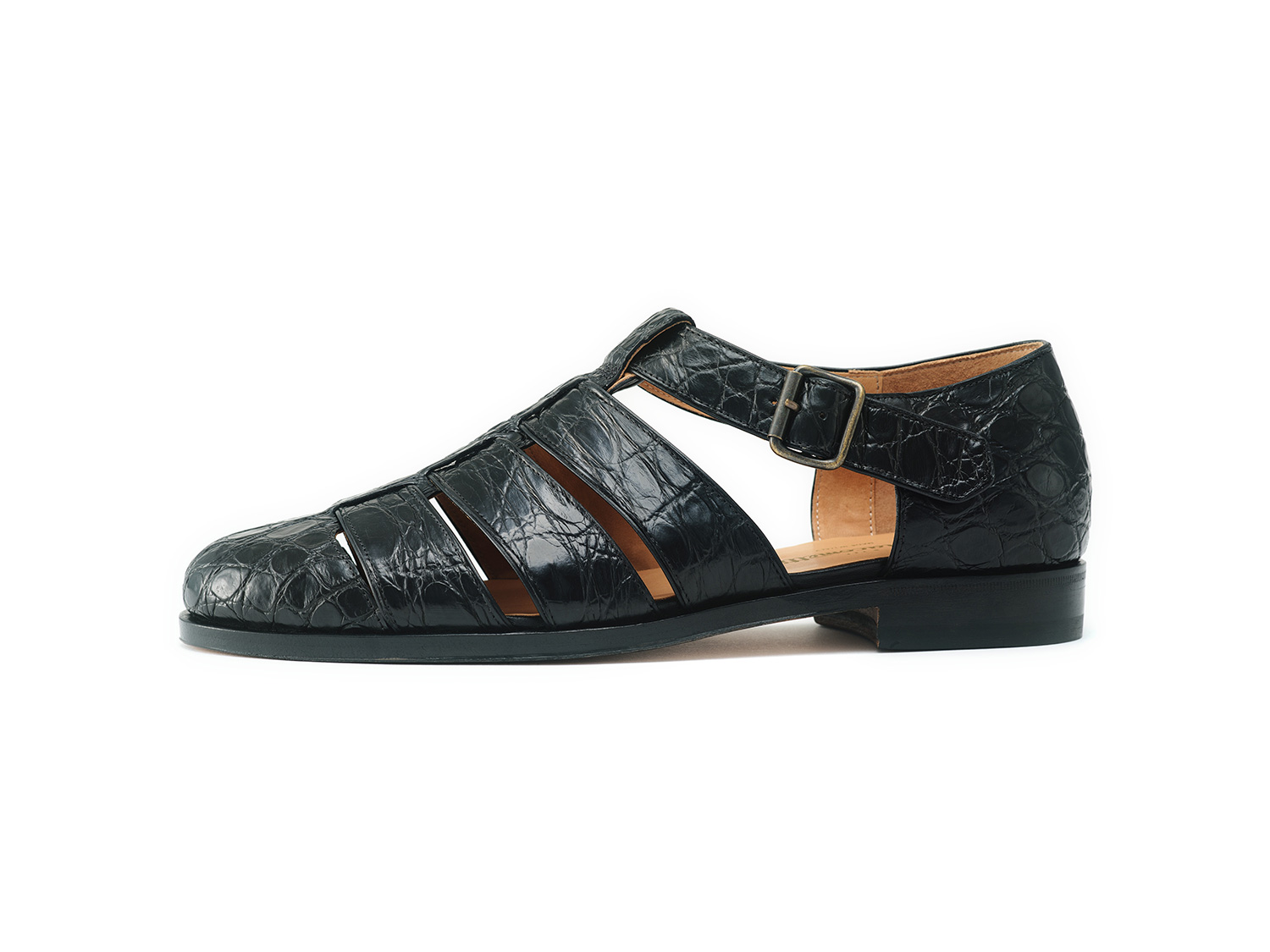 現代のToe closed sandalの先駆けとして発表して20年。カイマンワニの脇腹を用いたグルカサンダル。カイマンワニの腹面は石灰質が溜まりやすいために脇腹の丸斑部分を主に用います。1頭から1足、グルカサンダルに適した革の形状です。