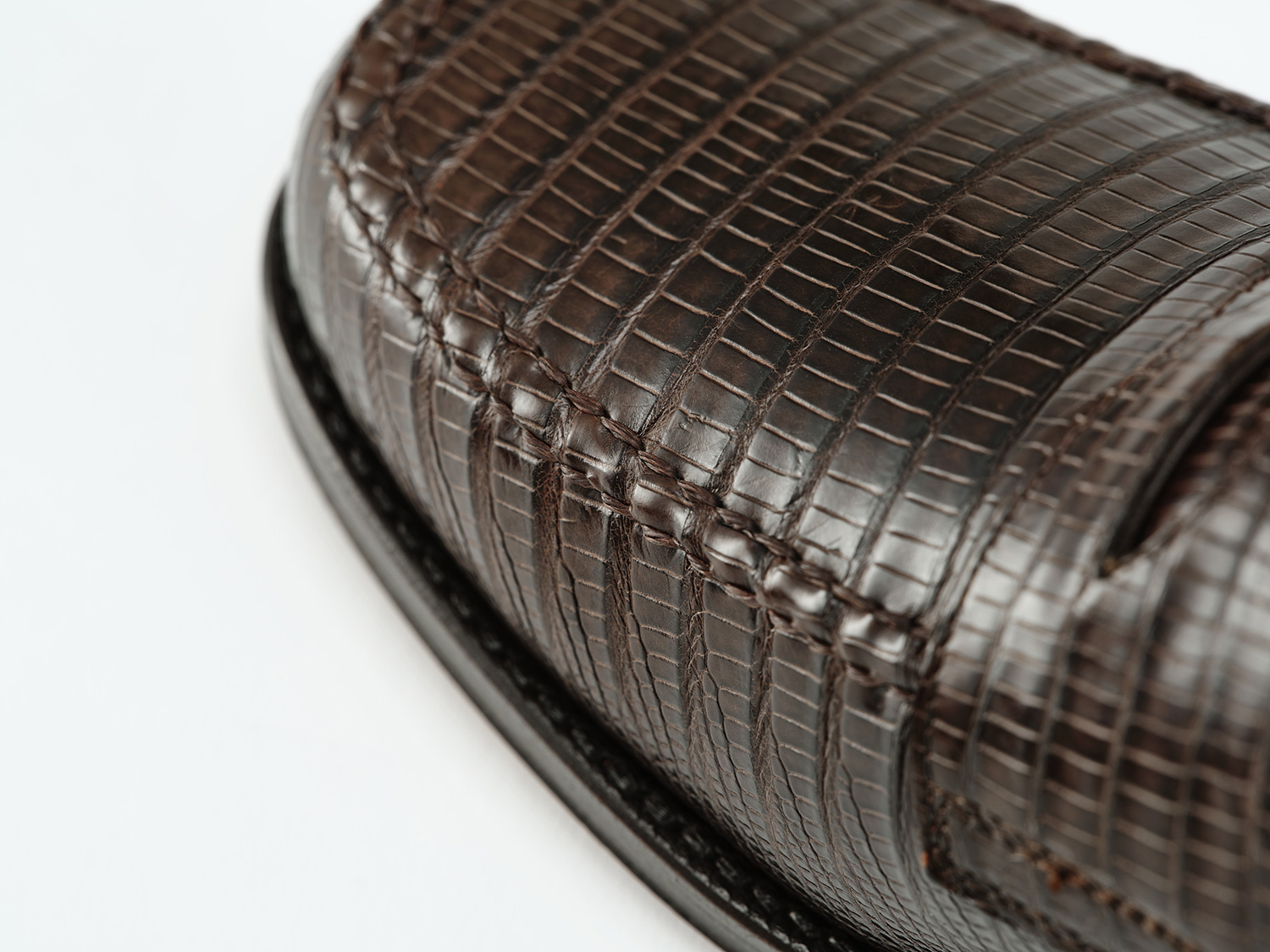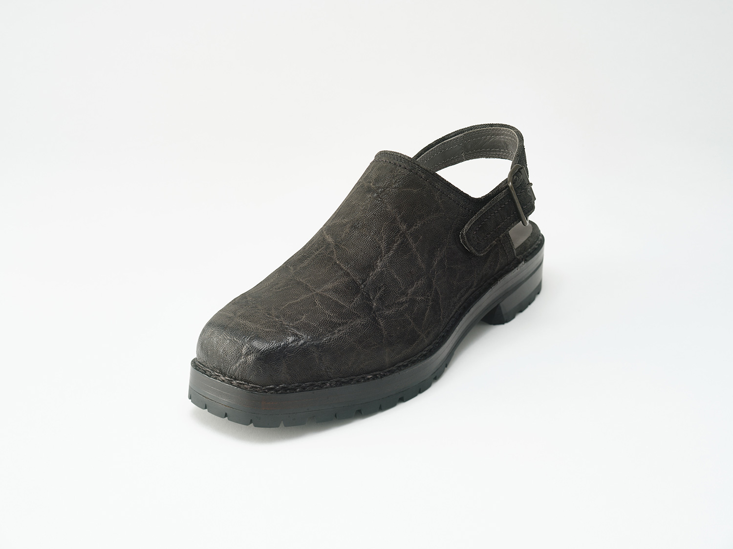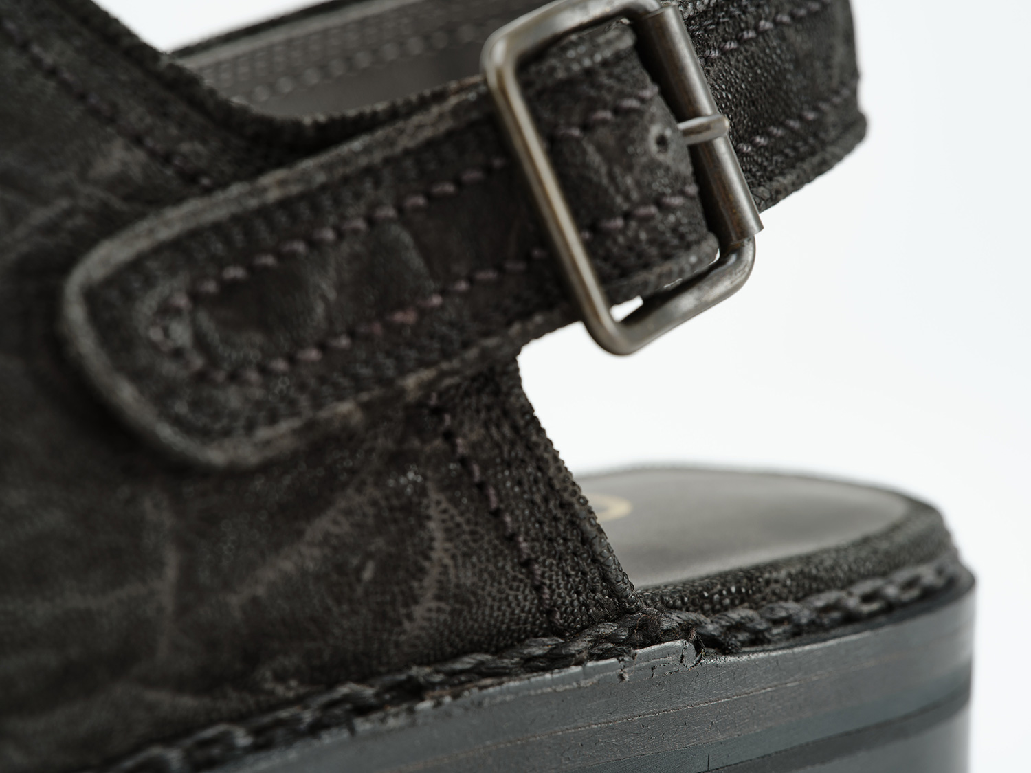 現代のToe closed sandalの先駆けとして発表して20年。カイマンワニの脇腹を用いたグルカサンダル。カイマンワニの腹面は石灰質が溜まりやすいために脇腹の丸斑部分を主に用います。1頭から1足、グルカサンダルに適した革の形状です。