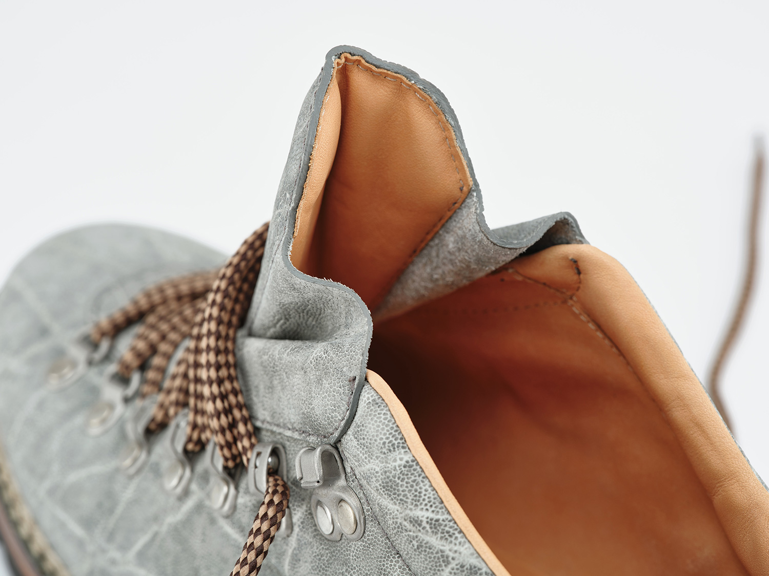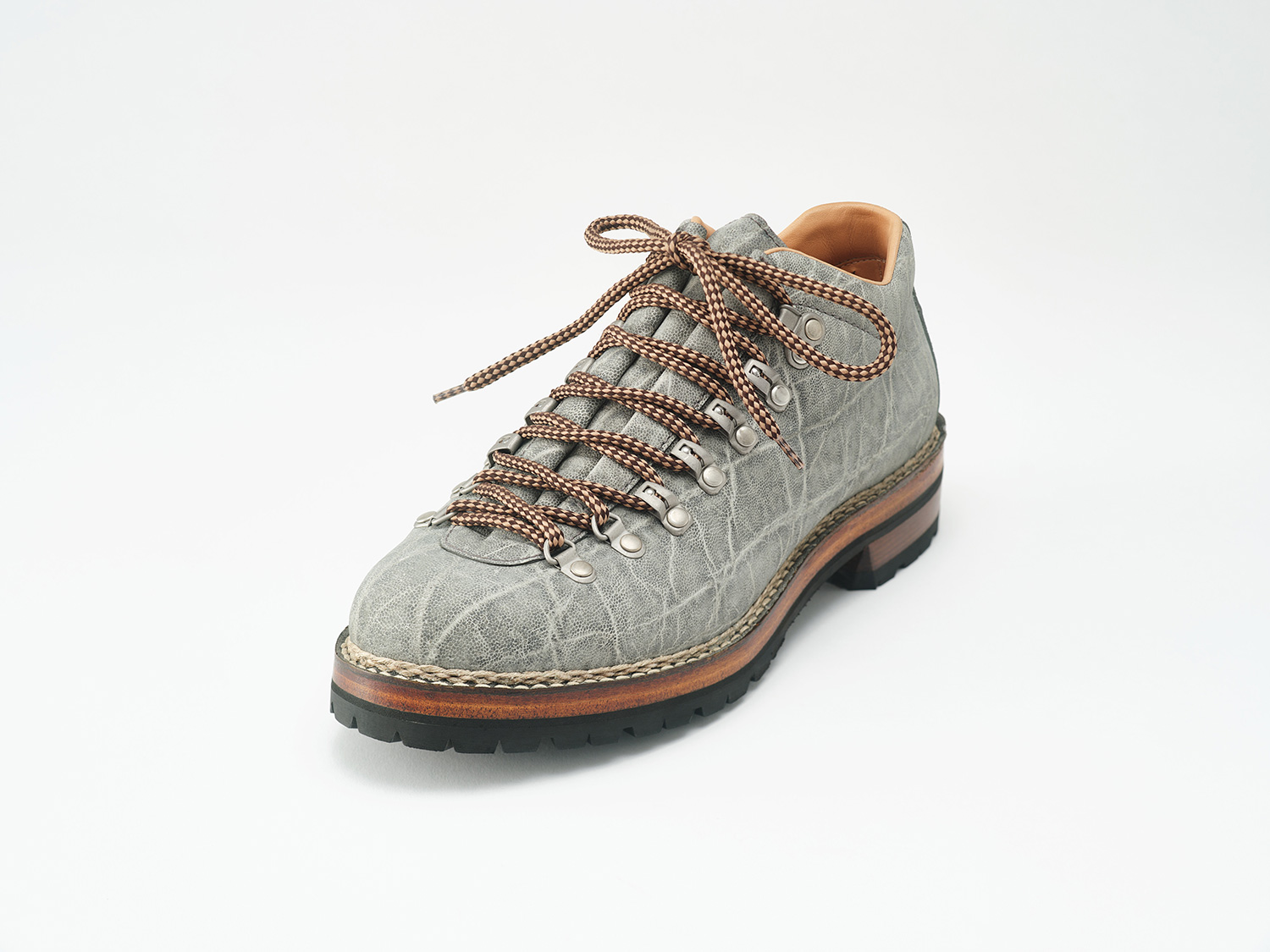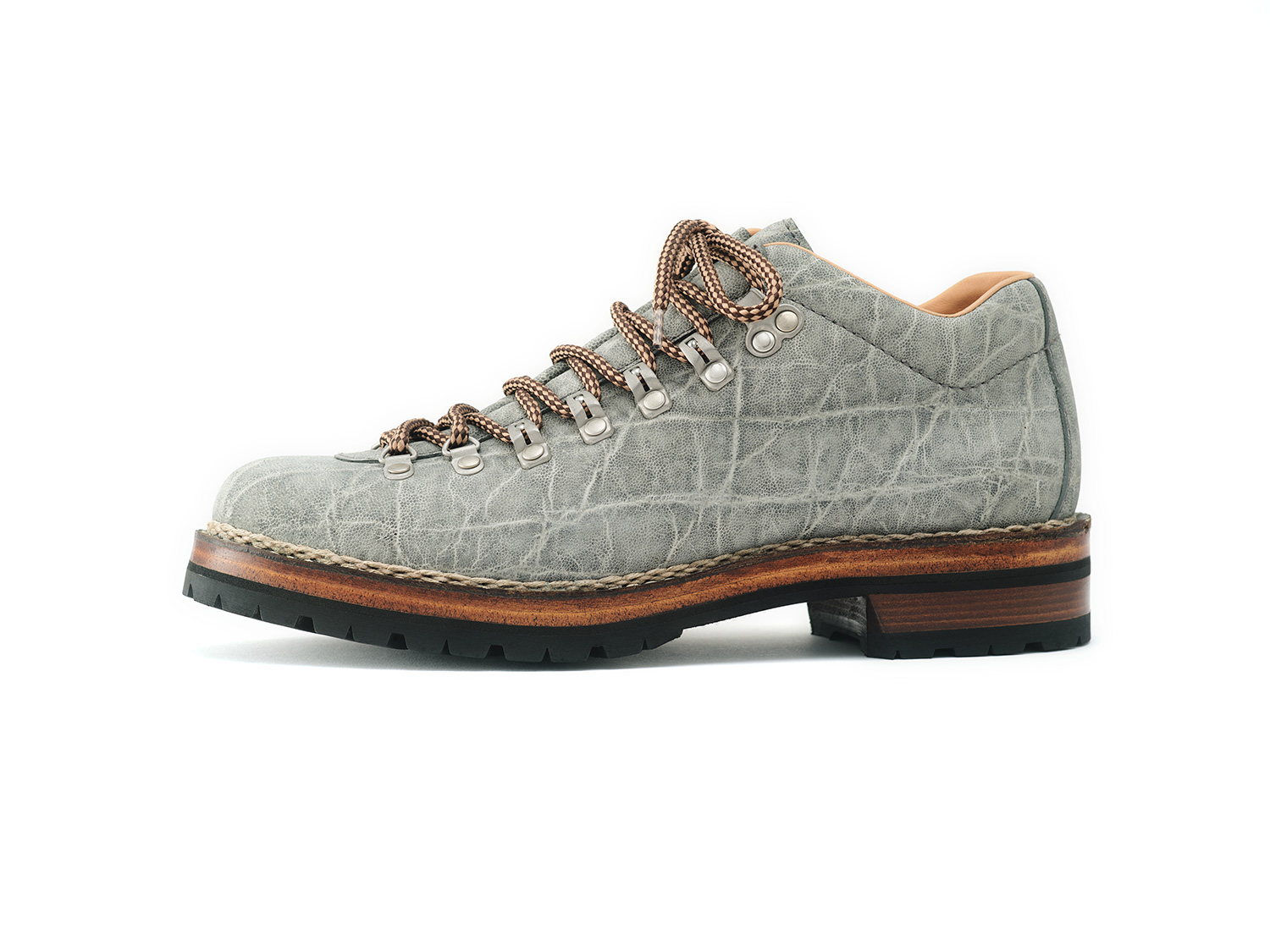 F.LLI Giacomettiの街履き山靴スタイルらしい水掻きベロを採用したMID CUTトレッキングシューズデザイン。木型はMARMOLADAをベースに甲から踵をシューズ設計にしたMARMOLADA SC。アフリカの国立公園内で生態系維持のために頭数制限された個体の革を使用しています。