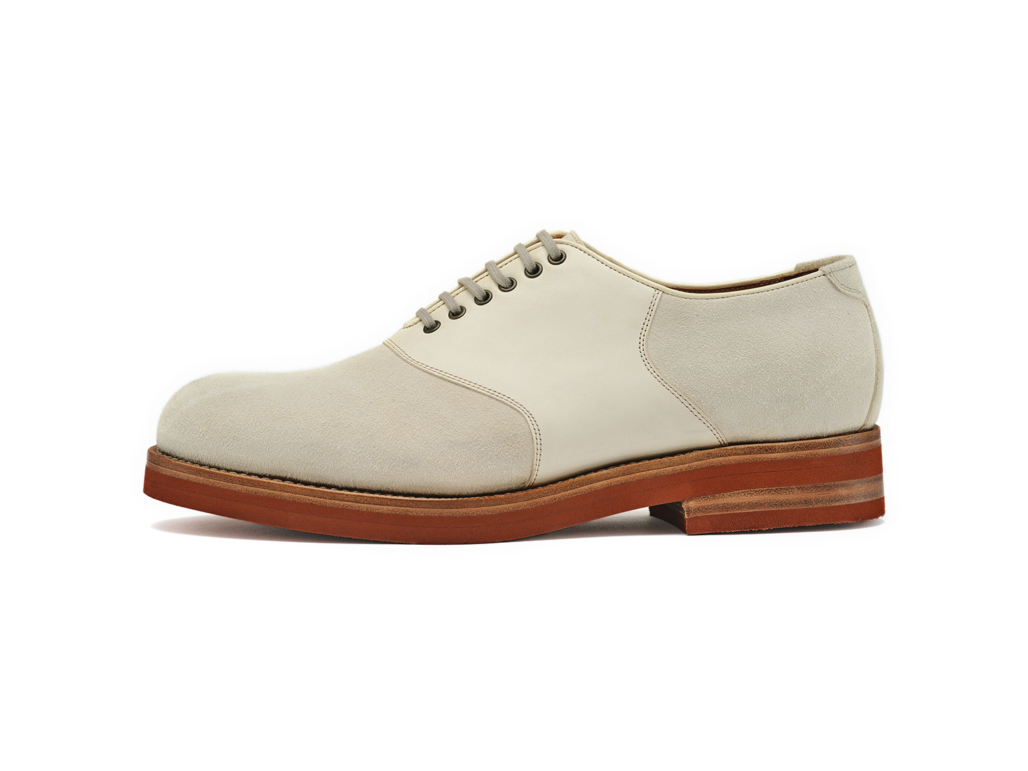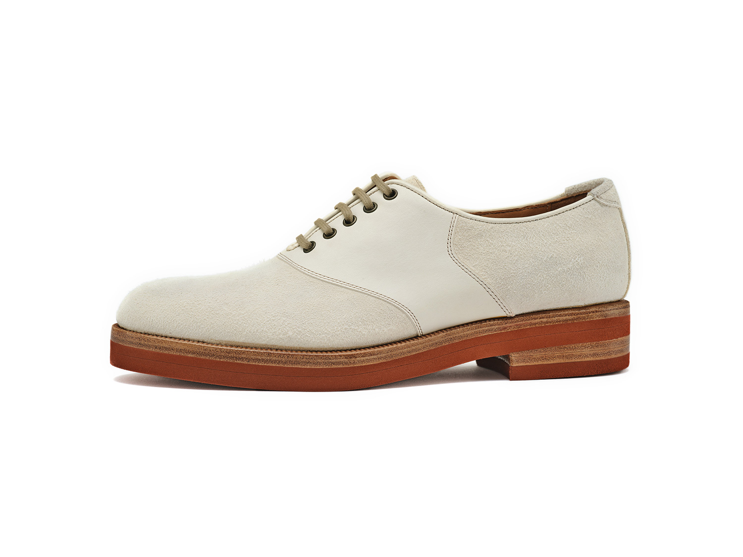 白鞣し/脱色した馬革のギン面とスエード面を使ったサドルオックスフォード。ワイルドな馬革の表情と染色した白には無い自然なサーフェイスがヴィンテージシューズのような仕上がりです。