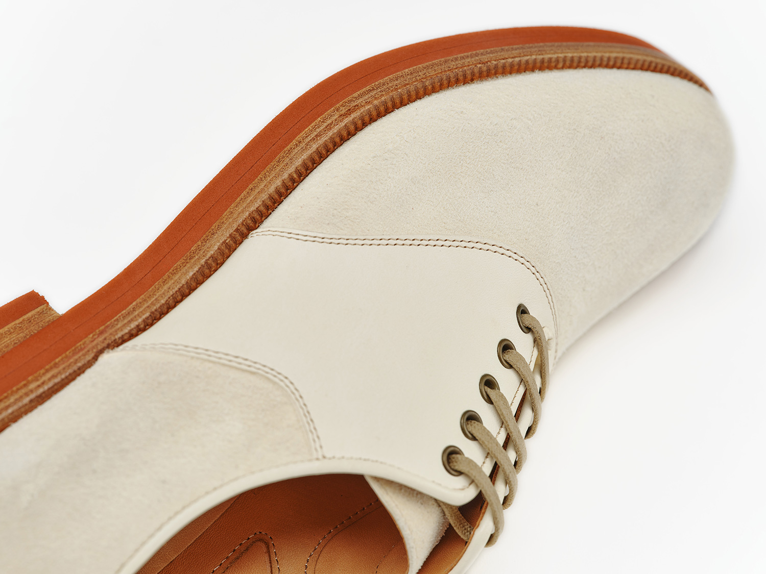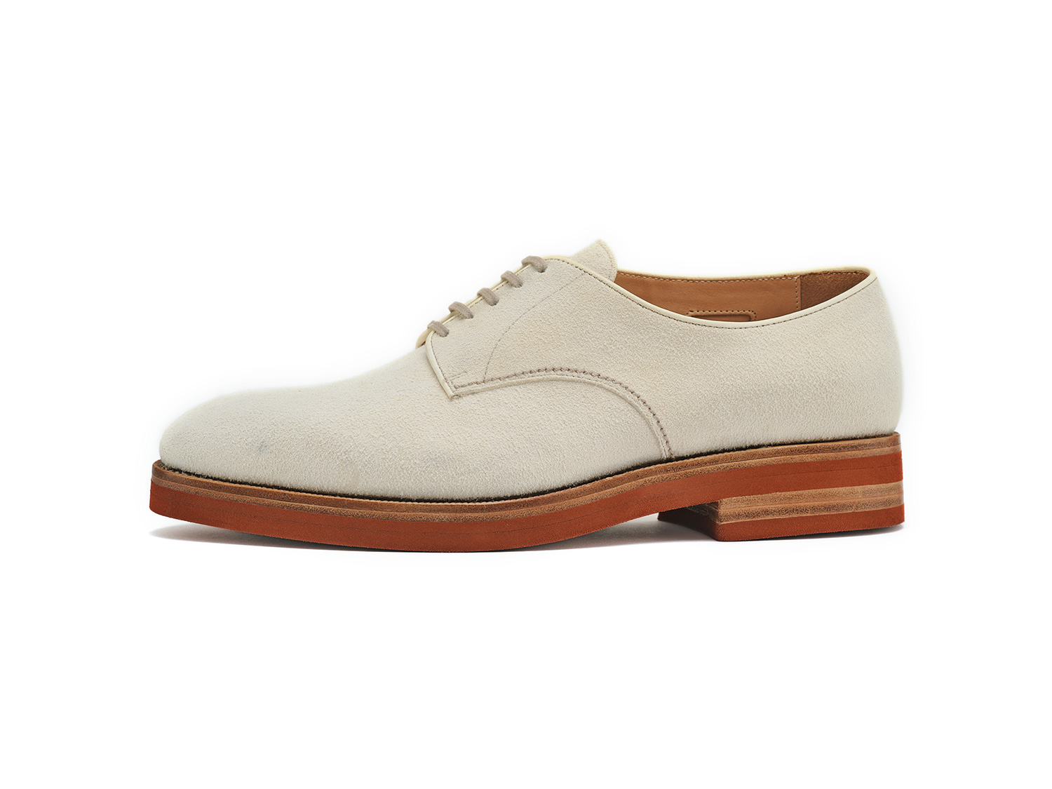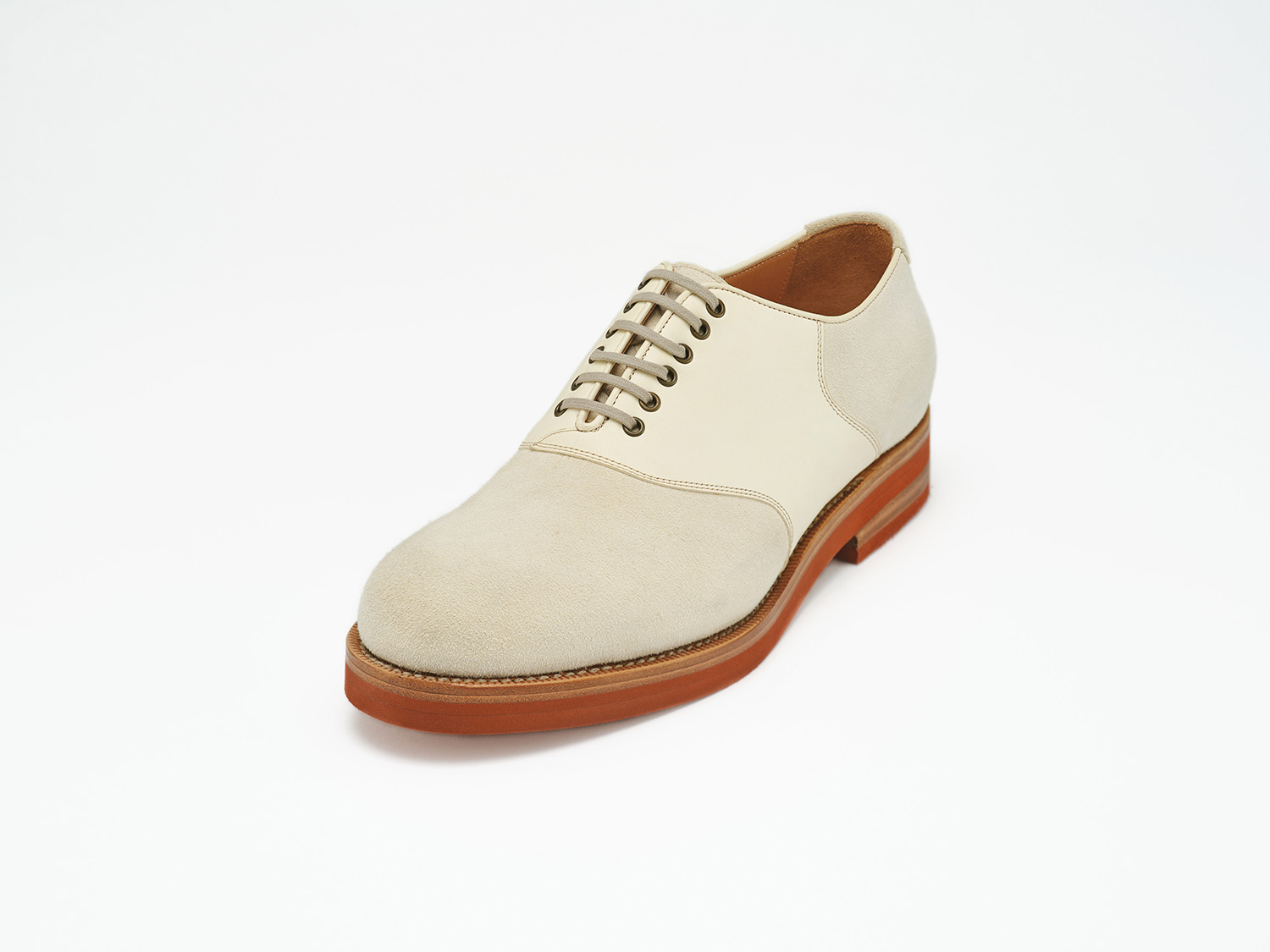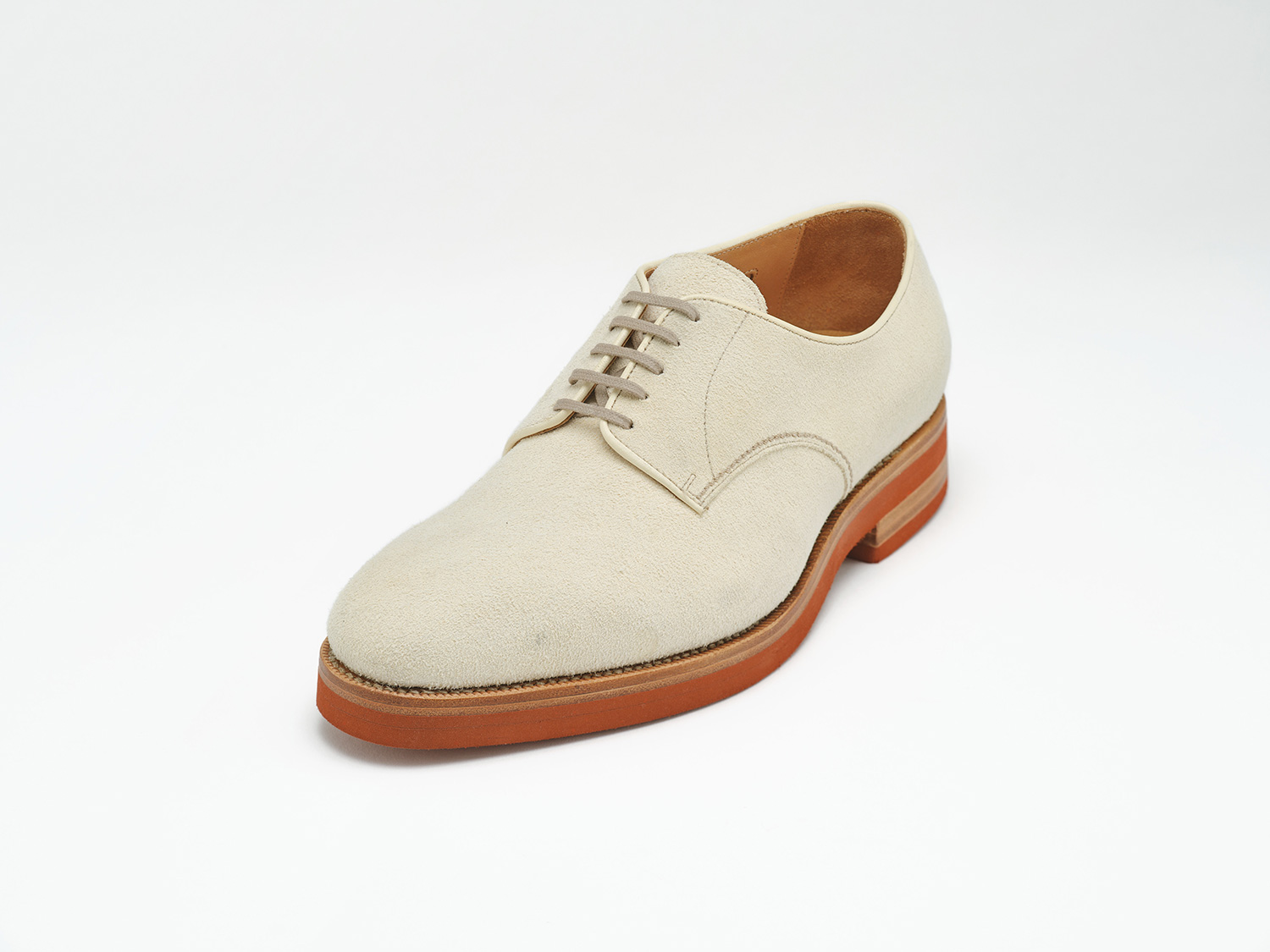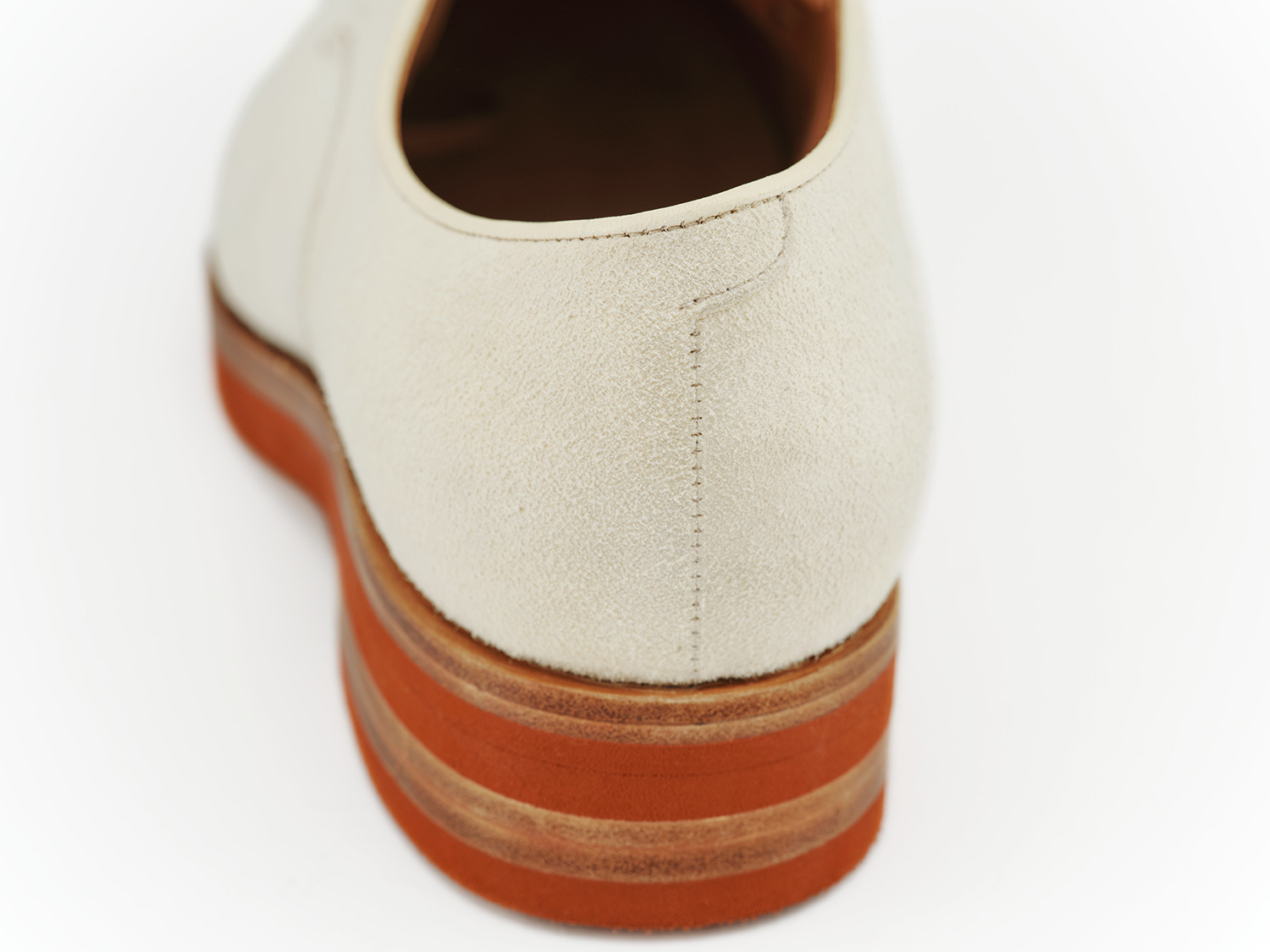 エジプト型、ギリシャ型の足に合うオブリークトゥのブーツ木型。馬革の白鞣し/脱色した馬革のスエード面と玉縁にギン面を使ったホワイトバックス。レンガソールも革の積み上げがハンドメイドシューズの矜持です。