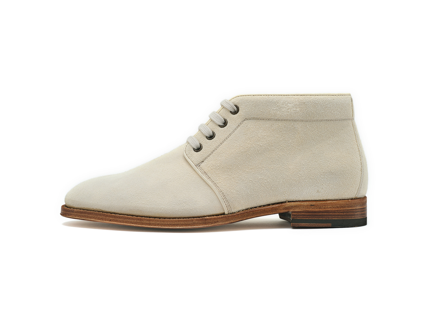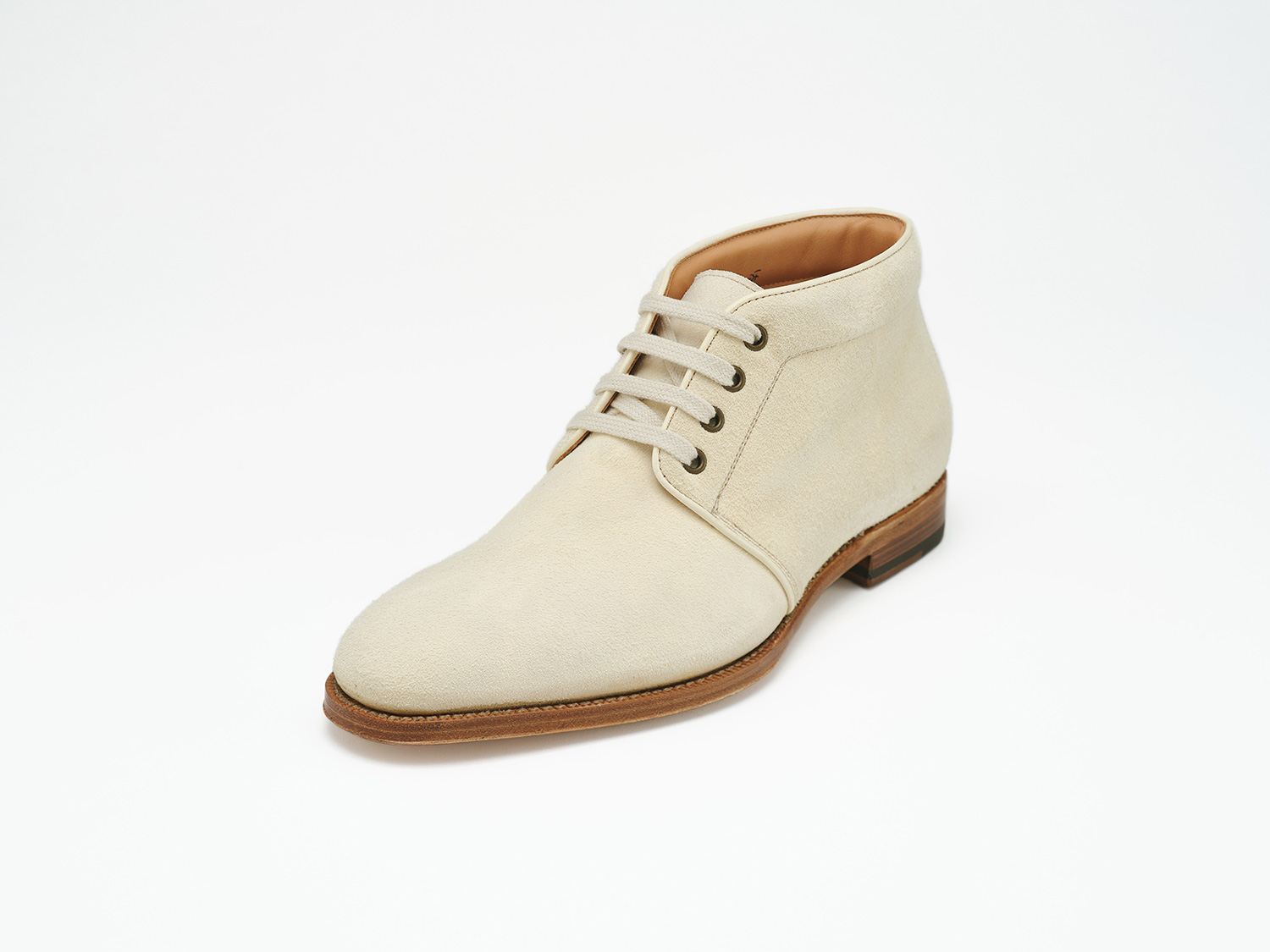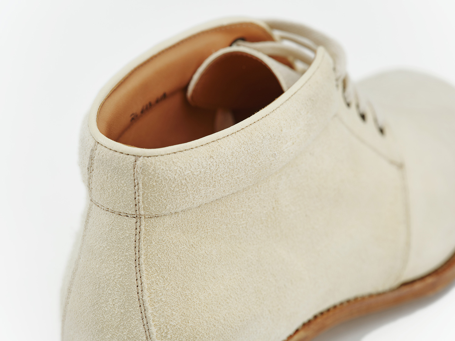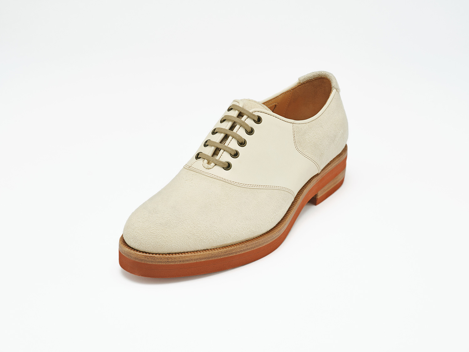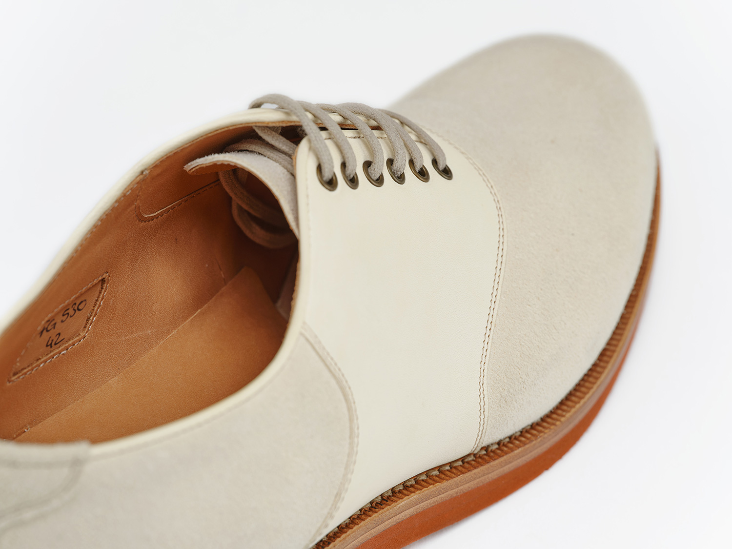 エジプト型、ギリシャ型の足に合うオブリークトゥのブーツ木型。馬革の白鞣し/脱色した馬革のスエード面と玉縁にギン面を使ったホワイトバックス。レンガソールも革の積み上げがハンドメイドシューズの矜持です。