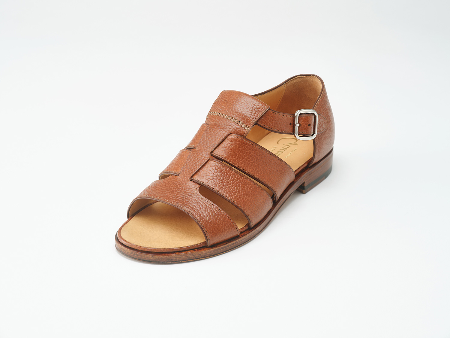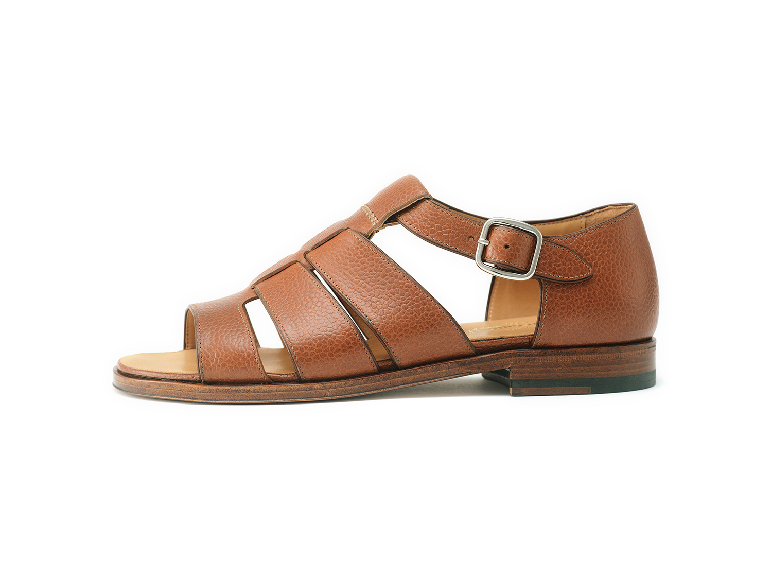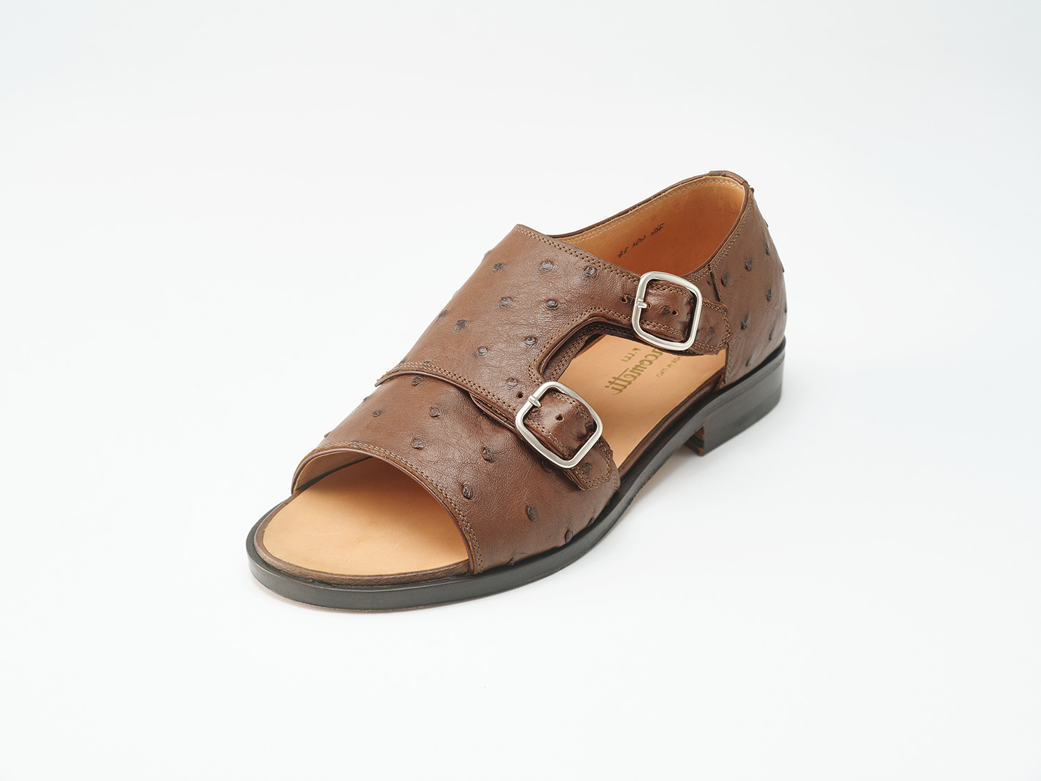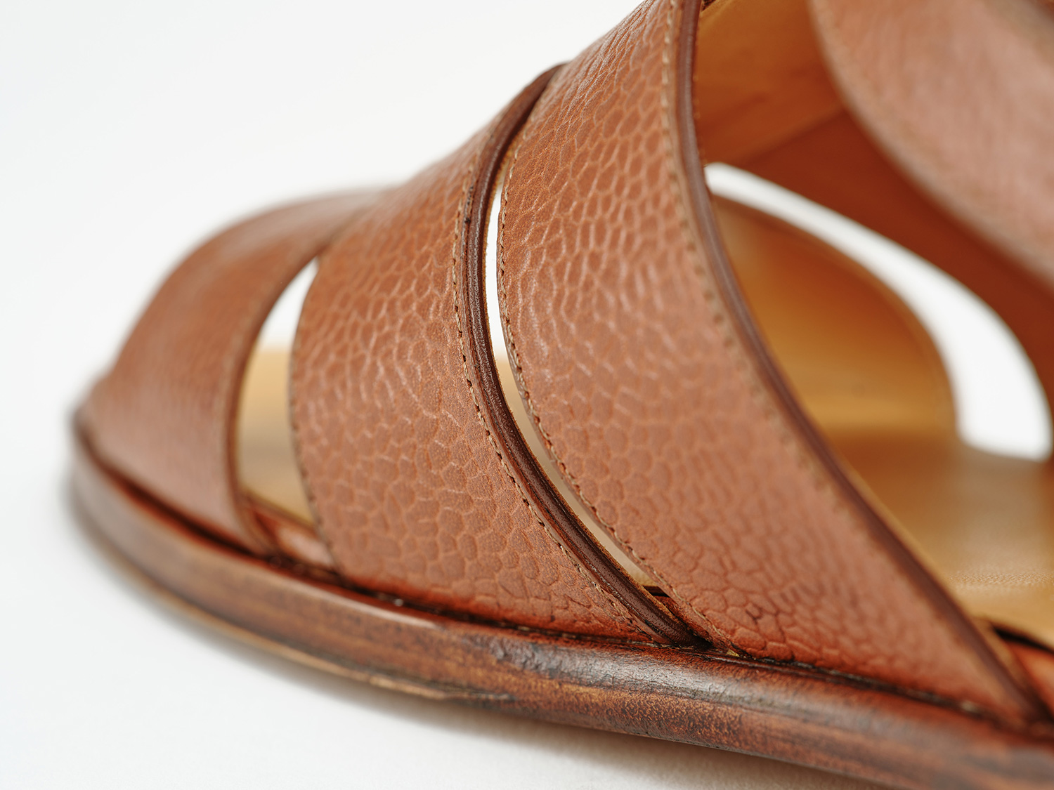 F.LLI GiacomettiのグルカサンダルをOpen toeに改良したモデルです。革の切り口のカンガルー革が伸び止めの役目と共に、仕立て映えにも一役買っています。