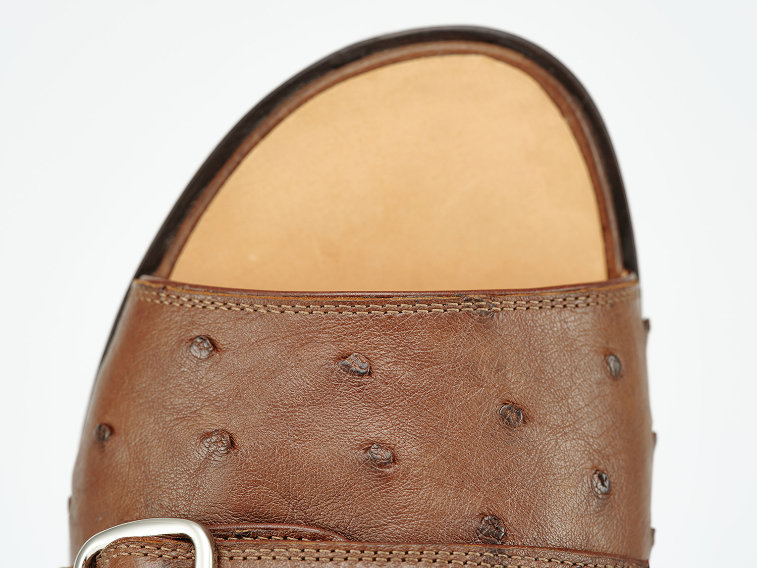 甲にエラスティックを配しロングノーズを強調するスタイルのモンクローファー。長過ぎない捨て寸でバランスを取っています。